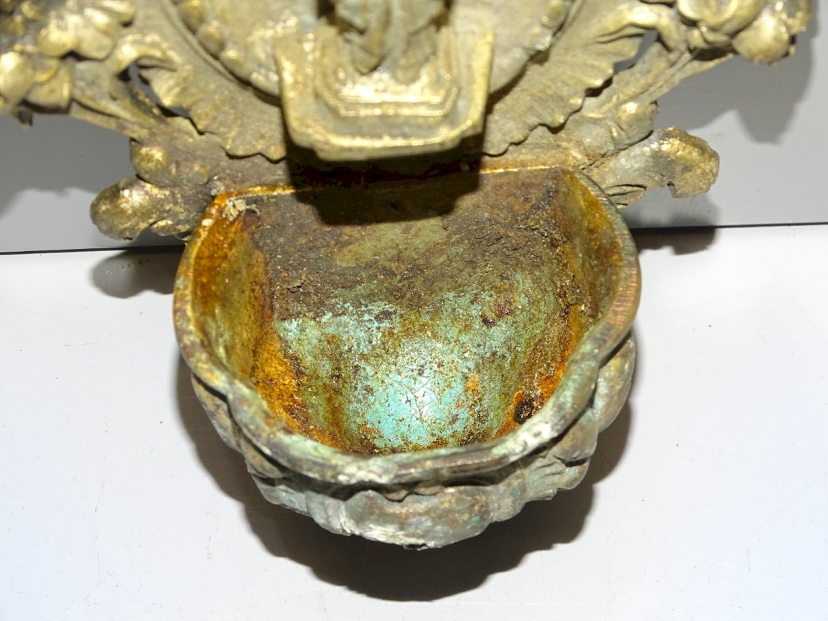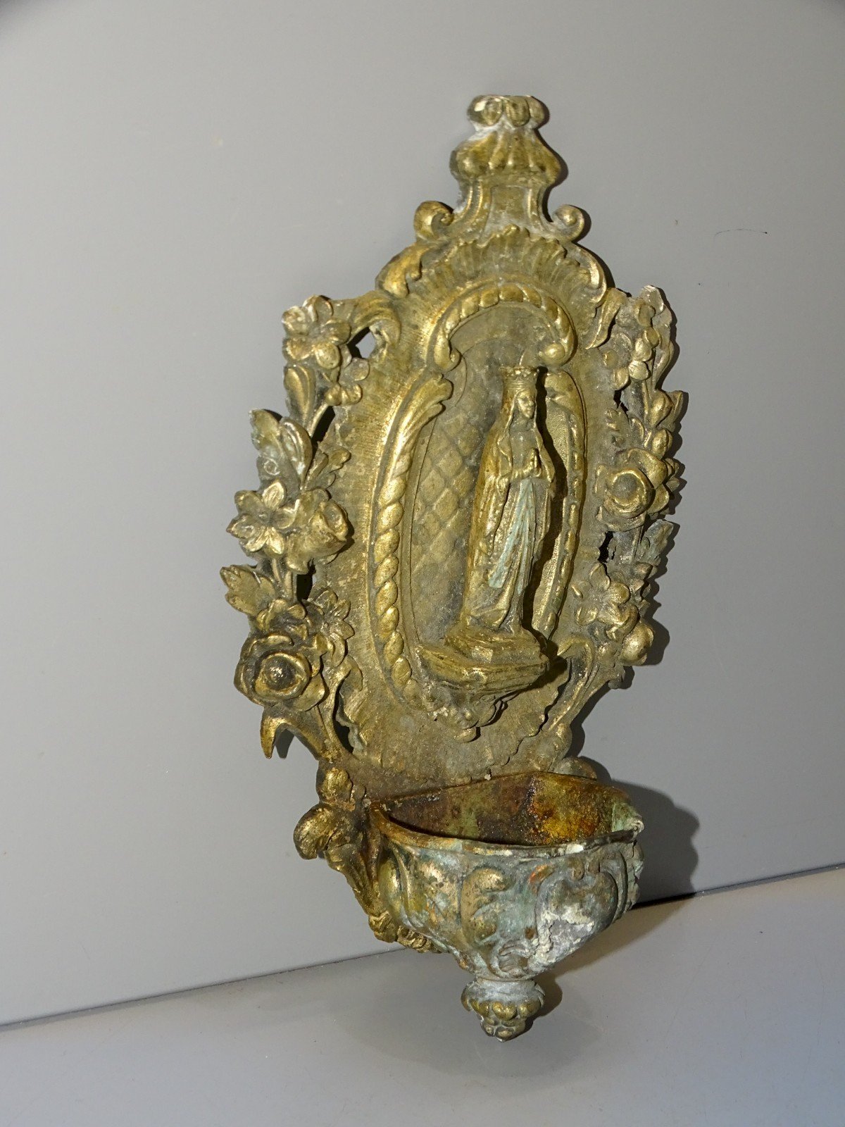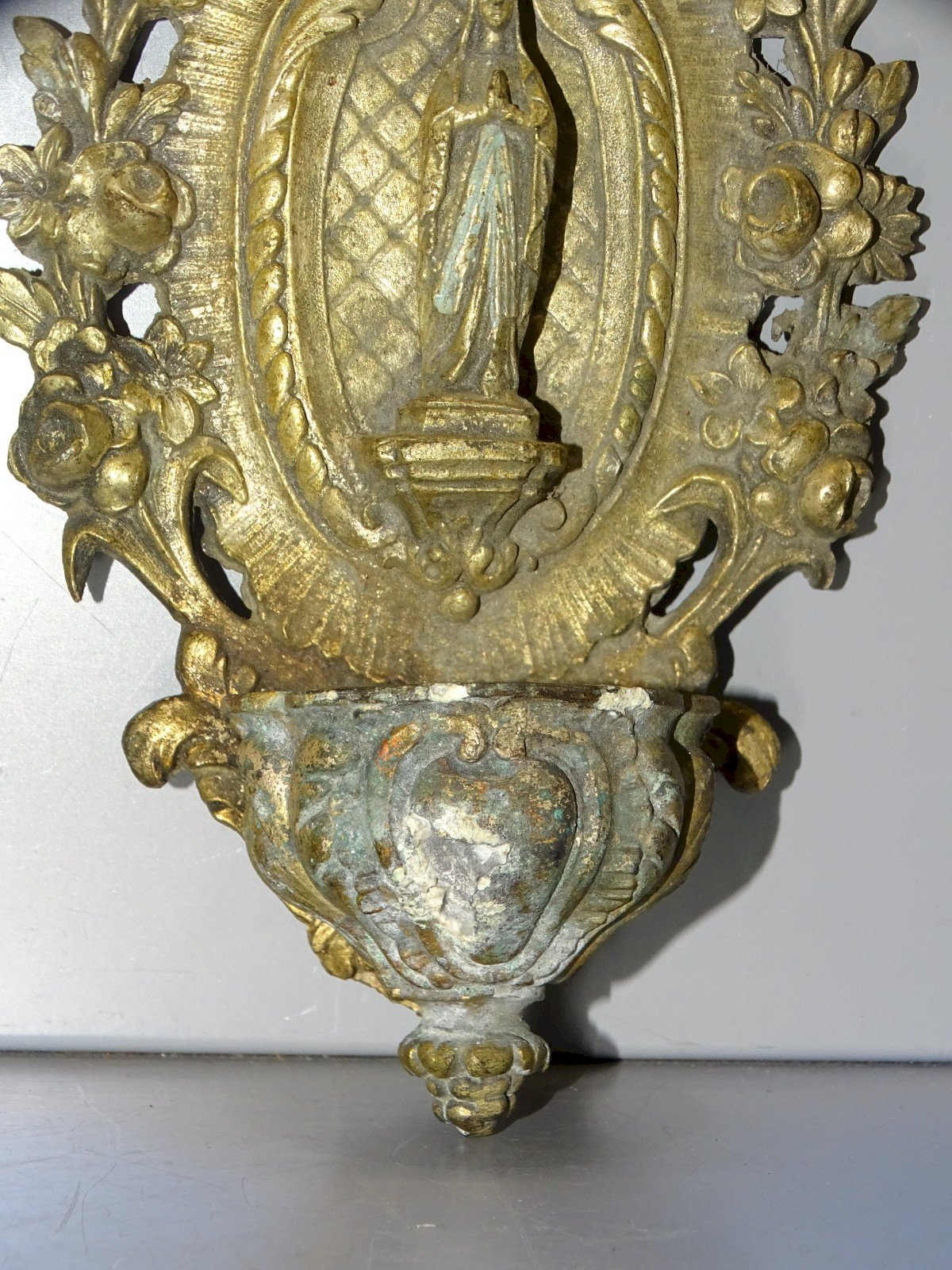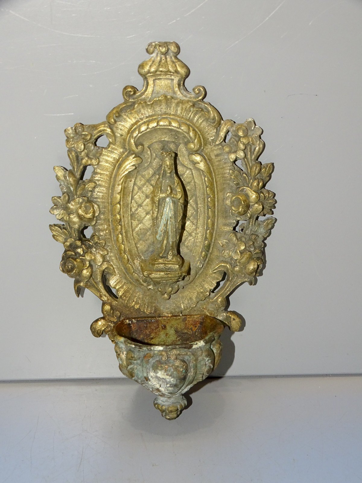 Wall-mounted holy water font in spelter with traces of patina and wear on the font as well as signs of oxidation - missing the wall mount on the back - in its found state, taken from an attic, needs cleaning (see photos) - Ref. 1V240718/336 BIS - Height 17.7 cm - Length 11 cm - Weight 351 g - To contact me, my email address: SHIPPING POSSIBLE THROUGH MONDIAL RELAY or COLISSIMO upon request VERY GOOD PACKAGING GUARANTEED THANK YOU for TAKING A GOOD LOOK AT ALL the PHOTOS as THEY ARE AN INTEGRAL PART of the DESCRIPTION and ALLOW YOU TO SEE the ITEM IN THE BEST WAY with ITS POSSIBLE SMALL DEFECTS - Condition: Used: Item that has been used. Please consult the seller's description for more details... Used: Item that has been used. any possible imperfections. Type: Christianity Subtype: Holy water font Country of origin: France Material: Spelter