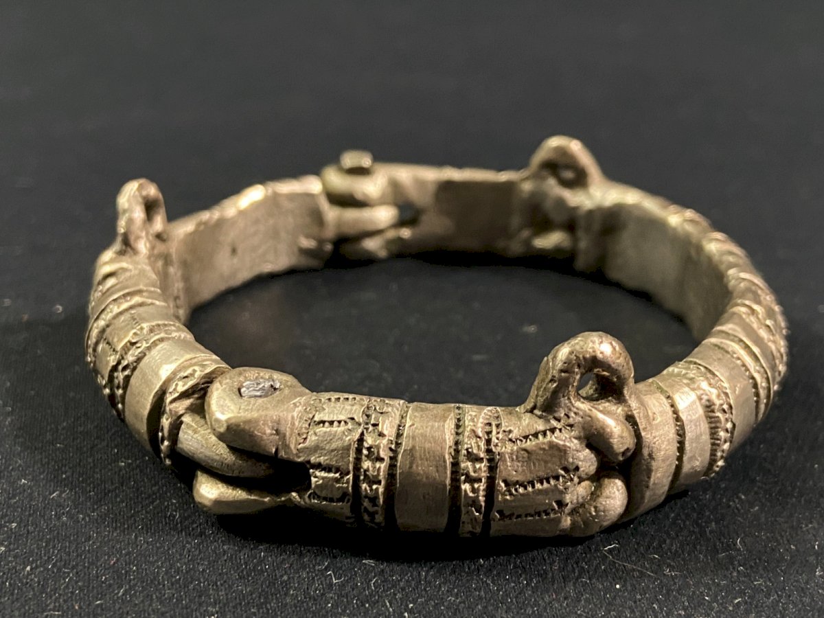 Superb antique rigid bracelet made of lost-wax cast bronze, featuring stylized geometric patterns. The decoration alternates between bands and ornamental reliefs. An authentic piece of Akan/Ashanti tradition (Ghana – Côte d’Ivoire), forged in the first half of the 20th century. Matte silver patina, typical of ancient African castings. Dimensions: Diameter 7.2 cm / inner diameter 5.8 cm Weight: 106 grams Condition: very good condition, original patina, beautiful artisanal casting. Tribal art and ethnographic object. VERY careful shipping worldwide Materials from: Ghana Authenticity: Original Type: Jewelry Origin: Africa Material: Bronze