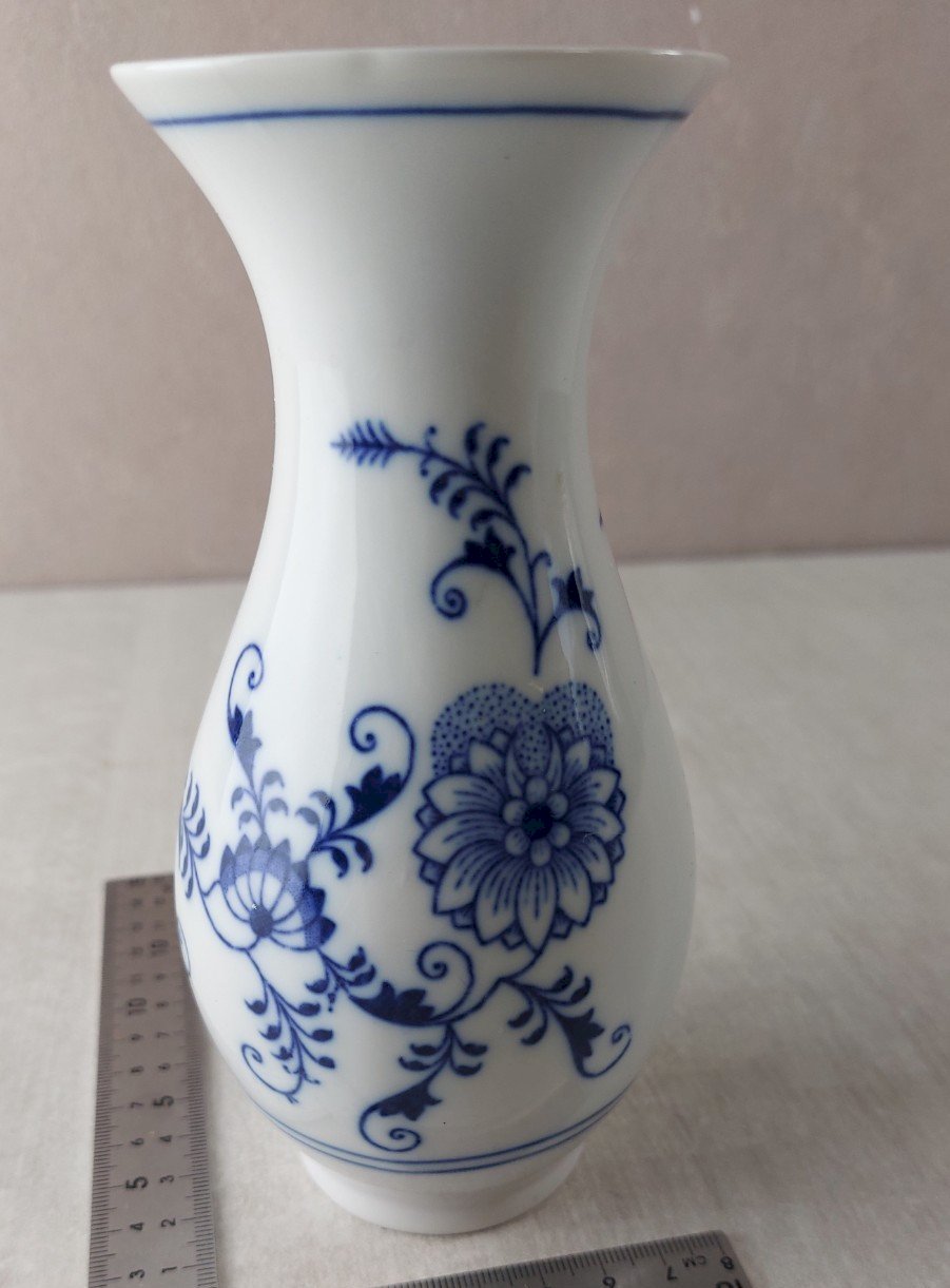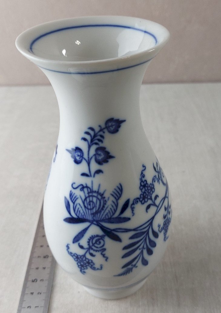 Old vase, Blue Onion decoration / onion flowers / Zwiebelmuster, made of porcelain from Czechoslovakia / Czech, Meissen style in good condition, no cracks or chips, maximum diameter 8 cm, height with lid 16.5 cm, see photos. Check out my other items! Discount on shipping costs for combined purchases.