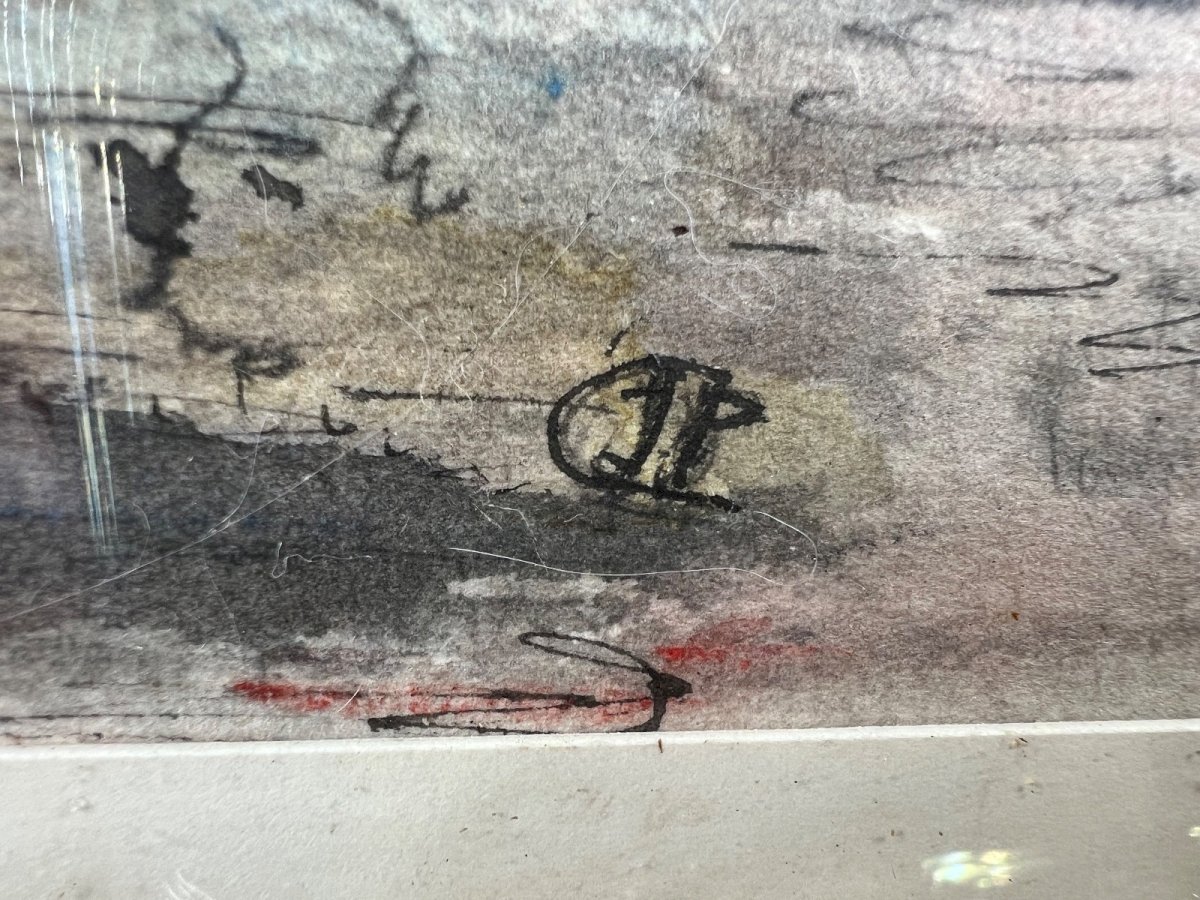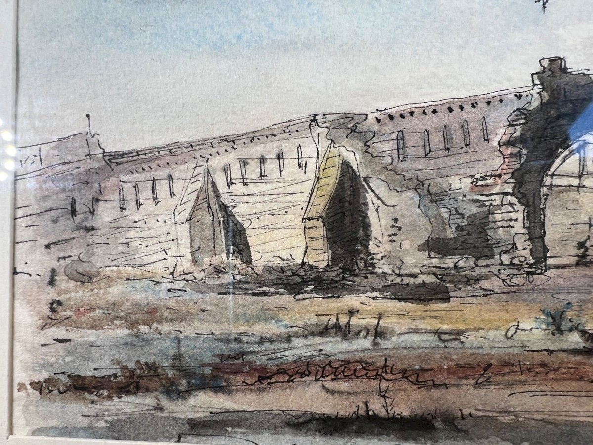 Stunning old watercolor depicting the majestic ruins of a Gothic abbey, set under a calm stormy sky where a few birds soar. The gaze rests on a large collapsed nave, pierced by arches and pointed windows, remnants of a glorious monastic past. The whole irresistibly evokes the ruins of the Abbey of Marmoutier in Tours — this Benedictine landmark founded by Saint Martin in the 4th century, whose remains have inspired so many Romantic artists of the 19th century. The composition, characterized by great finesse, mixes ink drawing and watercolor wash, capturing the diffuse light of an autumn afternoon. The monogram "JP" affixed in the lower right corner indicates a skilled hand, sensitive to decaying architectures and landscapes imbued with spirituality. Characteristics: Technique: Ink and watercolor on paper Signature: Monogram "JP" in the lower right corner Subject: Ruins of Gothic abbey (possibly Marmoutier in Tours) Period: 19th century Dimensions of the drawing: 22 × 30 cm (8.66 × 11.81 in) Frame: Antique gilded wooden frame with mat Condition: Very good overall condition, slight signs of time on the frame Provenance: Private French collection A romantic evocation of the past This work, steeped in silence and golden dust, embodies the 19th century fascination with Gothic ruins and the spiritual memory of forgotten places. Type: Watercolor Artistic movement: French school Country of origin: France Genre: Classicism Features: Framed, Signed Theme: Architecture