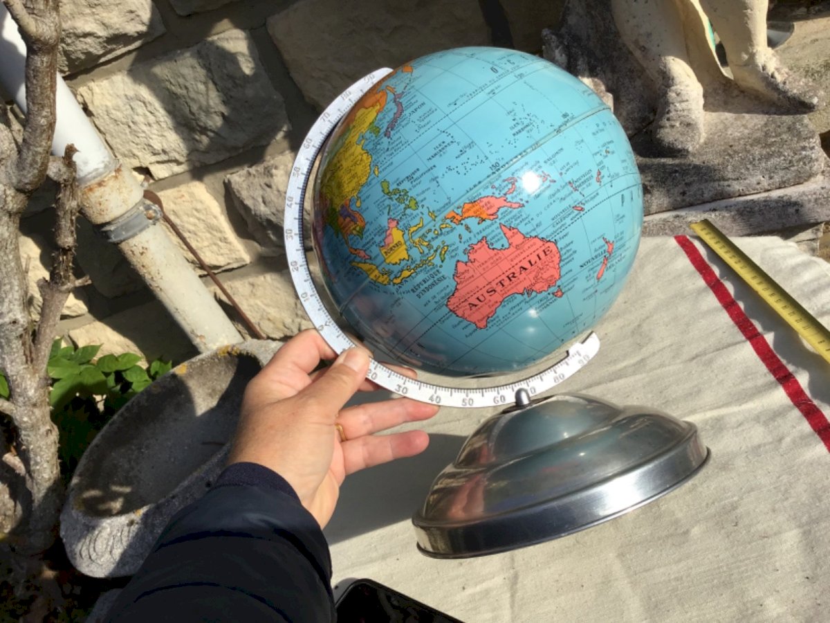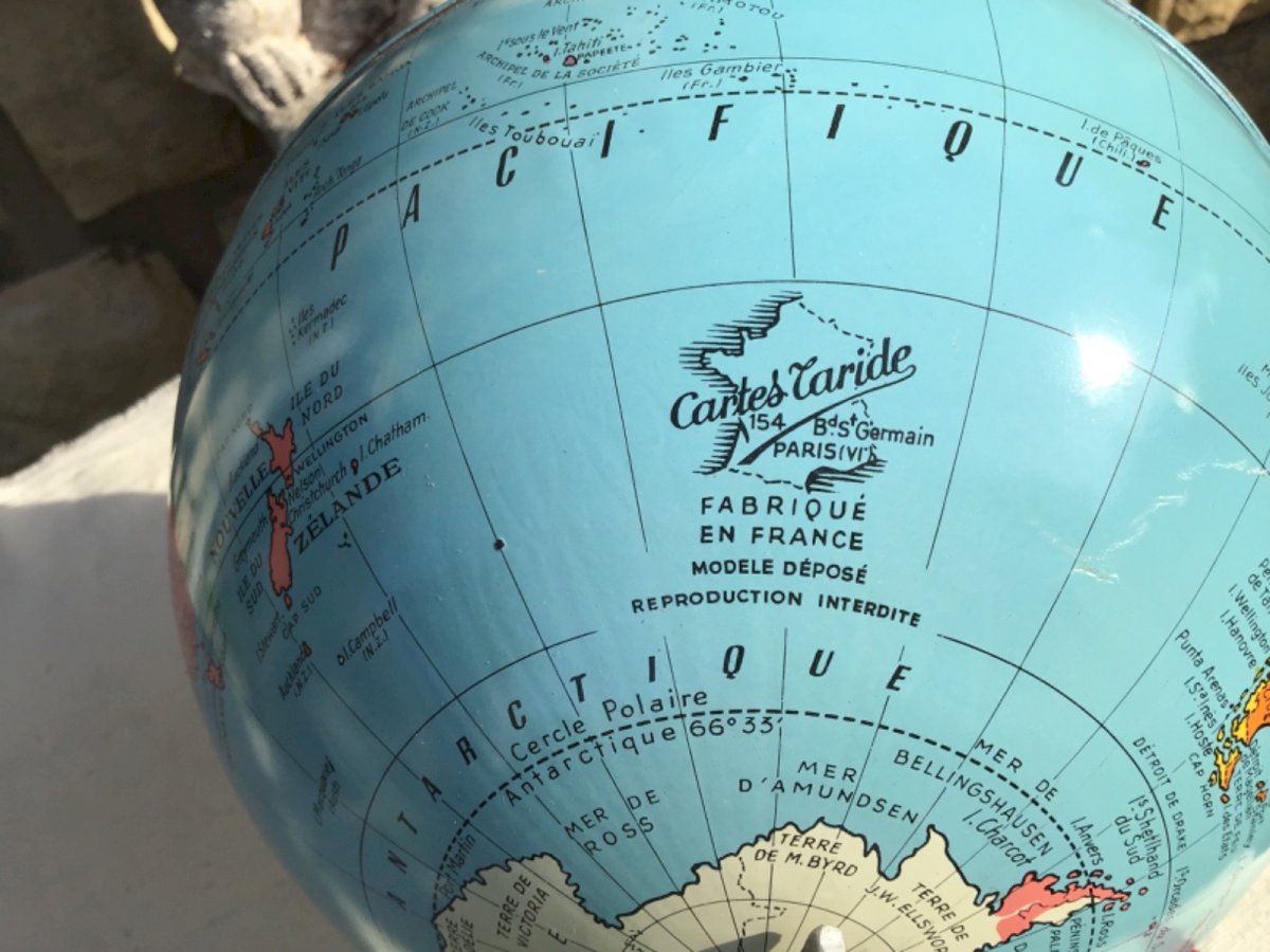 A 1930s globe resting on a pure Art Deco aluminum base. A very decorative item. Please look closely at the photos to get a precise idea of the condition (rather good for its age!). Color: Multicolor Type: Globe, world map Brand: TARIDE Country of manufacture: France Subtype: Freestanding Material: Metal