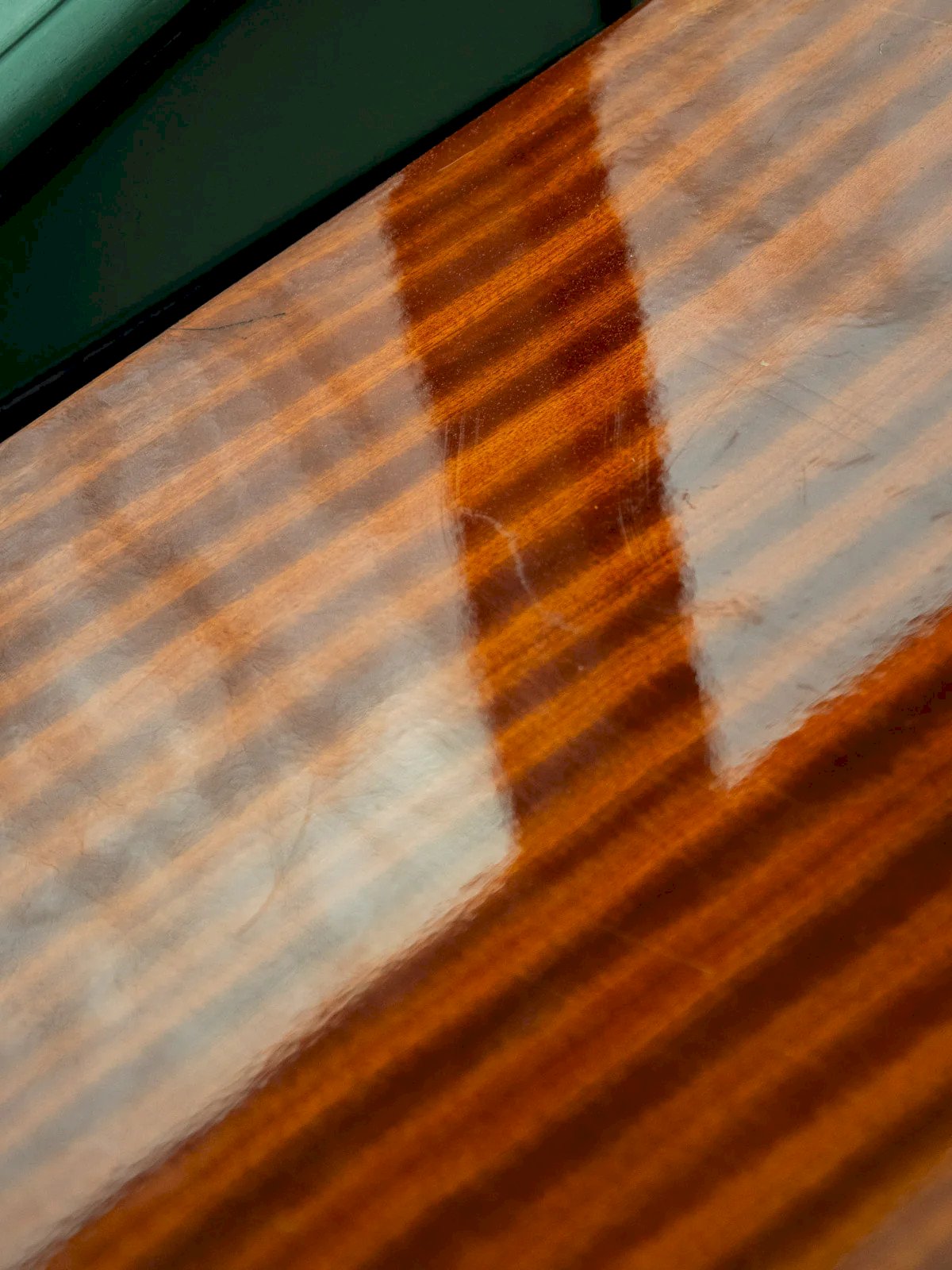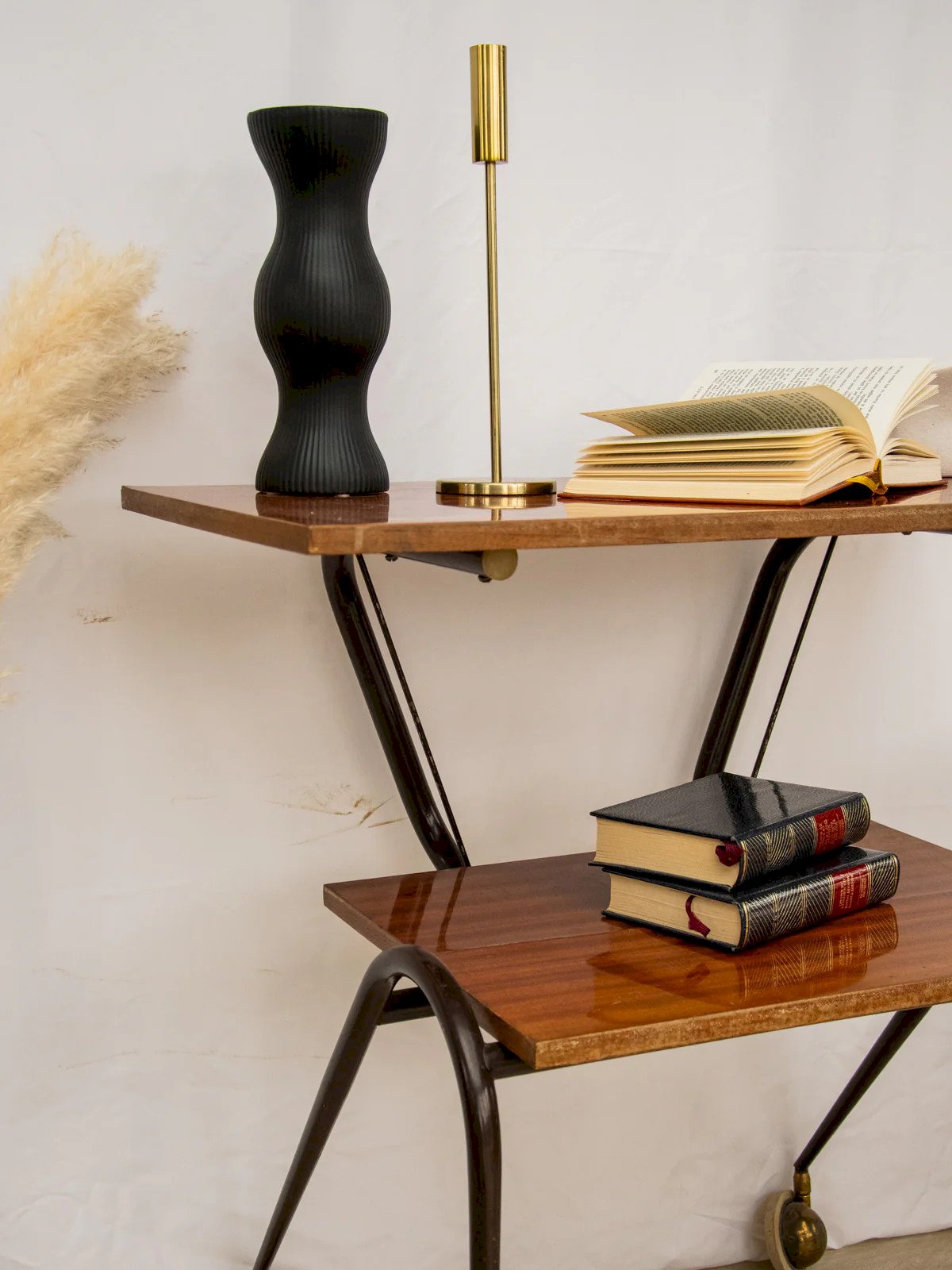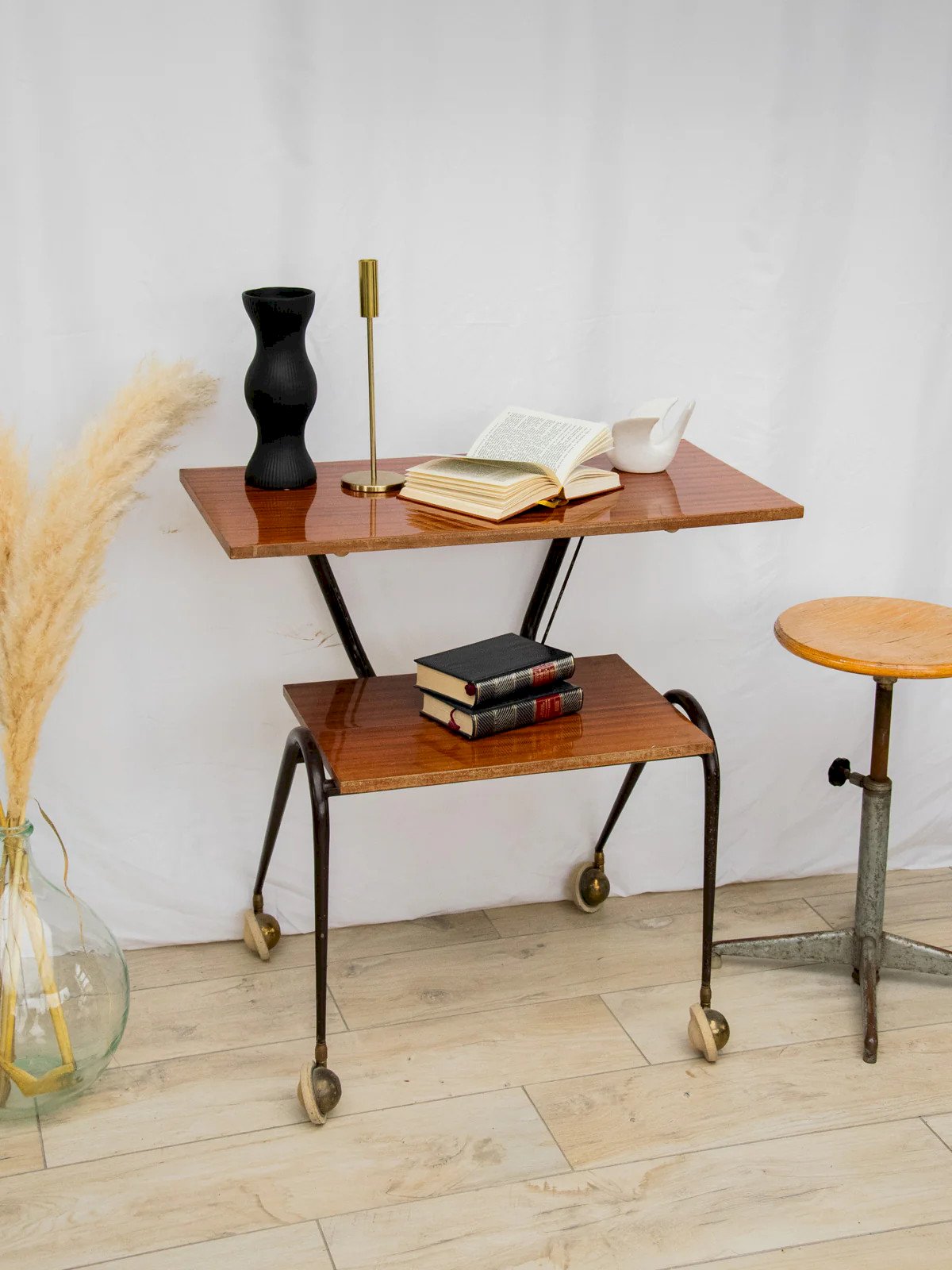 Adopt this two-tier rolling cart made of wood veneer, which combines functionality with an elegant vintage look. Its two levels provide a practical space for serving, displaying dishes or plants, while the brass and rubber wheels ensure discreet and smooth movement around the house. The warmth of the wood and the metallic details create a sober and welcoming atmosphere, ideal for a refined living room or kitchen. Cracked veneer on the lower tray, a few signs of use that add to its authenticity. Length: 75 cm Width: 44 cm Height: 67.5 cm Condition: Used: Item that has been used. Item shows some superficial signs of wear, ... Used: Item that has been used. Item shows some superficial signs of wear, fully operational and functioning correctly. It may be a demonstration model or an item returned to the store after a short period of use. any possible imperfections. Brand: Debongout Type: Thrifted product Material: Wood, Brass Style: Contemporary Custom: Carts