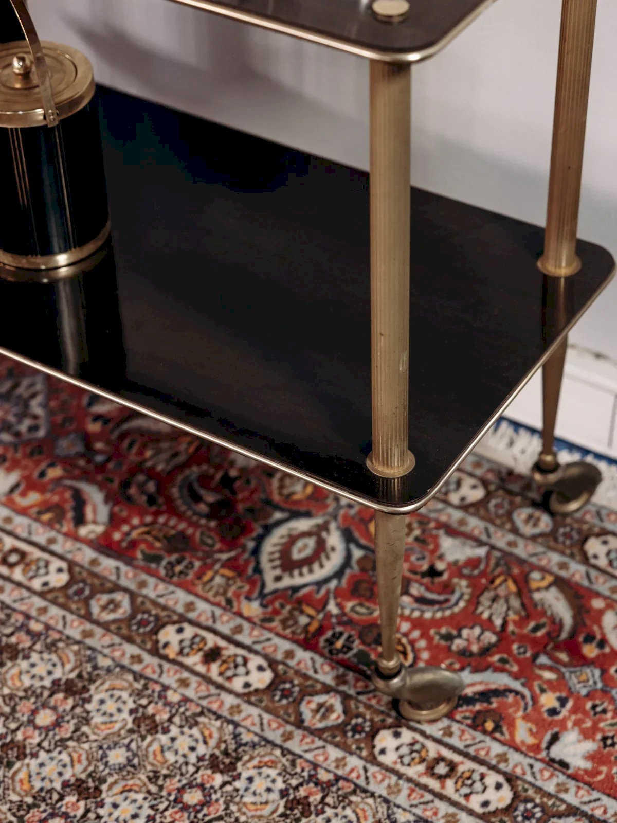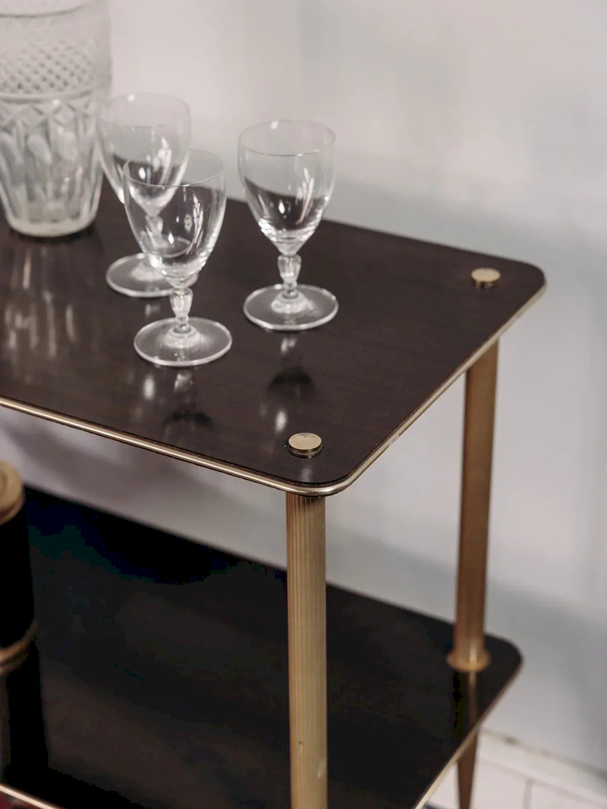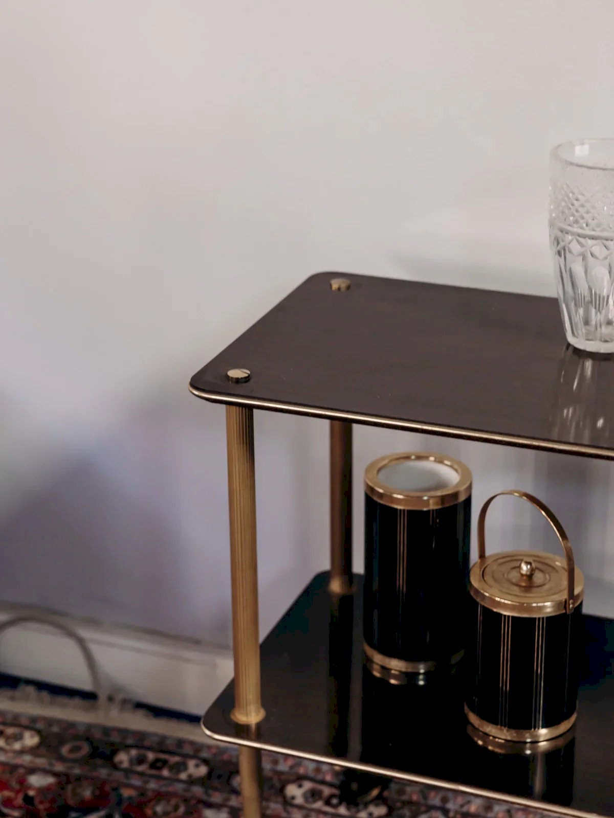 Invite a retro touch with this brown formica and brass serving cart, featuring two trays and discreet small wheels. Its narrow format and studied height offer practical space-saving, while the spacing between trays accommodates bottles, glassware, or serving accessories. The warm contrast of formica and the shine of brass brings a sober and graphic elegance, ideal for a kitchen, bar corner, or living room. Mobile and versatile, it proves indispensable during receptions. Length: 80 cm Width: 39 cm Height: 72 cm Niche height: 40 cm A brief history of the serving cart The serving cart, also known as a serving table, was introduced in the 17th century. At that time, it was used to serve and clear dishes during meals. Equipped with wheels, it can be moved from one place to another effortlessly, allowing for quicker table clearing by reducing the number of trips between the dining room and kitchen. Its great usefulness has made the serving cart an important piece of furniture, also serving to serve tea or breakfast. This small mobile side table has managed to find a prime place in our interiors over the centuries. Condition: Used: Item has been used. Item shows some signs of superficial wear, ... Used: Item has been used. Item shows some signs of superficial wear, fully operational and functioning correctly. It may be a demonstration model or an item returned to the store after a short period of use. possible imperfections. Brand: Debongout Type: Vintage product Material: Formica, Brass Style: Contemporary Custom: Serving carts