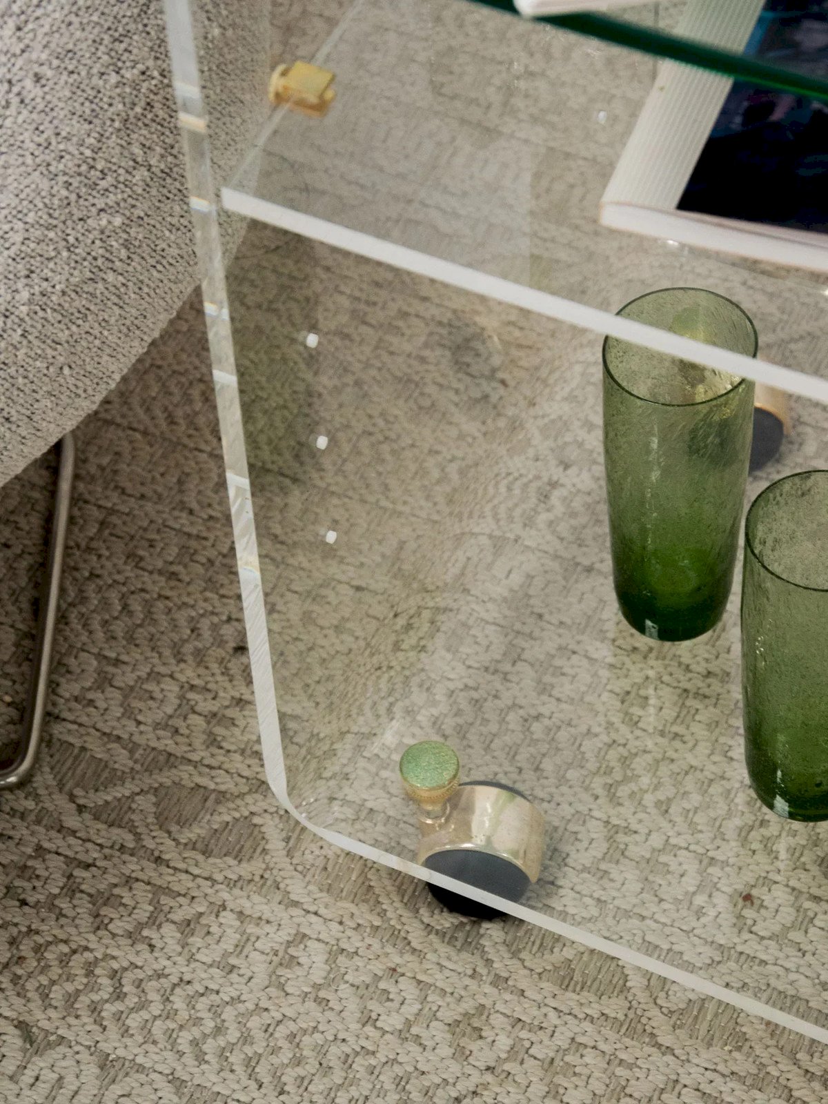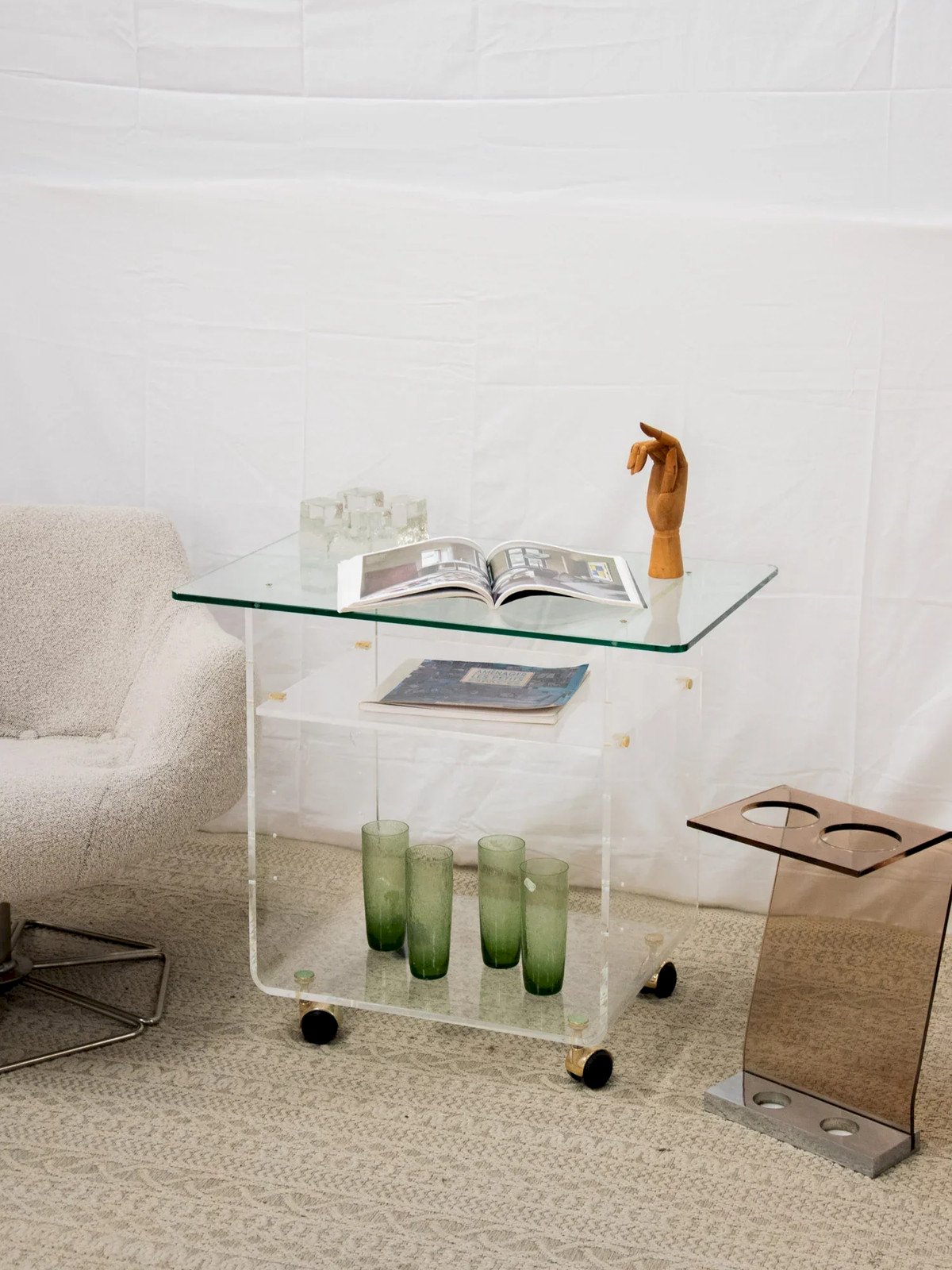 Discover our elegant serving trolley combining a glass top and a plexiglass structure, perfect for enhancing your interior. Equipped with golden and black wheels, it seamlessly combines functionality and style. A few light traces on the top testify to its character while maintaining a chic and modern look. Ideal for serving your guests or showcasing your decorative items, this trolley will add a refined touch to your space. Length: 70 cm Width: 45 cm Height: 62 cm Height of the upper niche: 14.5 cm Height of the lower niche: 38 cm A brief history of the serving trolley The serving trolley, also known as a serving table, emerged in the 17th century. At that time, it was used to serve and clear the dishes during meals. Fitted with wheels, it can be moved effortlessly from one place to another and allows for quicker table clearing by reducing the number of trips between the dining room and the kitchen. Its great utility is why the serving trolley has become an important piece of furniture, also being used to serve tea or breakfast. This mobile side table has managed to find a special place in our interiors over the centuries. Condition: Used: Item that has been used. Item showing some superficial wear, fully operational and functioning properly. It may be a display model or a returned item after a short period of use. Possible imperfections. Brand: Debongout Type: Vintage product Material: Plexiglass, Glass Style: Contemporary Customizable: Serving trolleys