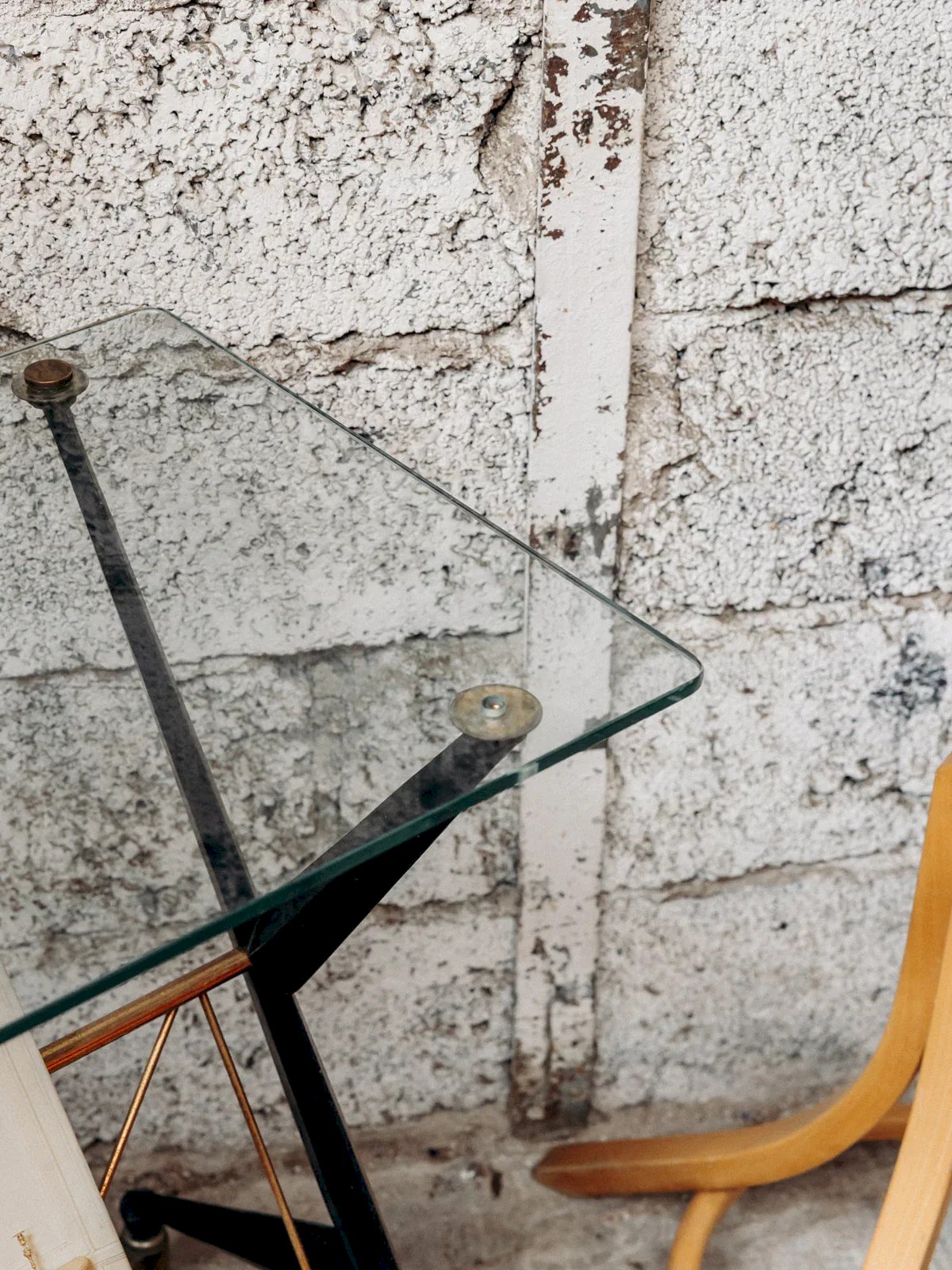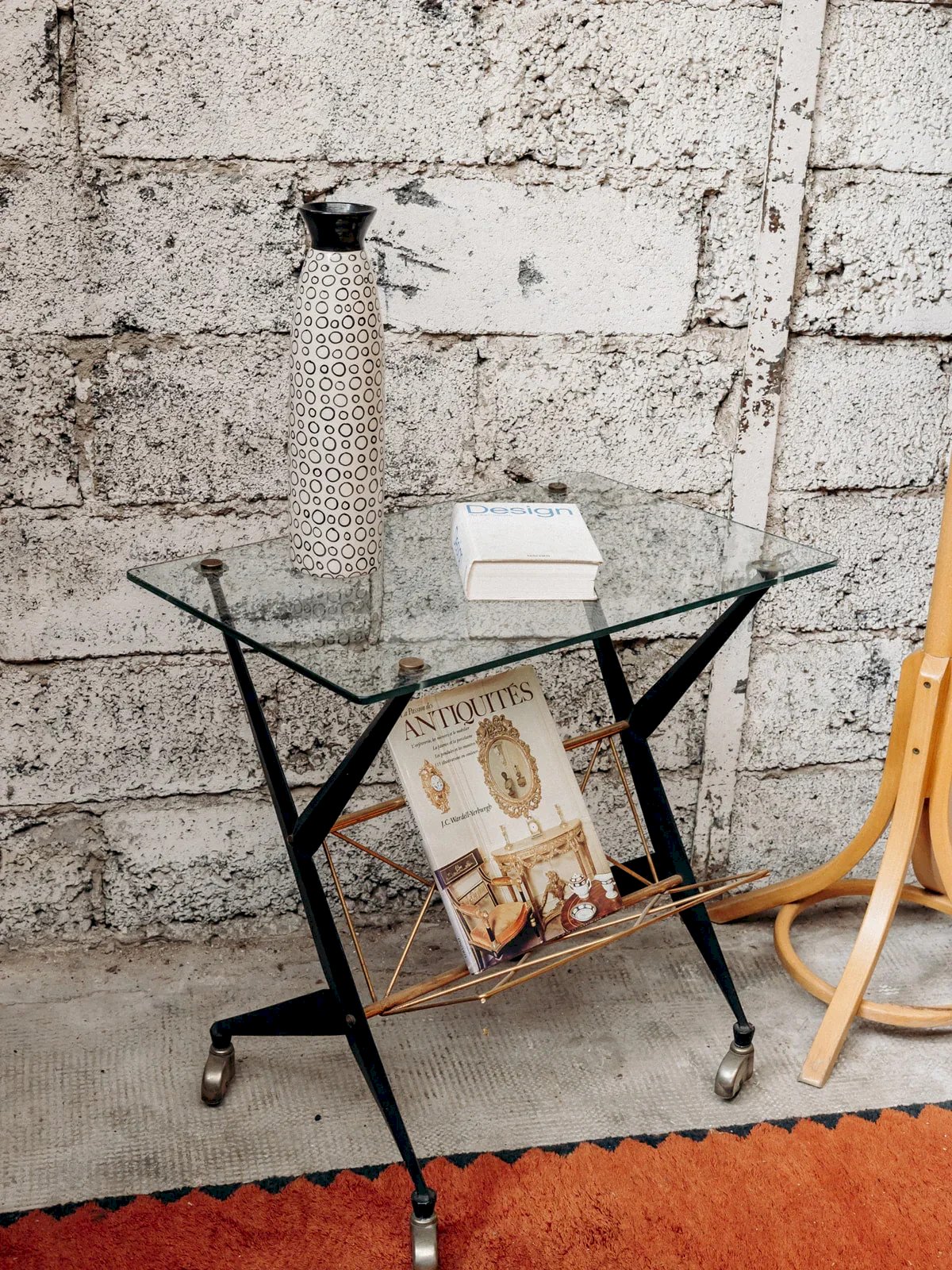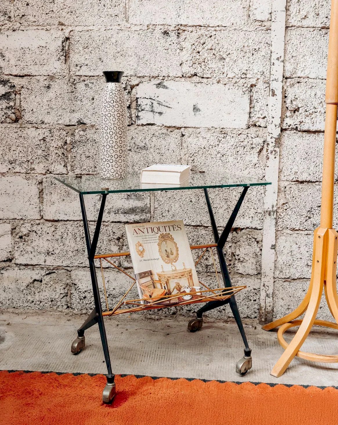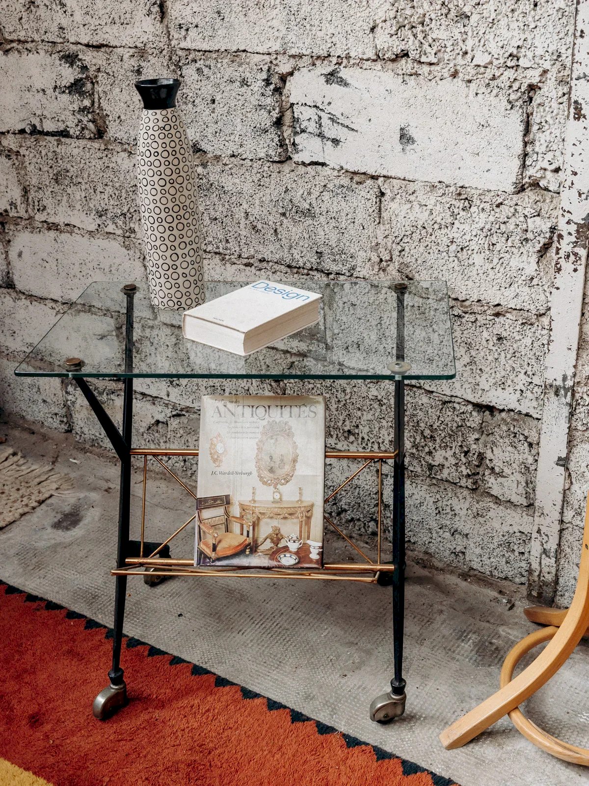 Discover this vintage-style serving cart, combining an elegant glass top with a sleek black metal structure. It features a built-in golden magazine holder, practical and decorative. Mounted on old rollers, it moves easily from one room to another. Note: there is a small missing element, without affecting its functionality or charm. An ideal piece for a retro and practical touch in your home. Dimensions of the serving cart: Length: 72 cm Height: 71 cm Depth: 45 cm Dimensions of the magazine holder: Length: 50 cm Depth: 30 cm A brief history of the serving cart The serving cart, also known as a butler's tray, was born in the 17th century. At that time, it was used to serve and clear dishes during meals. Equipped with wheels, it can be easily transferred from one place to another and allows for faster table clearing by reducing the number of trips between the dining room and the kitchen. Its great utility has made the serving cart an important piece of furniture, also used for serving tea or breakfast. This mobile side table has found its place over the centuries in our interior. Condition: Used: item that has been used. Item showing some superficial signs of wear...Used: item that has been used. Item showing some superficial signs of wear, fully operational and functioning correctly. It may be a demonstration model or an item returned to the store after a short period of use. Any imperfections. Brand: Debongout Type: Thrifted product Material: Metal, Glass Style: Contemporary Customized: Serving carts
