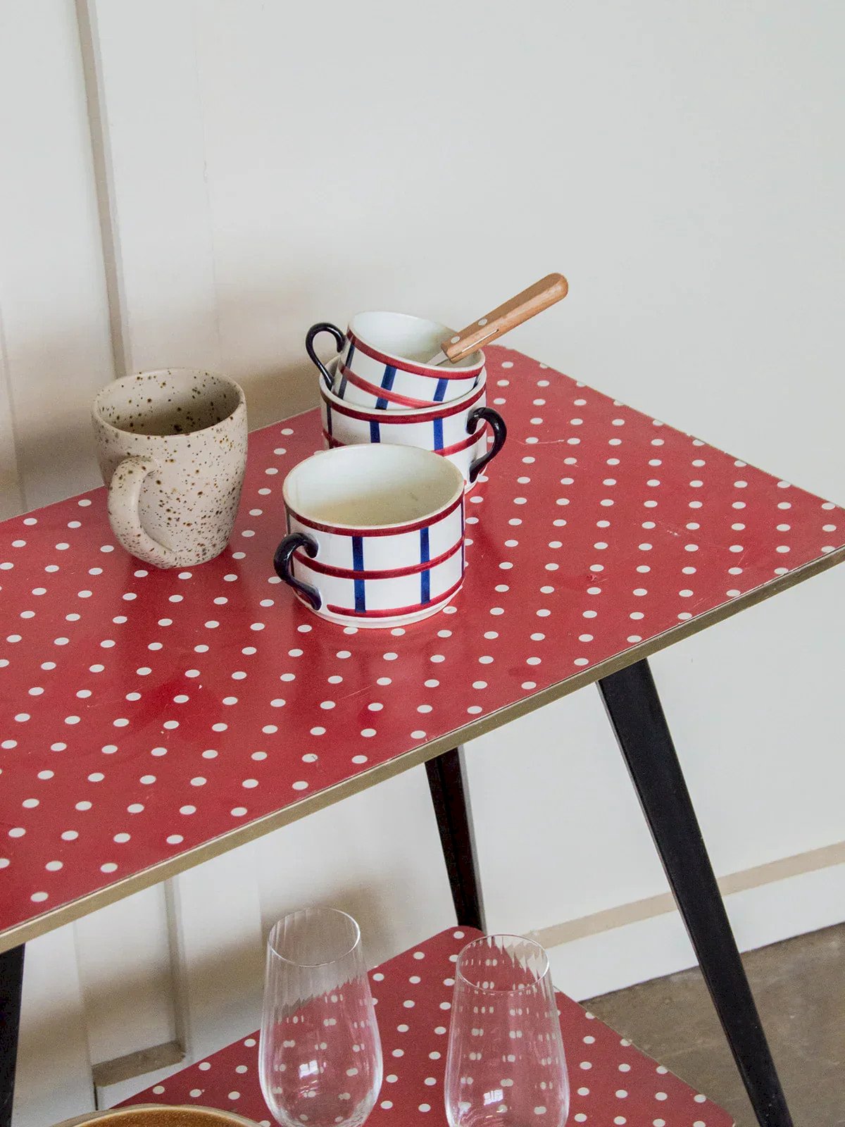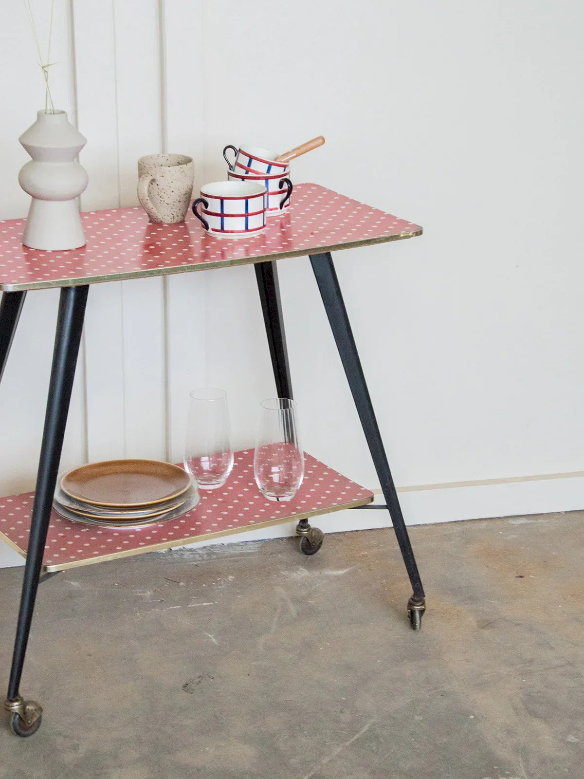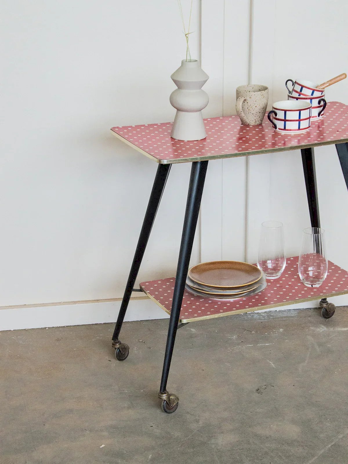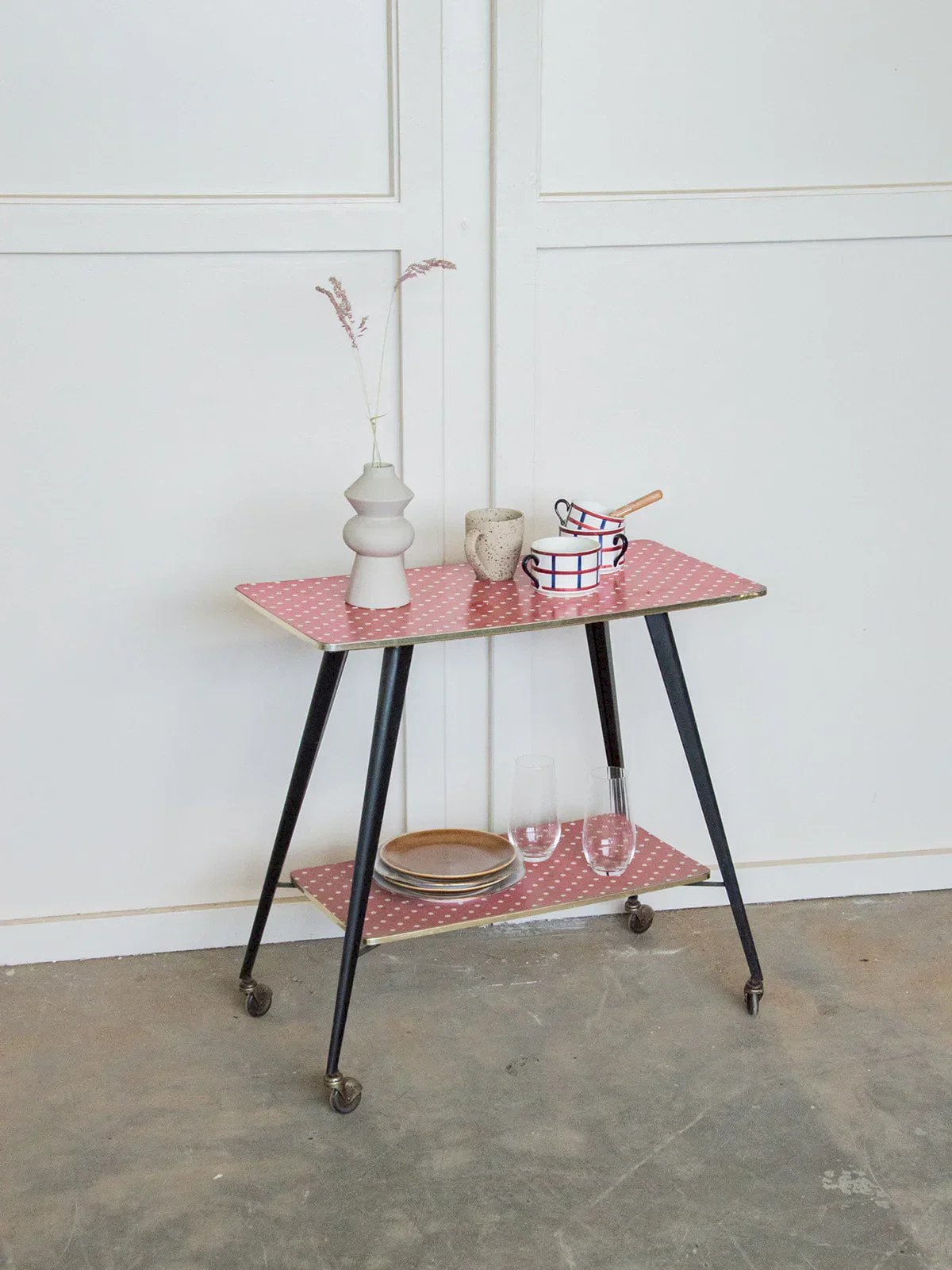 Fall for this retro-style serving cart with its black and red metal adorned with white polka dots, adding a fun and colorful touch to your interior. With its small wheels, it is both practical and mobile, ideal for transporting your drinks, snacks, or accessories in a playful and elegant manner. Perfect for a kitchen, living room, or dining area, this serving cart will bring a dynamic and original note to your decor while adding a charming vintage touch. Online exclusive, the meeting will take place at your home! Length: 72 cm Width: 36 cm Height: 70 cm A brief history of the serving cart The serving cart, also known as a serving table, originated in the 17th century. At that time, it was used to serve and clear dishes and utensils during meals. Equipped with wheels, it can be moved from one place to another effortlessly and allows for faster table clearing by reducing the number of trips between the dining room and the kitchen. Its great utility is why the serving cart became an important piece of furniture, also used for serving tea or breakfast. This mobile side table has found its place over the centuries in our homes. Condition: Used item with some superficial signs of wear, fully operational and functioning correctly. It may be a demo model or an item returned to the store after a short period of use. Any imperfections. Brand: Debongout Type: Vintage product Material: Metal Style: Contemporary Customizable: Serving carts