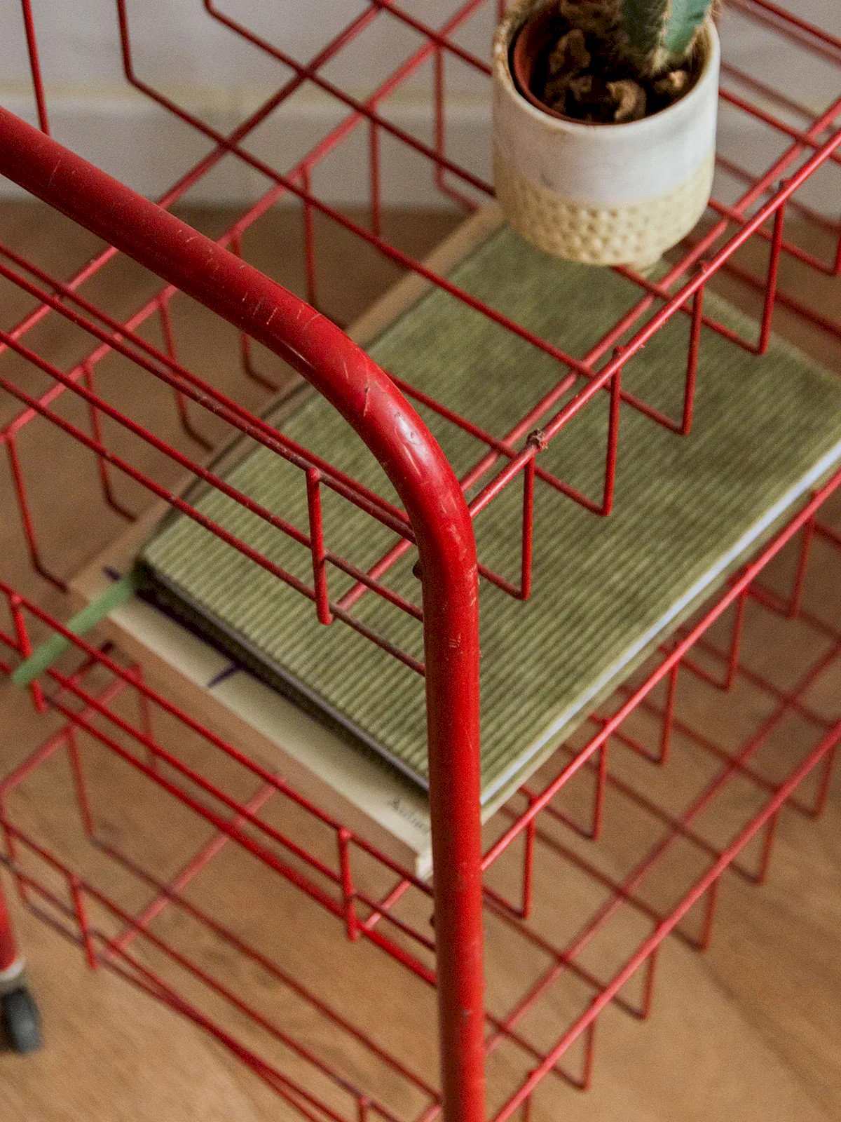 Discover the little red metal serving trolley, a piece of furniture that is both practical and aesthetic. Featuring three spacious shelves, it provides optimal storage space for your dishes, drinks, or decorative items. Its small wheels make it easy to move, allowing you to place it wherever you like. With its metal grid, it adds a touch of industrial charm to your interior, combining functionality and style. Length: 41 cm Width: 24 cm Height: 64 cm Height of the niche: 18 cm A brief history of the serving trolley The serving trolley, also known as a serving table, was created in the 17th century. At that time, it was used to serve and clear dishes during meals. Equipped with wheels, it can be transferred from one place to another effortlessly, allowing for faster clearing of the table by reducing the number of trips between the dining room and kitchen. Its great utility has made the serving trolley an important element of furniture, also serving tea or breakfast. This small mobile side table has managed to find a prominent place in our interior over the centuries. Condition: Used: Item has been used. Item shows some superficial signs of wear... Used: Item has been used. Item shows some superficial signs of wear, fully operational and functioning correctly. It may be a demonstration model or a product returned to the store after a short period of use, with potential imperfections. Brand: Debongout Type: Thrifted product Material: Metal Customized: Trolleys Style: Contemporary