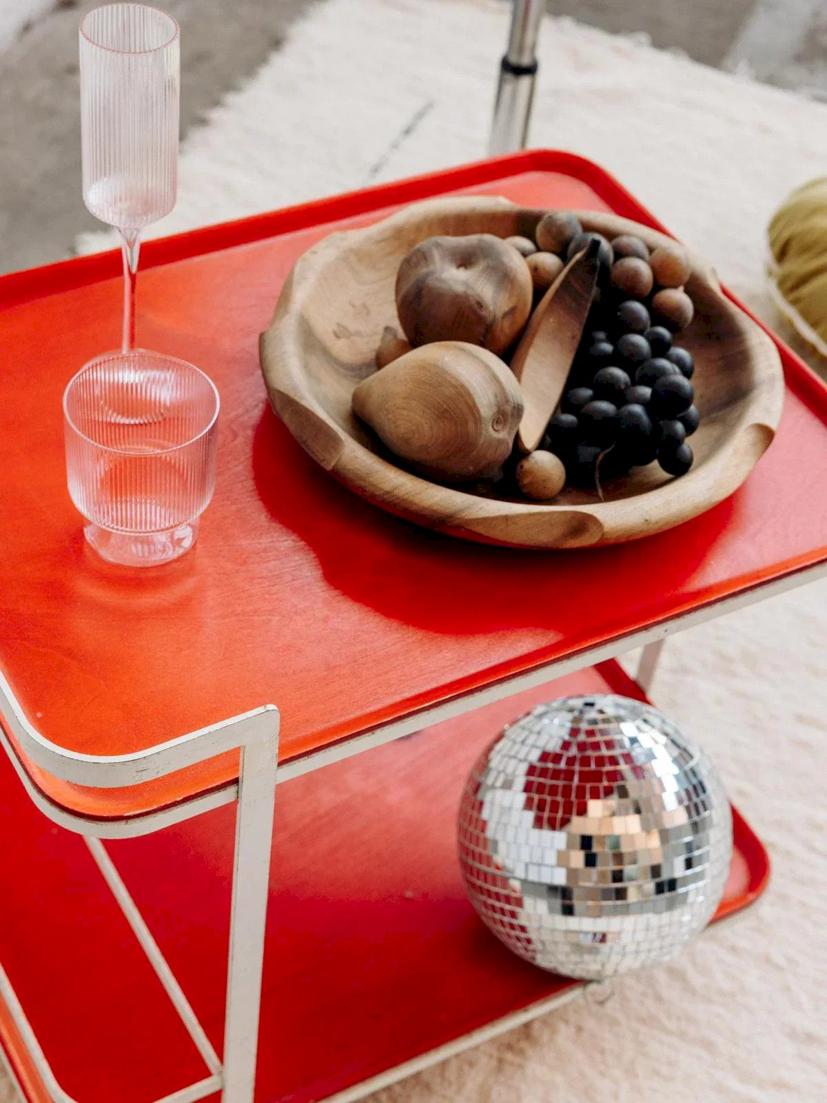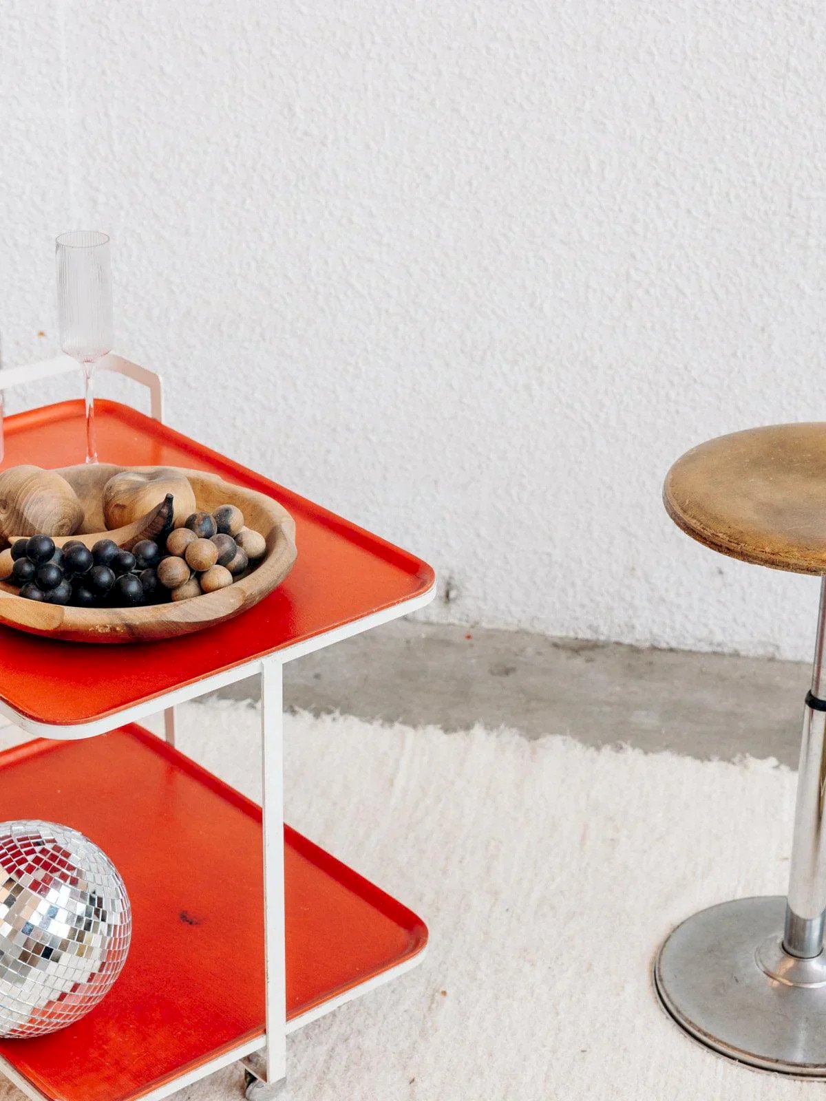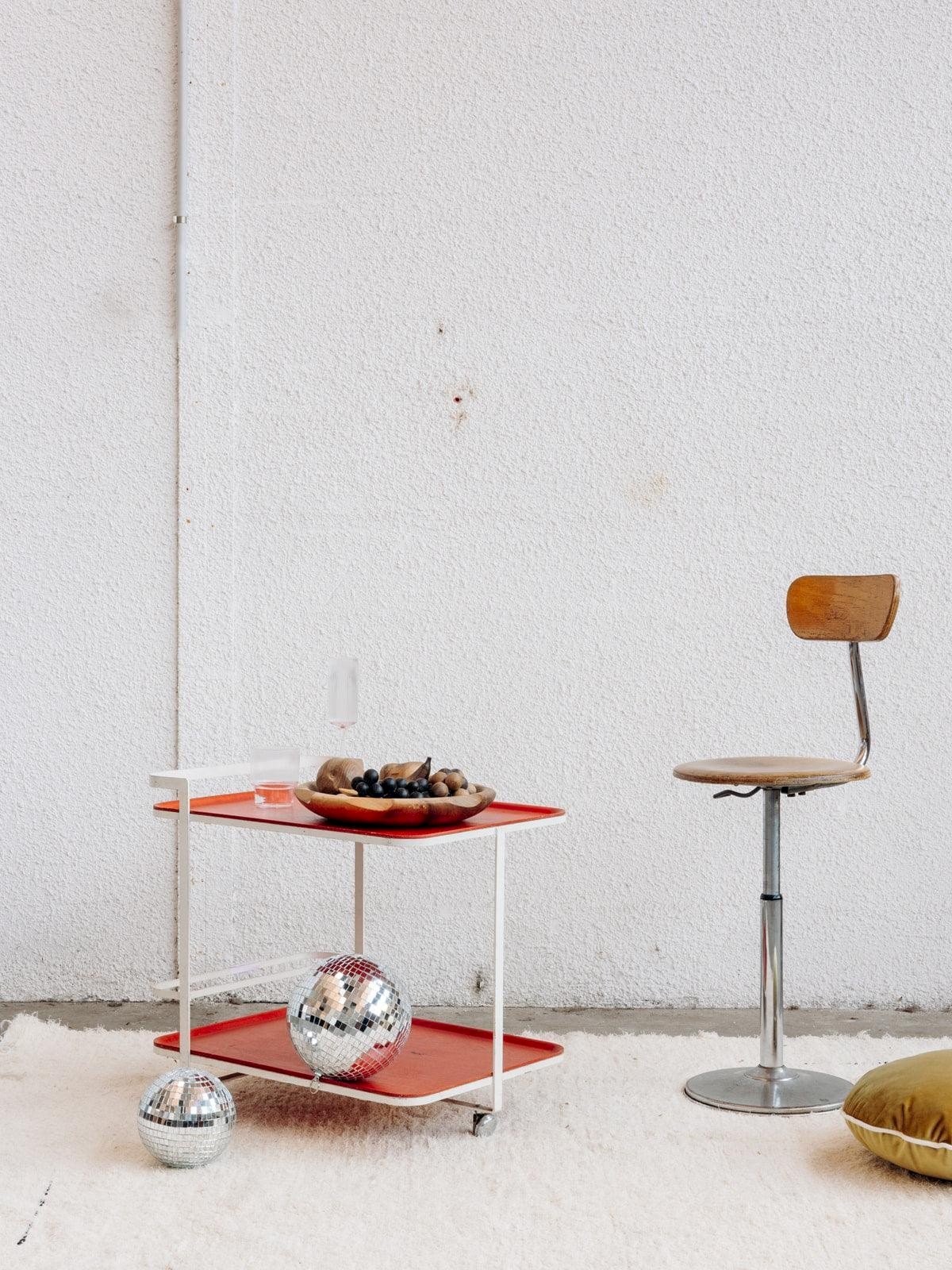 Discover Anouk, the retro serving cart from the 70s made in Sweden from poplar wood. With its vibrant red and white colors, it adds a colorful touch to your interior. Its functional design and vintage look make it the ideal choice to bring character to your kitchen, dining room, or any other living space. Unfortunately, this product is not visible in stores. Length: 59 cm Width: 44 cm Height: 57.5 cm Condition: Used: Item has been used. Item shows some superficial signs of wear... Used: Item has been used. Item shows some superficial signs of wear, fully operational and functioning correctly. It may be a demonstration model or an item returned to the store after a short period of use. Possible imperfections. Brand: Debongout Type: Thrifted product Material: Metal, Poplar Style: Contemporary Customized: Serving carts