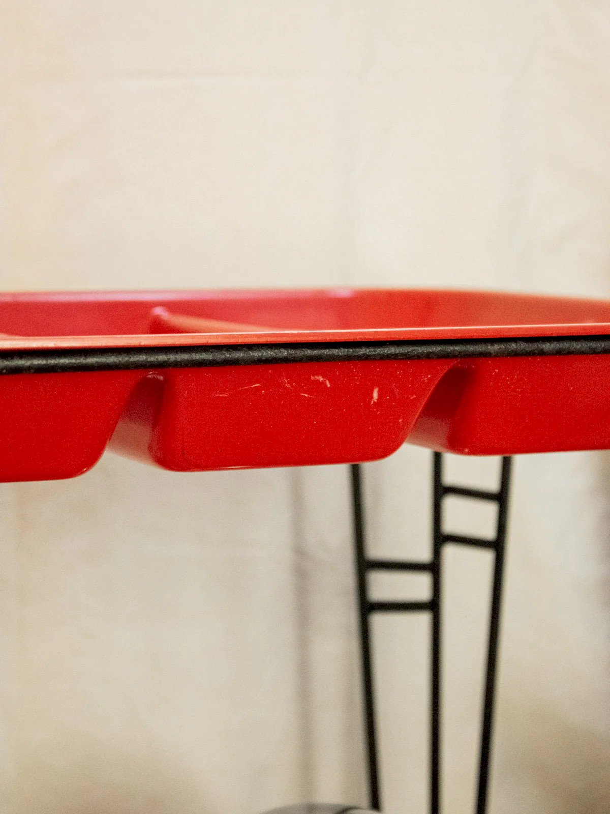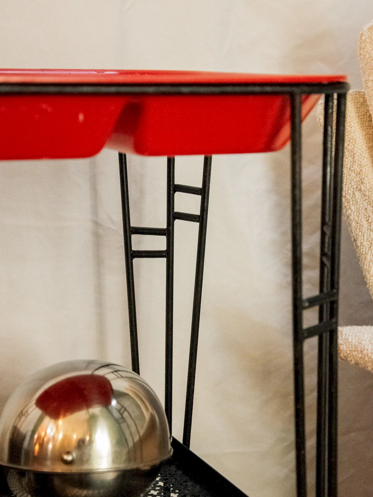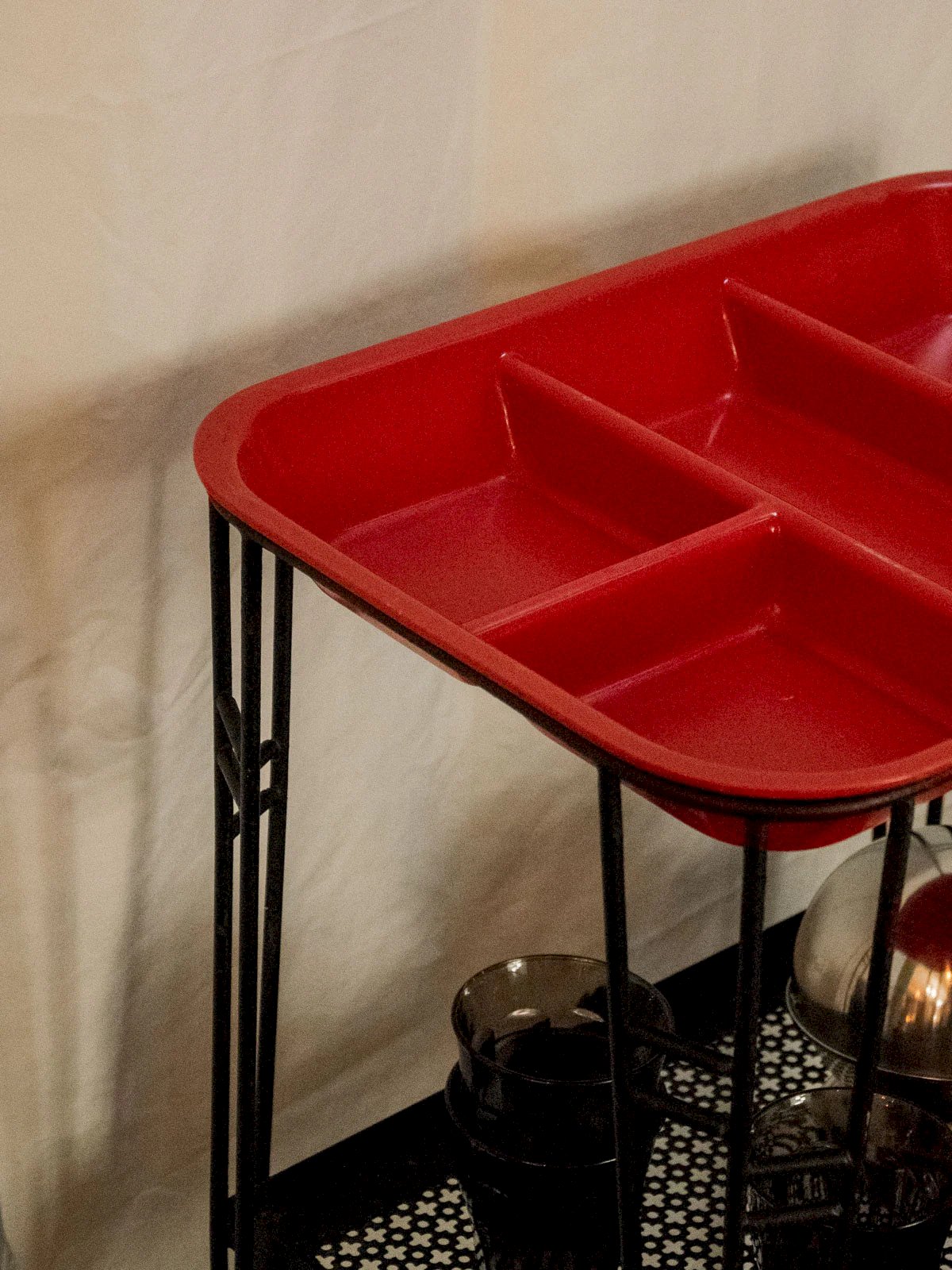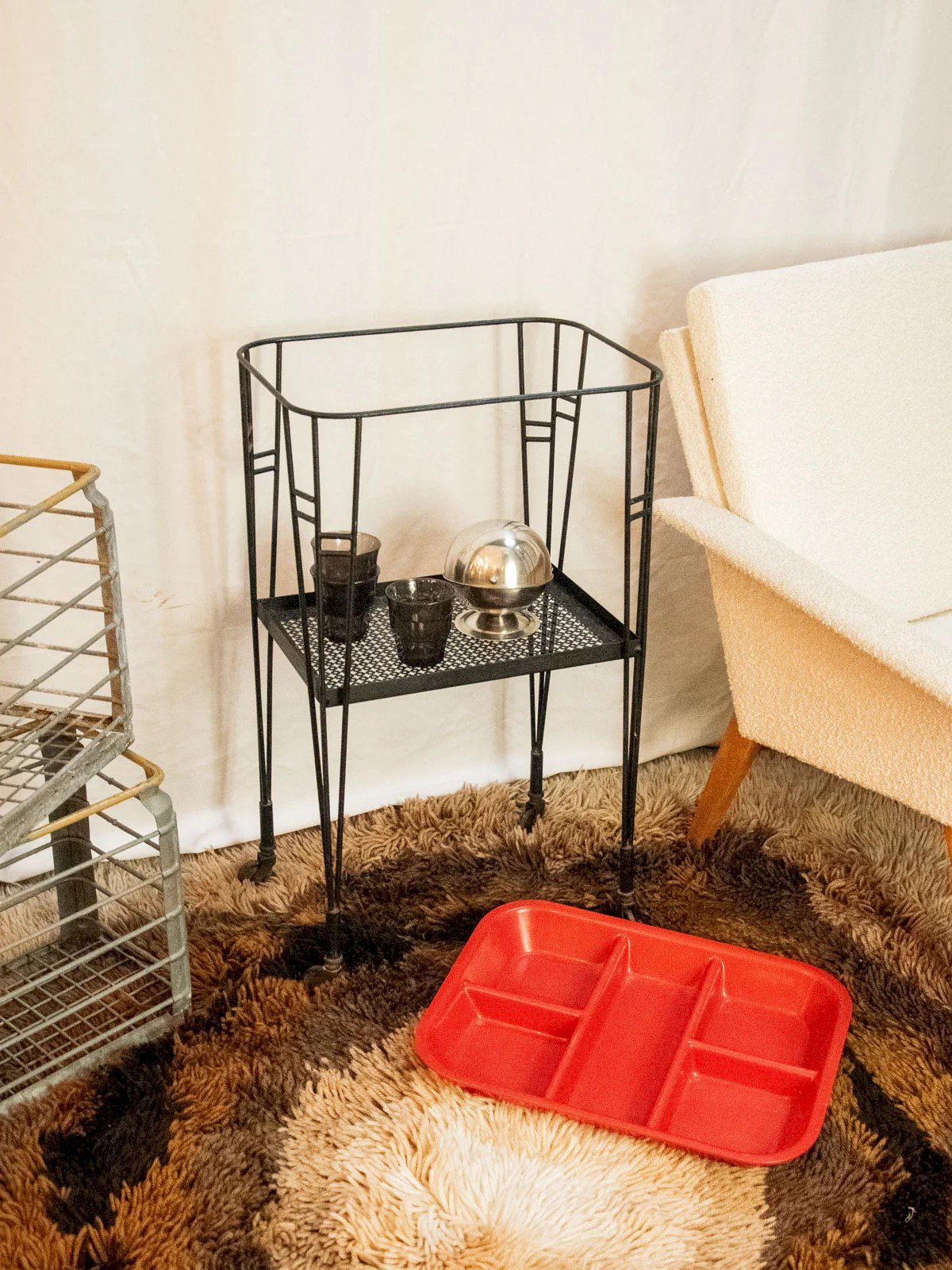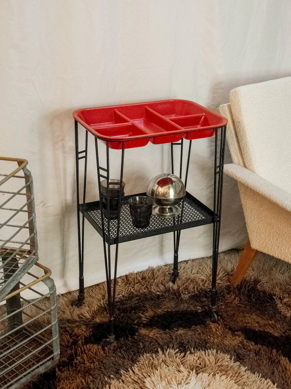 Elevate your reception moments with this black wrought iron serving cart featuring a removable compartmentalized red tray, combining sturdiness with a colorful touch. The easily removable top tray is perfect for serving and organizing bottles, appetizers, or small accessories, while the lower tray accommodates dishware and discreet reserves. Its simple and contrasting design creates a warm and contemporary atmosphere, ideal for a bar corner or a friendly side table. Signs of wear are present. Length: 46 cm Width: 34 cm Height: 76 cm Niche height: 30.5 cm Condition: Used: Item that has been used. Item showing some superficial signs of wear,... Used: Item that has been used. Item showing some superficial signs of wear, fully operational and functioning properly. It may be a demonstration model or an item returned to the store after a short period of use. possible imperfections. Brand: Debongout Type: Thrifted Product Material: Iron, Plastic, Metal Style: Contemporary Customized: Serving Carts