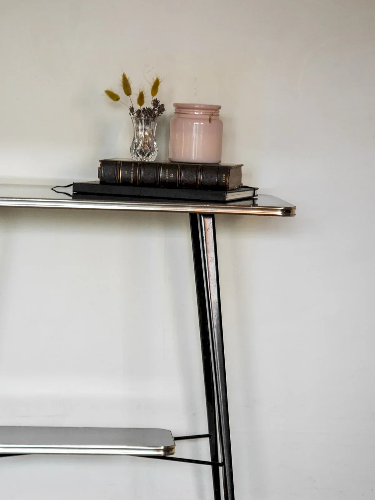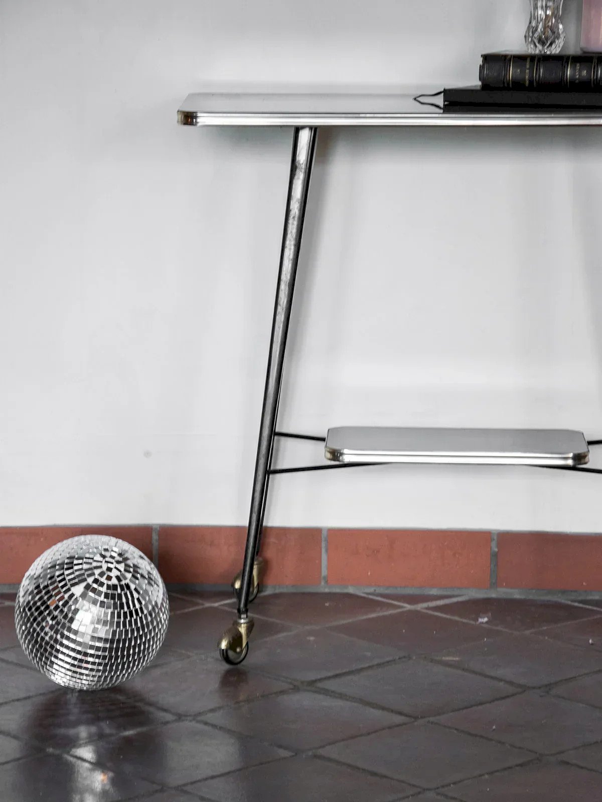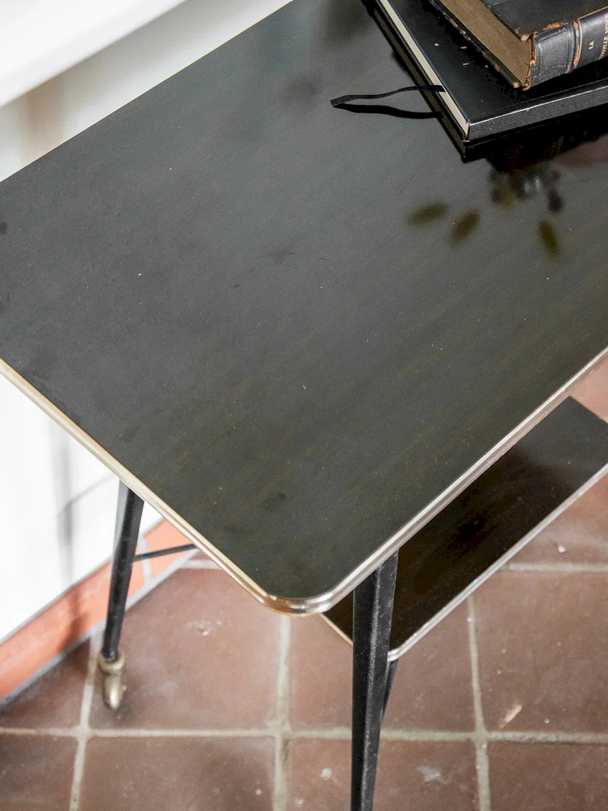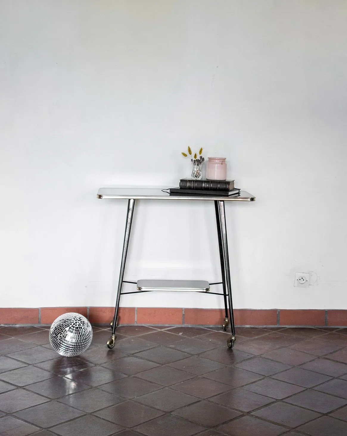 Add a touch of elegance to your interior with this brown lacquered serving trolley, featuring refined finishes and a brass base. Practical and aesthetic, it rests on wheels for easy movement and is equipped with two wooden shelves offering ample storage space. This serving trolley combines functionality and style, perfect for enhancing your living spaces. Web exclusive, the meeting will take place at your home! Length: 74 cm Width: 38 cm Height: 73 cm A little history of the serving trolley The serving trolley, also known as a serving table, came into existence in the 17th century. At that time, it was used to serve and clear dishes and tableware during meals. Equipped with wheels, it can be moved from one place to another effortlessly, allowing for quicker table clearing by reducing the number of trips between the dining room and the kitchen. Its great utility has made the serving trolley an important element of furniture, also serving tea or breakfast. This mobile side table has found its place of choice in our interior over the centuries. Condition: Used: Item that has been used. Item showing some superficial signs of wear... Used: Item that has been used. Item showing some superficial signs of wear, fully operational and functioning correctly. It may be a demonstration model or an item returned to the store after a short period of use. Possible imperfections. Brand: Debongout Type: Vintage product Material: Wood, Brass Style: Contemporary Custom: Trolleys