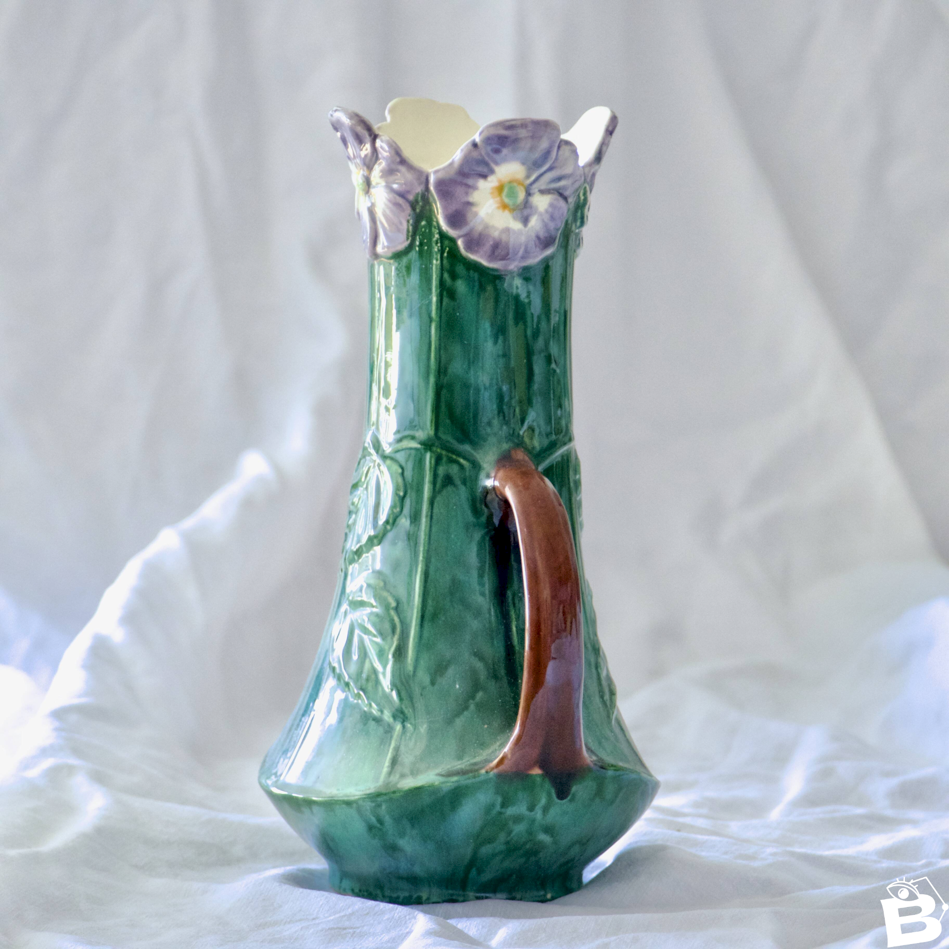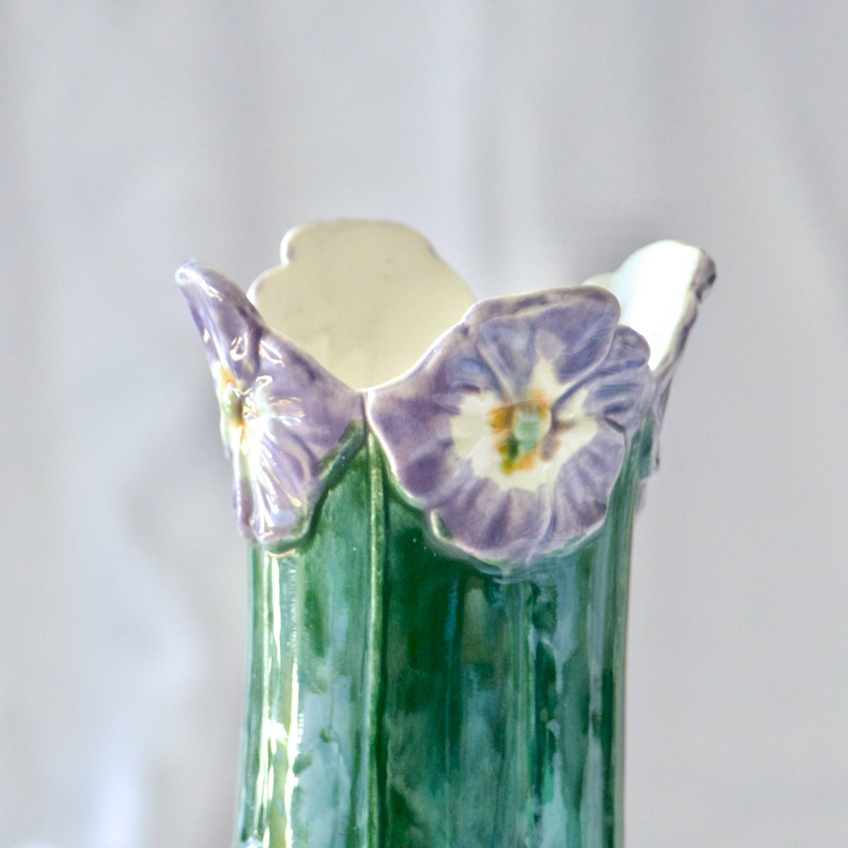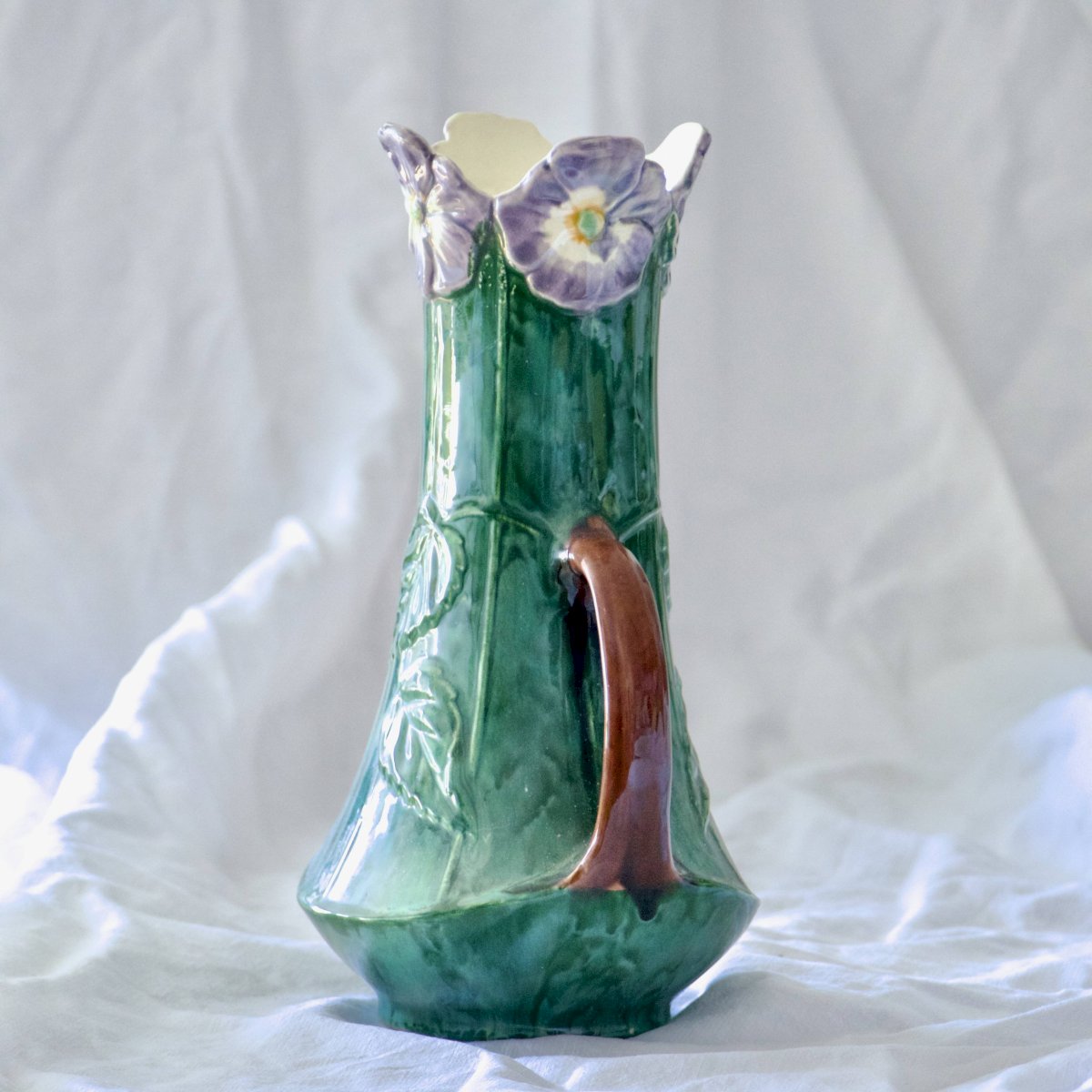 Wonderful ancient vase (amphora) in slip from the Art Nouveau period, late 19th century, handmade and painted. The neck of the vase features relief in the shape of pansy or violet flowers, and the handles are shaped like stems/branches. Leafy relief on the body. Pretty colors, fir green, violet, and touches of orange in the flowers. Numbered on the underside. It is in very good condition, no missing pieces. ? 26.5 x 17 cm. ✨ Very careful shipping. ✨ We have other listings online, feel free to take a look! 800 g. 02/24. L: 17 W: 17 H: 26