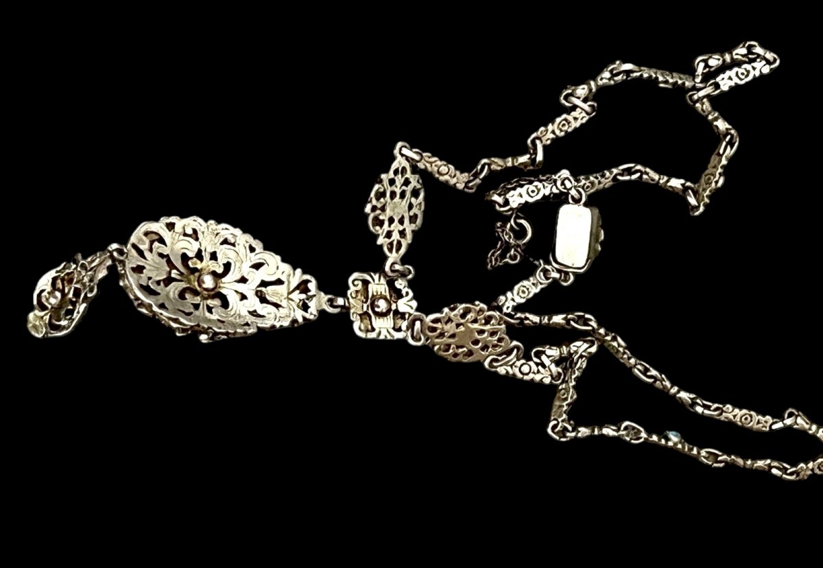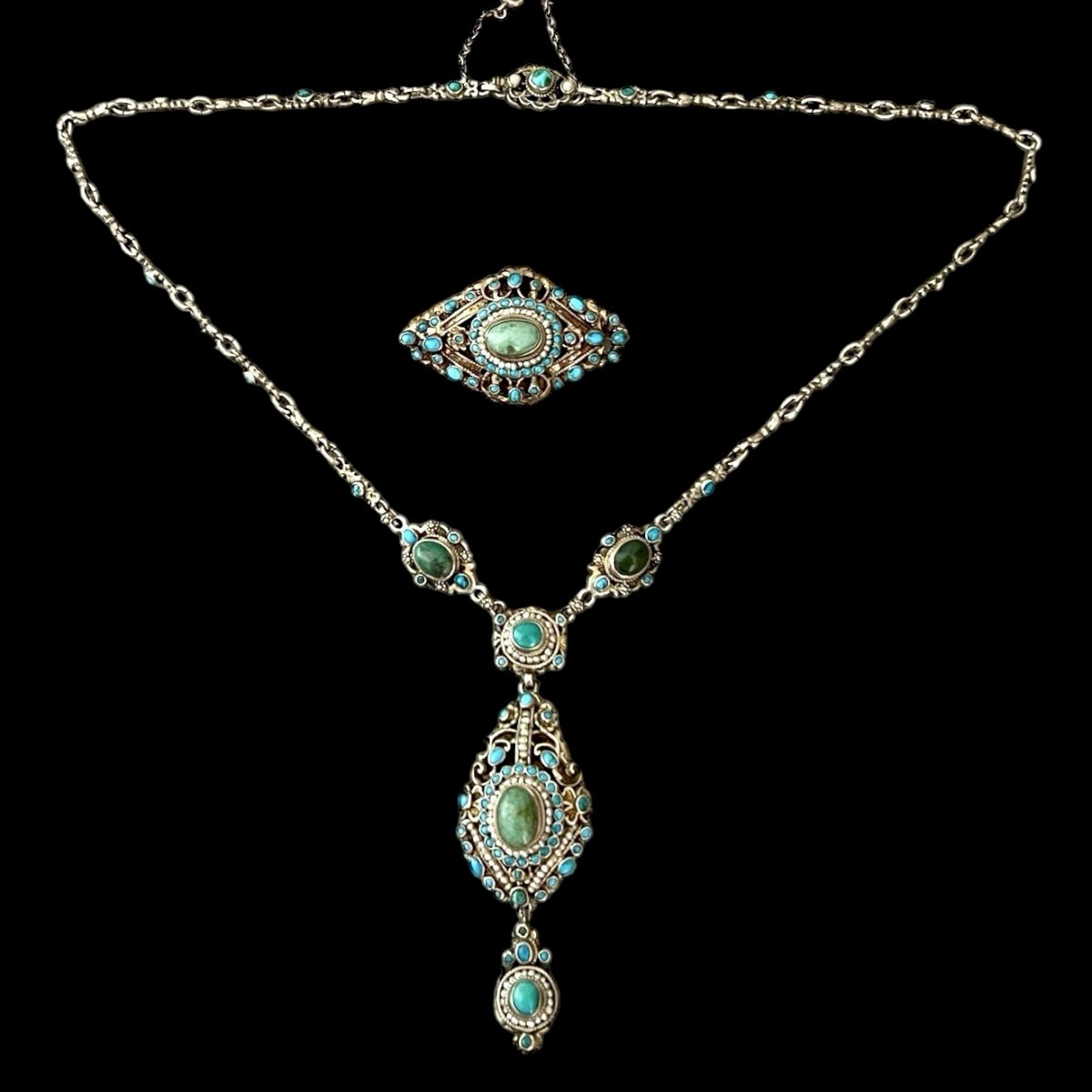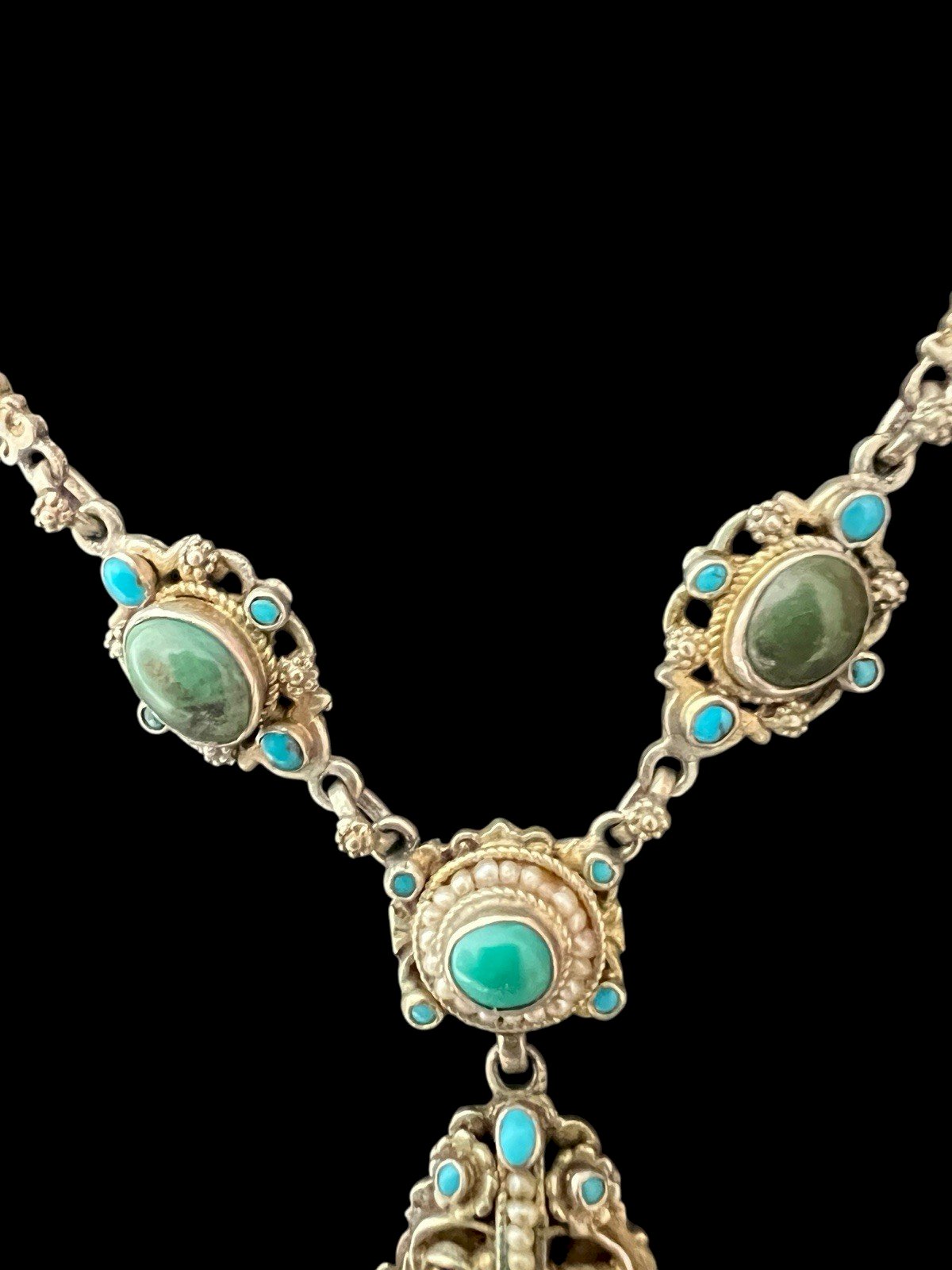 Antique Austro-Hungarian Set 19th Century Silver Turquoise Natural Pearls Brooch and Necklace This exceptional Austro-Hungarian set from the late 19th century includes a necklace and a matching brooch, both made of solid silver (stamped) with a very slight trace of original vermeil. It is rare to find a set of this period and style in such perfect condition. Each piece is richly set with vibrant natural turquoises and natural fine pearls. The design is typical of historic Central European silverware, characterized by detailed patterns and a high level of craftsmanship. Lot details: * Period: 19th century (Austro-Hungarian Style) * Metal: Solid silver (stamped) * Stones: Natural turquoises and natural fine pearls * Condition: Perfect condition * Total weight: 39.1 g * Necklace: 28.9 g * Brooch: 10.2 g * Approximate dimensions: * Necklace: Total height (worn) approx. 28 cm. The central pendant measures approx. 6 cm in height with a maximum width of 2.7 cm. * Brooch: Approx. 4 cm x 2.5 cm Condition: Second-hand: An item that has been worn... Second-hand: An item that has been worn. any potential imperfections. Dominant stone: Turquoise Number of pieces: 2 pieces Brand: 19th-century set Country of origin: Austria-Hungary Dominant color: Silver Material: Stone Components of the set: Brooch, Necklace Metal: Sterling silver