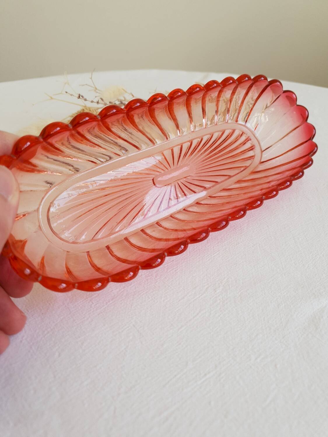 Baccarat bowl model Bamboo Twisted in pink tinted crystal with twisted ribs. This old comb holder from the early 20th century in molded crystal is signed. Gorgeous pink gradient. Length 24.5 cm. Width 9 cm. Very good general condition, slight traces of time are normal for a piece over 100 years old. L: 24 W: 9 H: 4