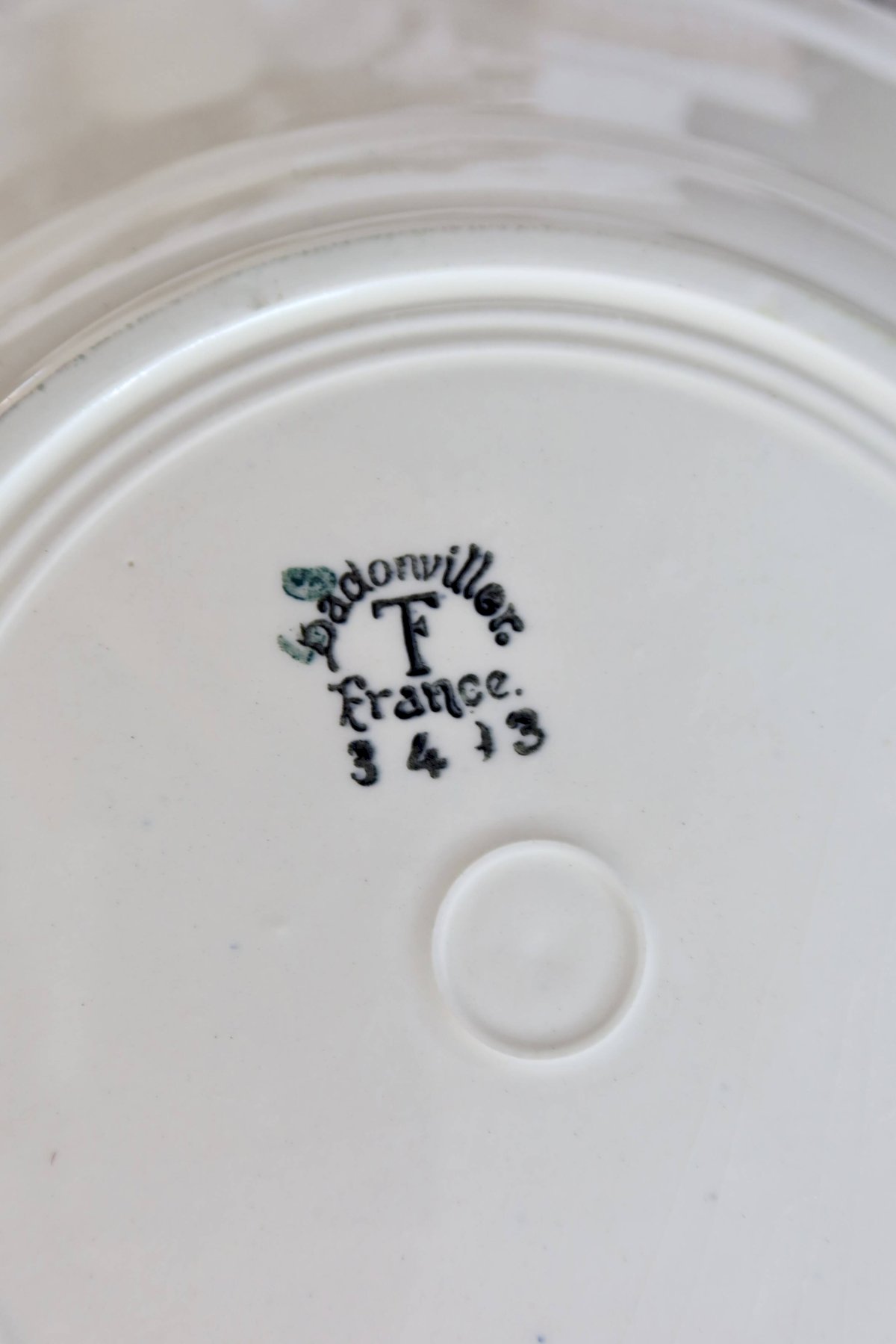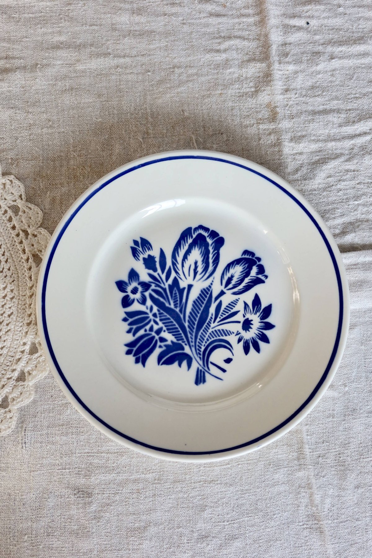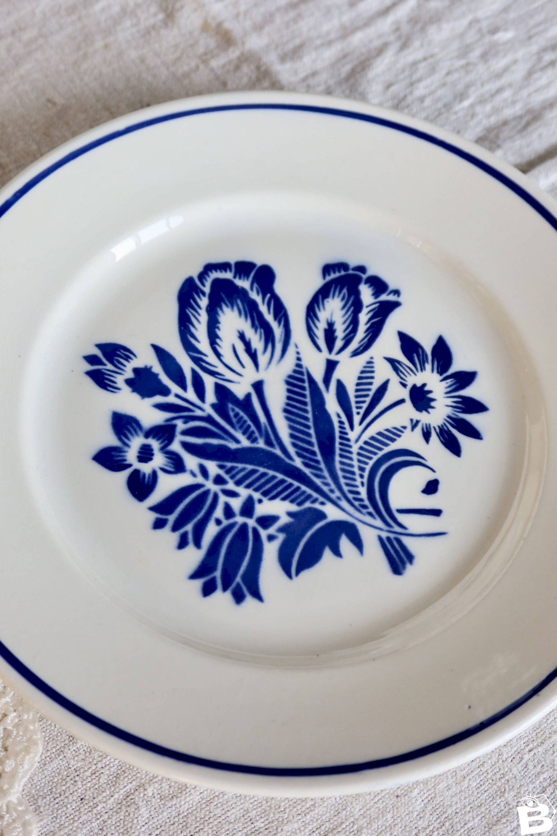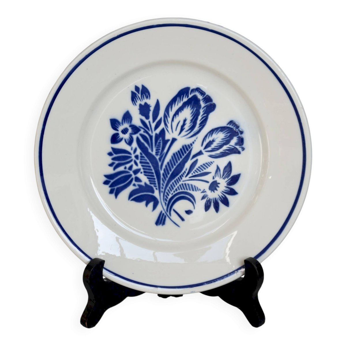 Beautiful ivory earthenware dessert plate from Badonviller, featuring a central decoration of stylized blue flowers and a blue rim on the edge.