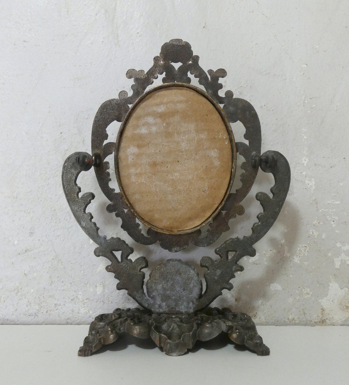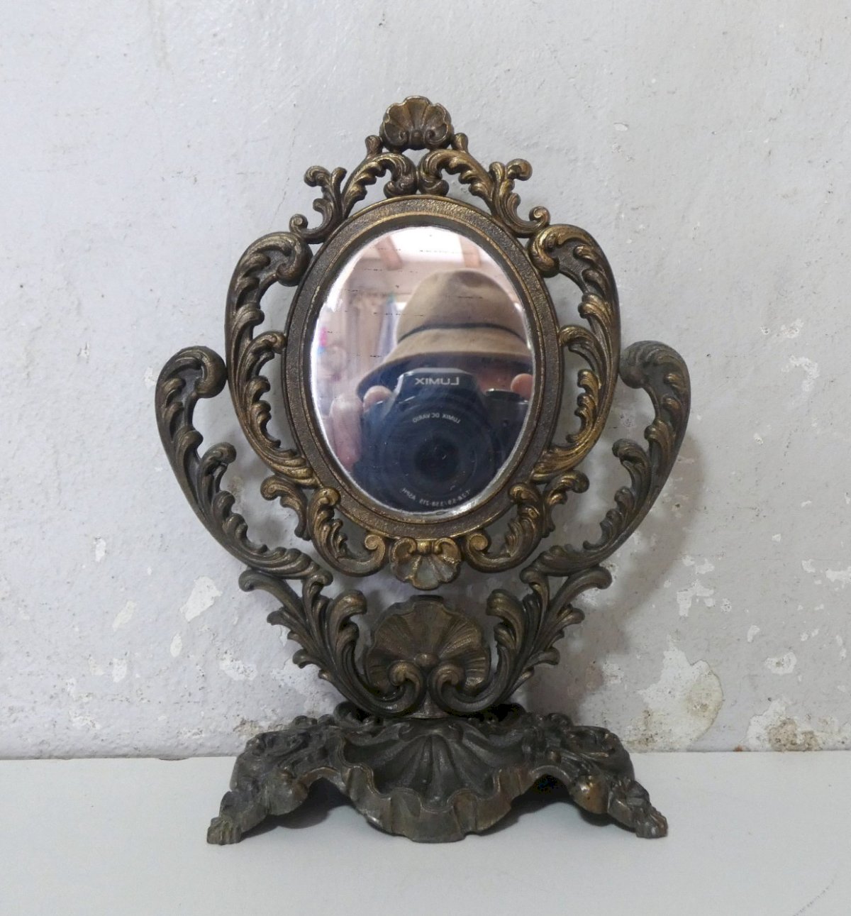 Antique table psyché mirror in Baroque style. Height: 18.5 cm. Width: 14.5 cm. Depth: 5 cm. It is made of metal with golden reflections, either bronze or spelter. Adjustable swivel top section. Very good condition, with lovely original patina.