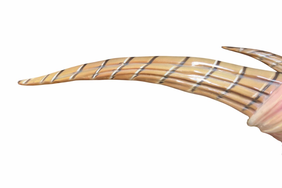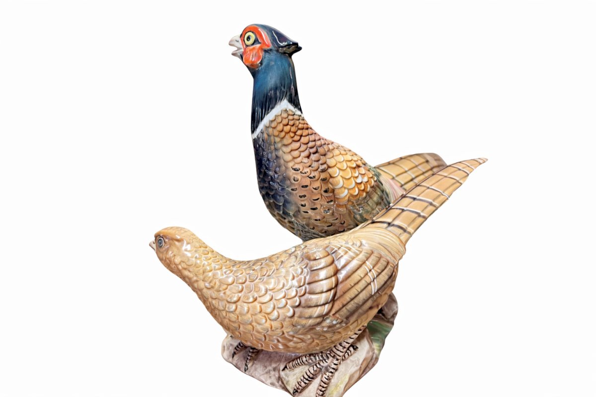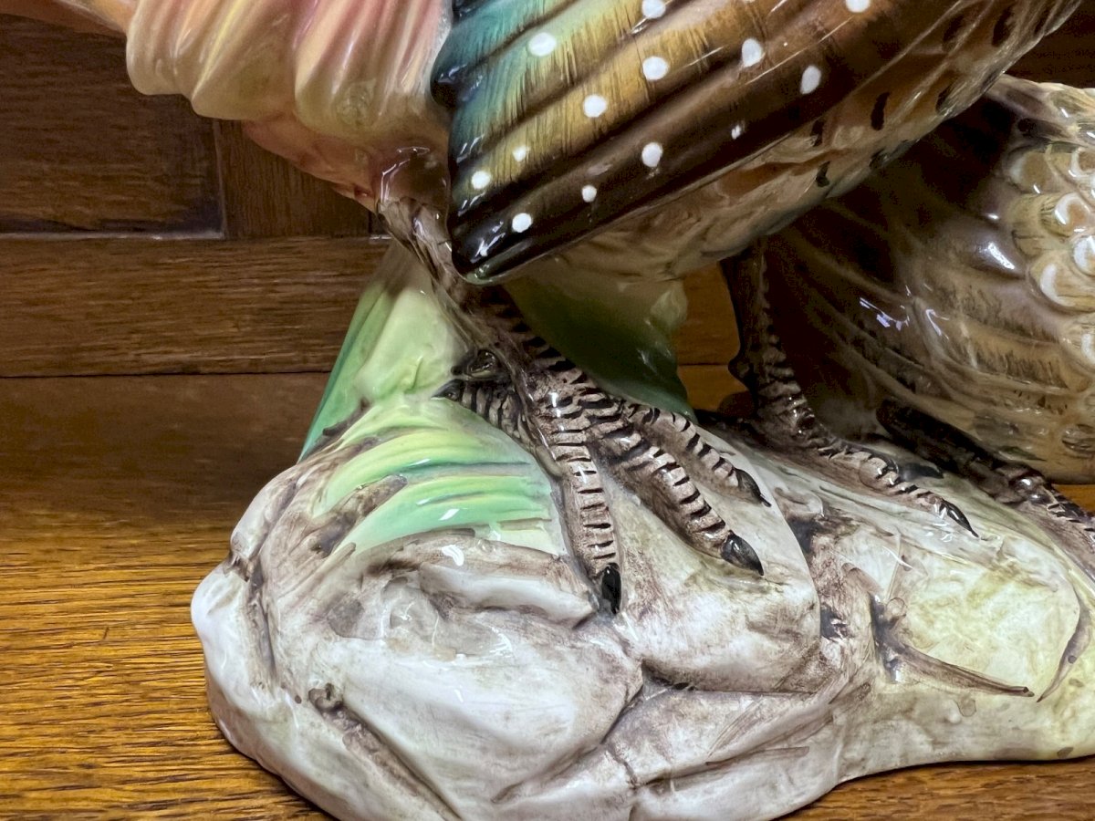 Elegant decorative group in polychrome ceramic representing a pair of pheasants, remarkable for the finesse of its modeling and the richness of its naturalistic decor. The male pheasant, majestic, displays abundant and nuanced plumage, while the female, more discreet, brings balance and softness to the whole. The scene rests on a naturalized base evoking a rocky ground, typical of high-quality animal productions from the late 19th and early 20th centuries. The piece features a partially readable circular stamp on the reverse, referencing the mention "Made in Belgium – Boch Fes – La Louvière – Belgian manufacture", as well as a model number 506. These elements allow for a very probable attribution to the Boch Frères – La Louvière factory (Belgium), famous for its ceramic and faience productions. A beautiful decorative object with character, ideal for a fireplace, console table, bookshelf, or a collector's interior fond of animal ceramics. Dimensions Length: 40 cm Width: 17 cm Height: 24 cm Period Late 19th – early 20th century Condition Good general condition considering its age. To note for transparency: old and discreet restoration on the male pheasant's tail, stable and barely visible. No other major cracks or missing parts to report. Shipping Careful and perfectly protected shipment. Shipping possible in France and internationally. Hand delivery possible depending on location. Country of origin: Belgium.