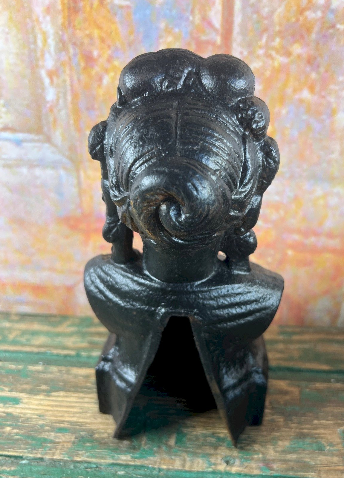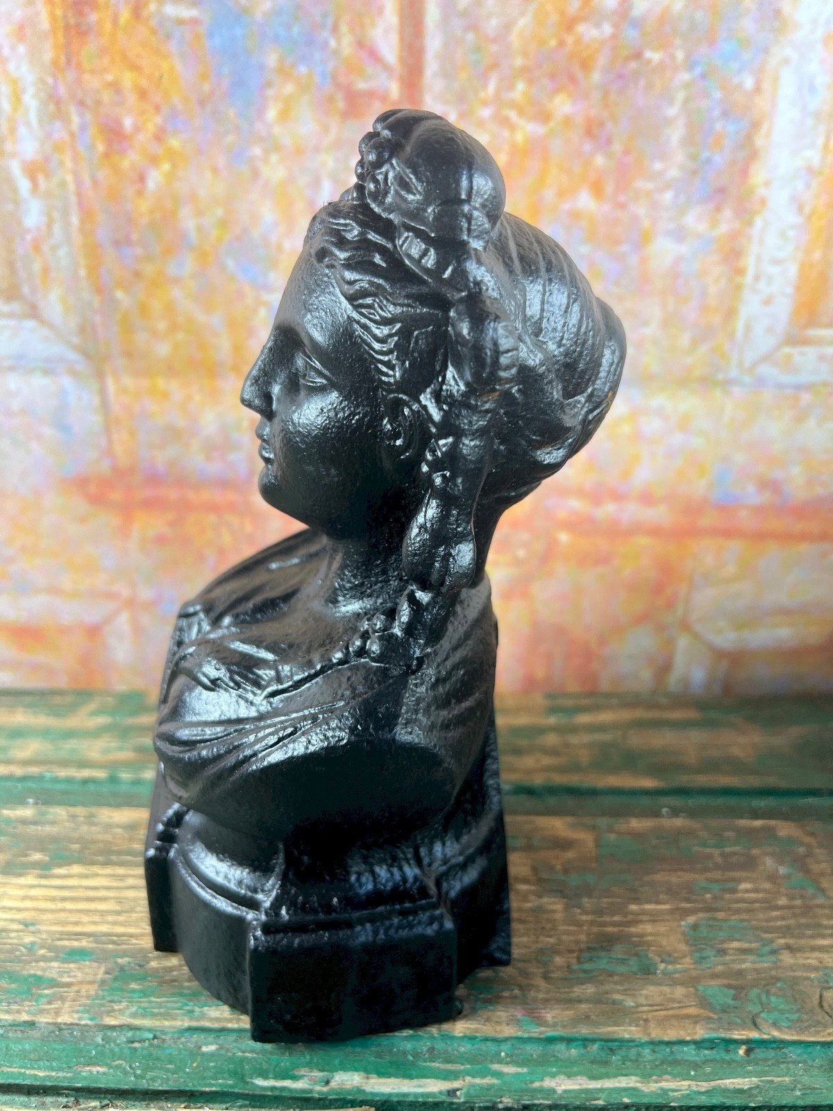 Ancient bust in black cast iron – Inscription "TERRE" – Decorative sculpture – 21 cm I offer you this magnificent ancient bust in black cast iron, a heavy, expressive piece full of presence. Modeled in a 19th-century aesthetic, this female figure adorned with flowers and braids seems to emerge from the raw material, almost like a symbol of earth, strength, and fertility — a nod to the inscription "TERRE," embossed on the base. Solid, stable, and carefully sculpted, this bust exudes an intense decorative aura: perfect for a library, an office, an artist's studio, or a curiosity cabinet. A piece that tells a story, anchors a decor, and adds weight — both literally and figuratively. Characteristics Material: Cast iron Color: Satin black Era: 20th century (19th-century style) Embossed inscription: "TERRE" Dimensions: Height: 21 cm Width: 10 cm Depth: 9 cm Condition: Very good overall condition, beautiful surface, homogeneous black patina Particularity: Open back (decorative molded model) For what decor? This sculpture naturally finds its place in: • a vintage or industrial interior • a library or office • an artistic setting • a setting of chateau, artist's workshop, or natural history cabinet It anchors a space. It tells a story. It gives a soul. Shipping Fast, secure, and perfectly protected shipping. International tracking available. Authenticity: Original Weight: 1 Period: 20th century and contemporary Height: 21 cm Material: Cast iron Characteristics: Cast iron Length: 9 cm Width: 10 cm Artist: Unknown Type: Bust Brand: Unknown Country of origin: France Style: 19th century / Classic Dimension (cm): From 10 to 30 Theme: Woman / Female figure
