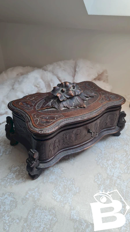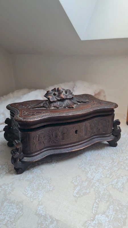 Above €25, please choose a carrier if possible. Take the opportunity to buy in bulk: 5 items - 10% 10 items - 20% 20 items - 30%. Be sure to check the photos for imperfections. Jewelry box sold with its key. The foot has been glued. Dimensions: Height: 12 cm, Width: 20.5 cm, Depth without the key: 12 cm. #jewelrybox #gift #chic #collection #antique #antiquejewelrybox #blackforestjewelrybox #napoleoniii #napoleoniii #blackforest...