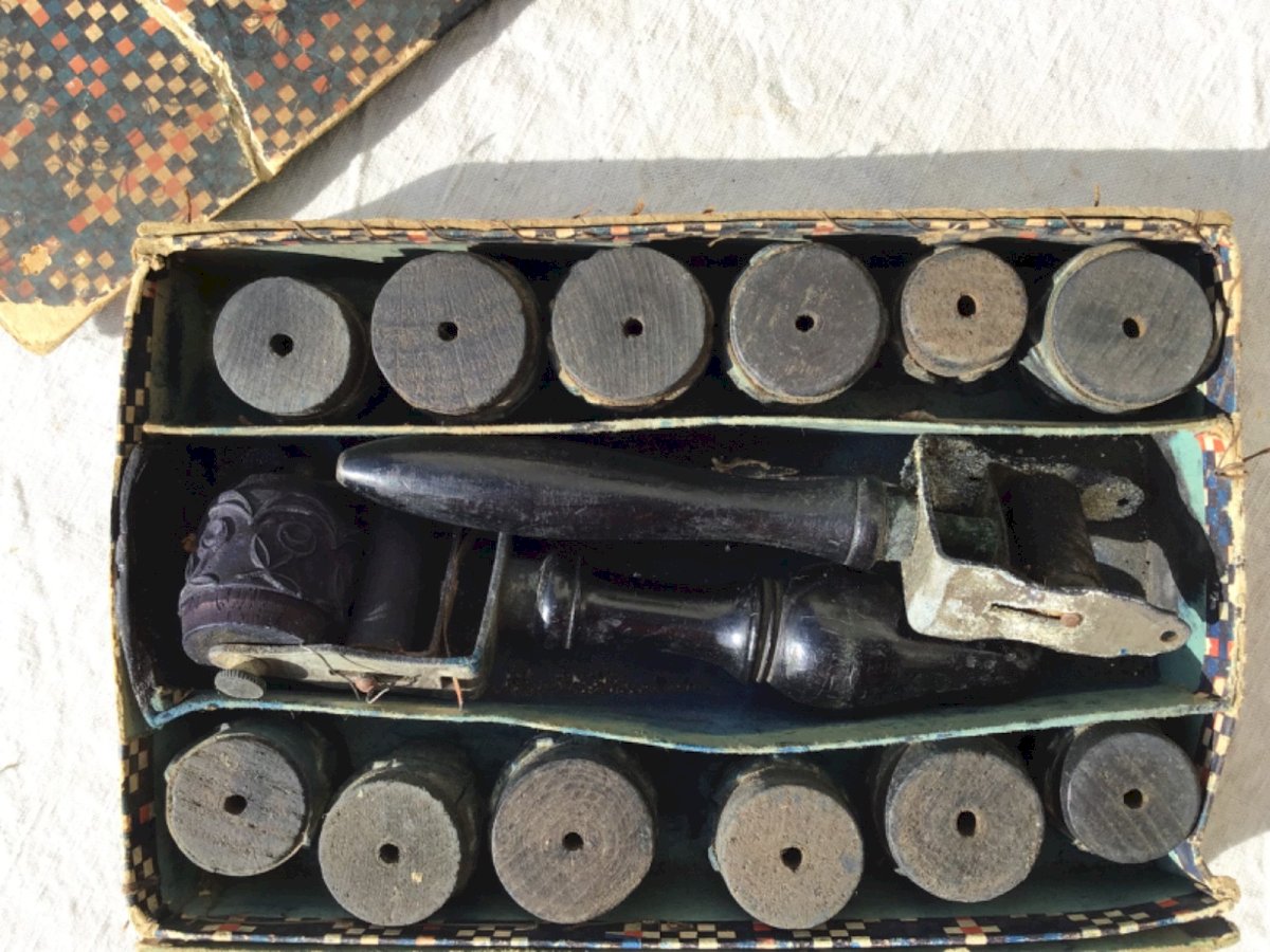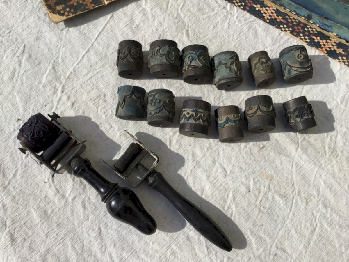 Vintage wooden lace stamps with 12 different roller border stamp designs and 1 rolling device, all in a cardboard box. Chocolate color with signs of wear. More photos and information upon request. Condition: Used item. Check the seller's description for more details... Used item with potential imperfections.