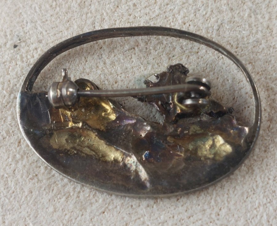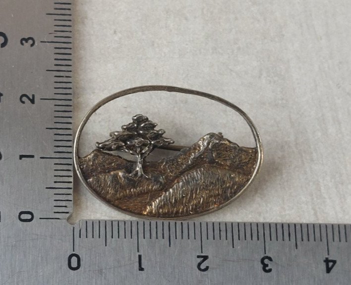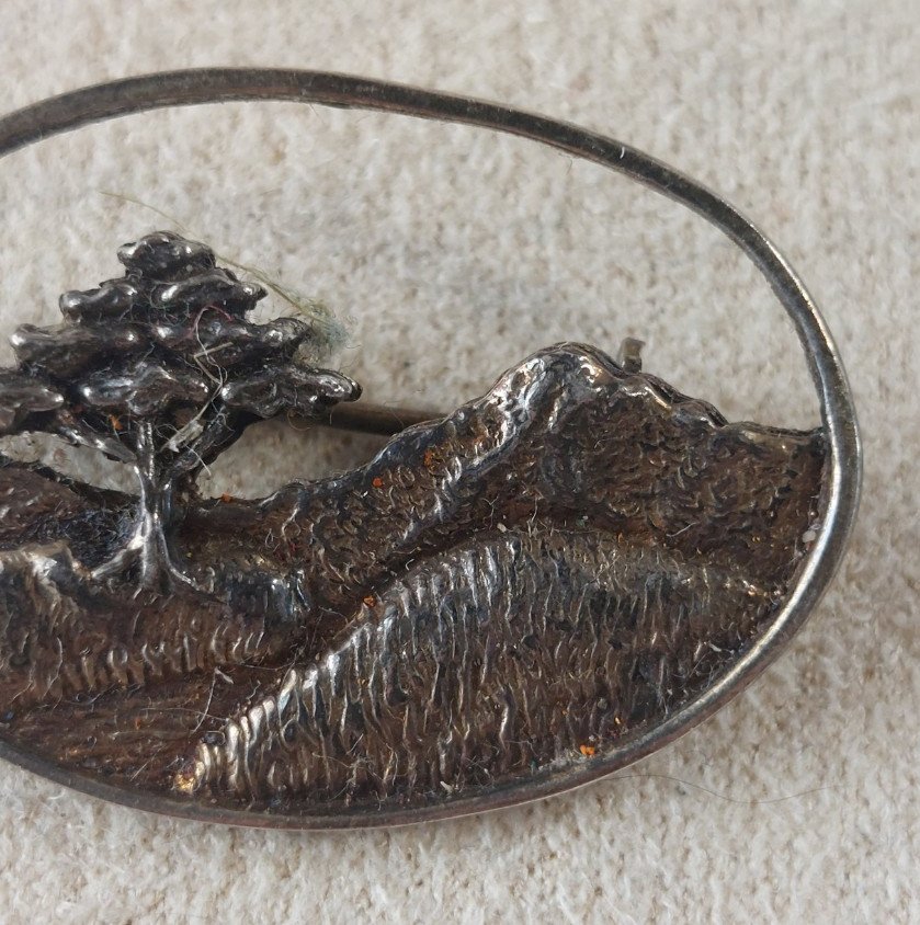 Antique brooch, landscape design with tree, made of solid silver in good condition marked 925 dimensions 3 cm X 2.1 cm weight 4.35 g see photos Check my other items! Shipping costs reduction for combined purchase Condition:Used Item that has been worn. any imperfections. Metal purity: 925 parts per 1000 Metal: Solid silver
