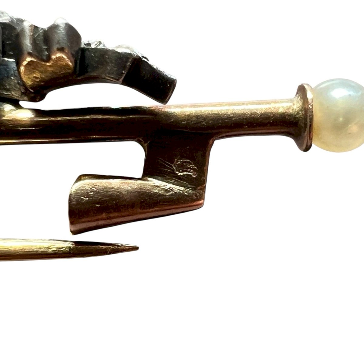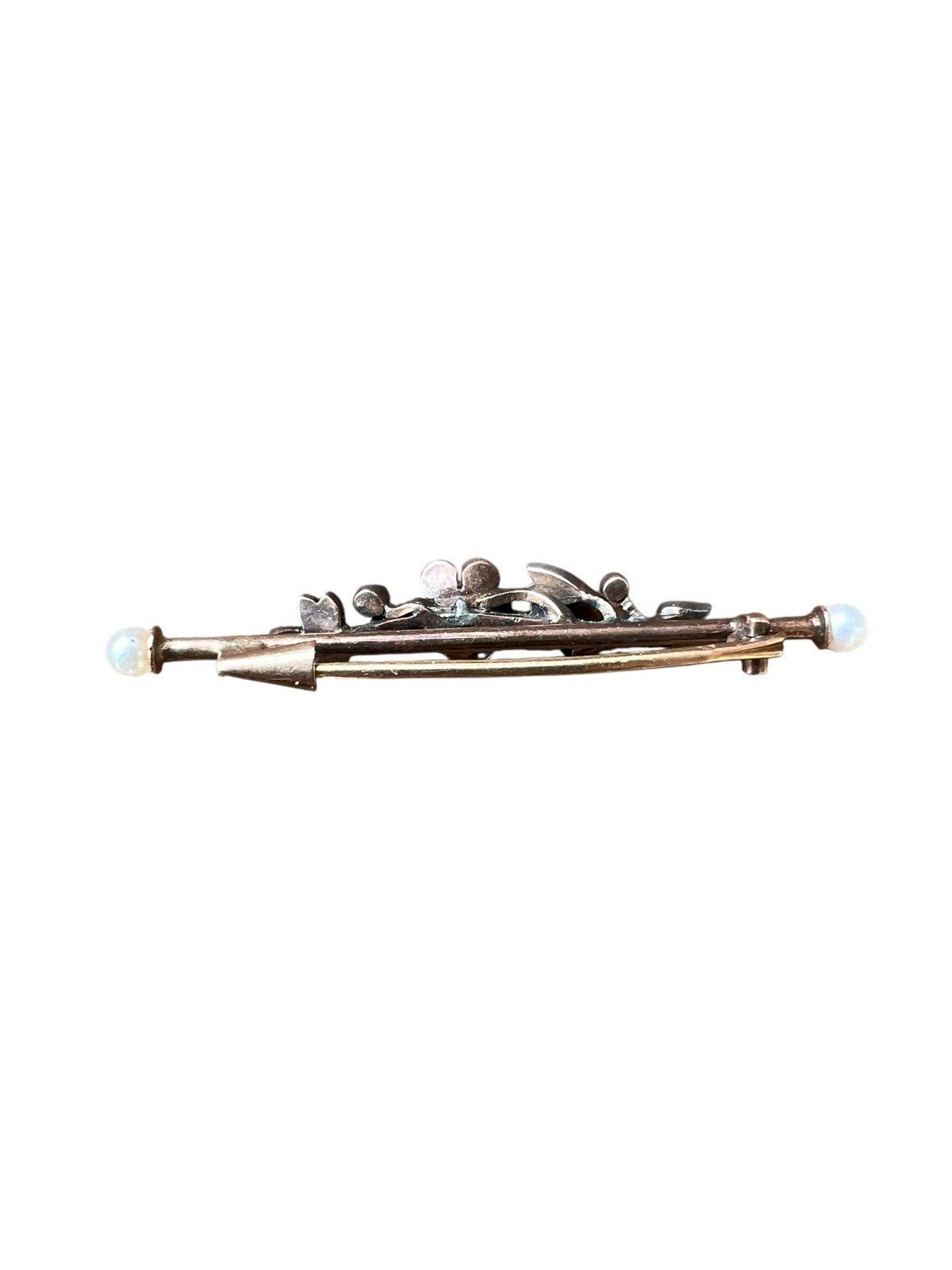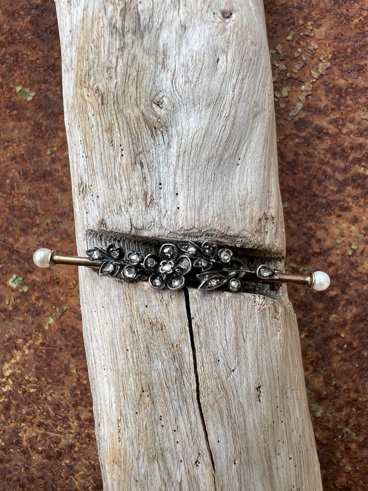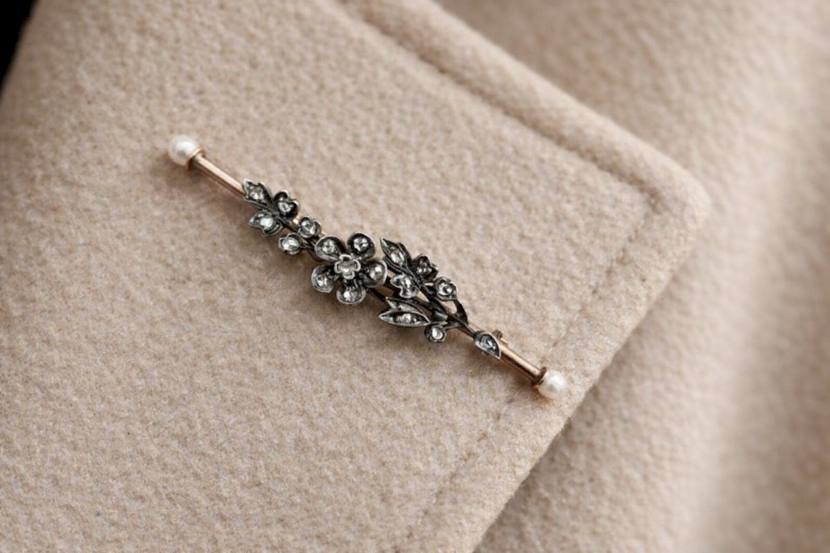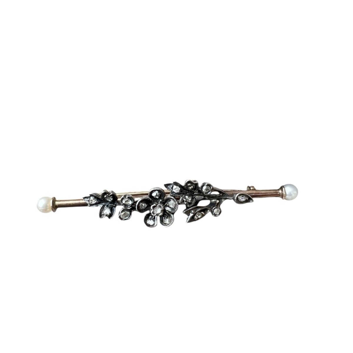 Antique 19th-century brooch with a floral design, made using traditional techniques of antique jewelry. The flowers are set with small natural rose-cut diamonds, old-cut diamonds, mounted in silver, a common practice at the time to enhance the brilliance of the stones. The setting of the brooch is made of gold, stamped with the eagle head at two places (see photos), guaranteeing gold up to 18 karats. Each end is adorned with a small natural fine pearl, providing an elegant and balanced finish to the whole piece. This antique brooch is in very good condition. Due to the relief and weight of the floral motifs, it is advised to wear it on relatively thick fabric to prevent it from slightly pivoting. Antique brooch, 19th century, old gold and silver jewelry, rose-cut diamonds, old diamonds, fine pearls, antique jewelry. Dimensions: approximately 5 cm long and 0.8 cm wide. Weight: 4.16 g. Please read the description carefully and check the dimensions before purchasing. The photos are an integral part of the description and help assess the condition of the item. Antique or vintage jewelry that has been worn: slight traces of use may be present. Careful and well-protected shipping after payment. Condition: Second-hand: Item that has been worn. ...Second-hand: Item that has been worn. potential imperfections. Dominant stone: Diamond Type: Brooch Brand: Antique Brooch Country of origin: France Dominant color: Golden Material: Pearl Metal: Yellow gold