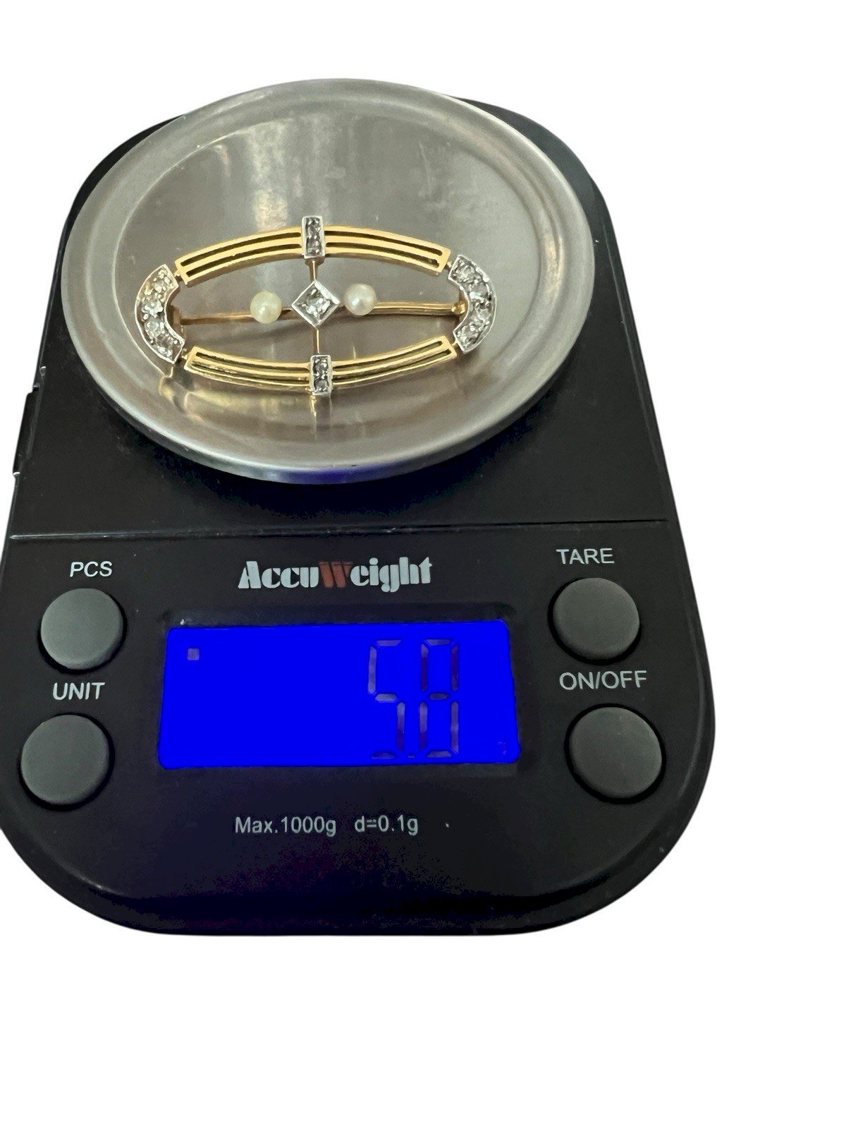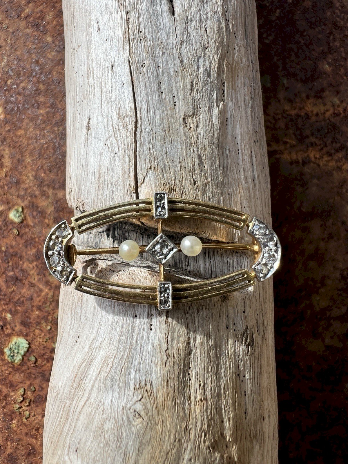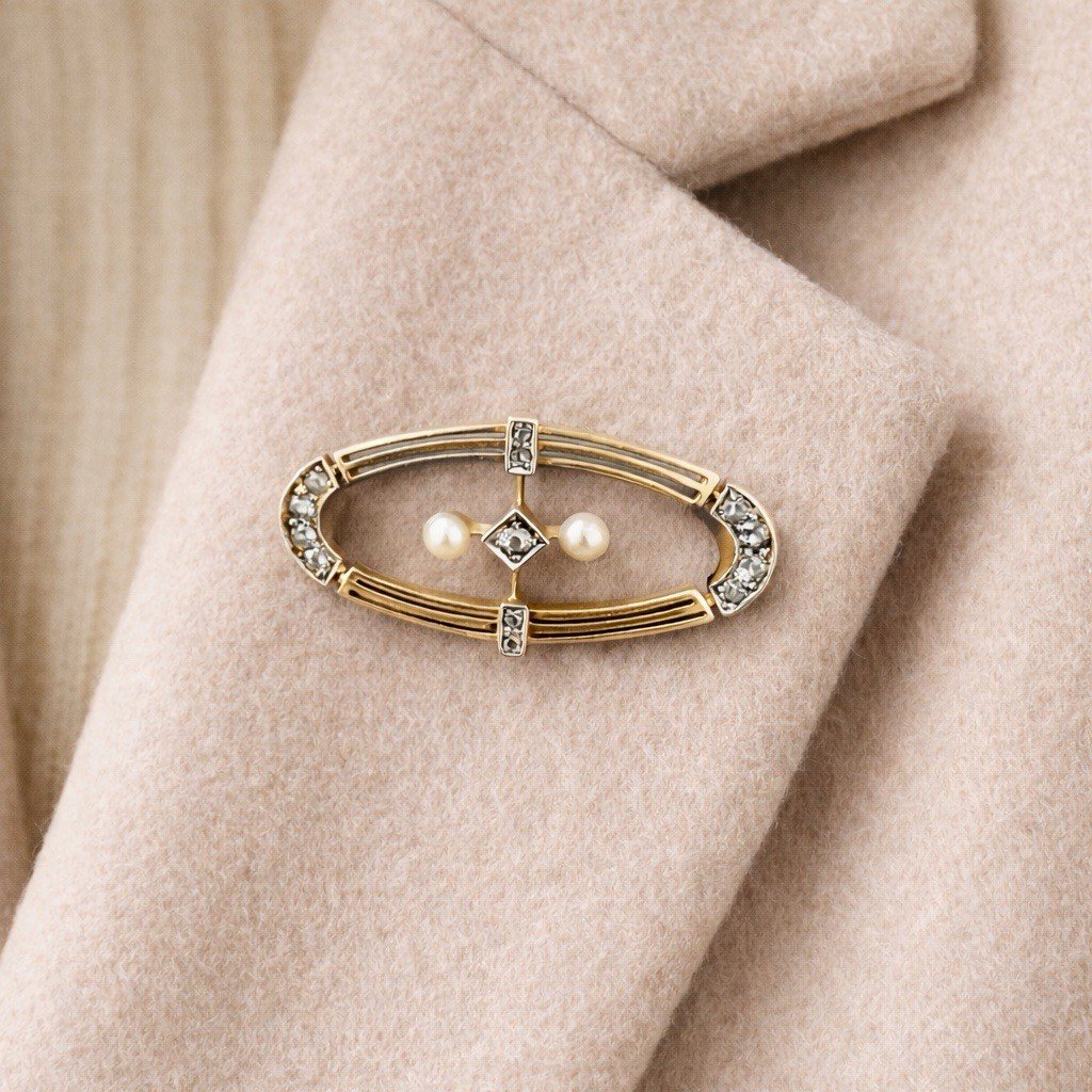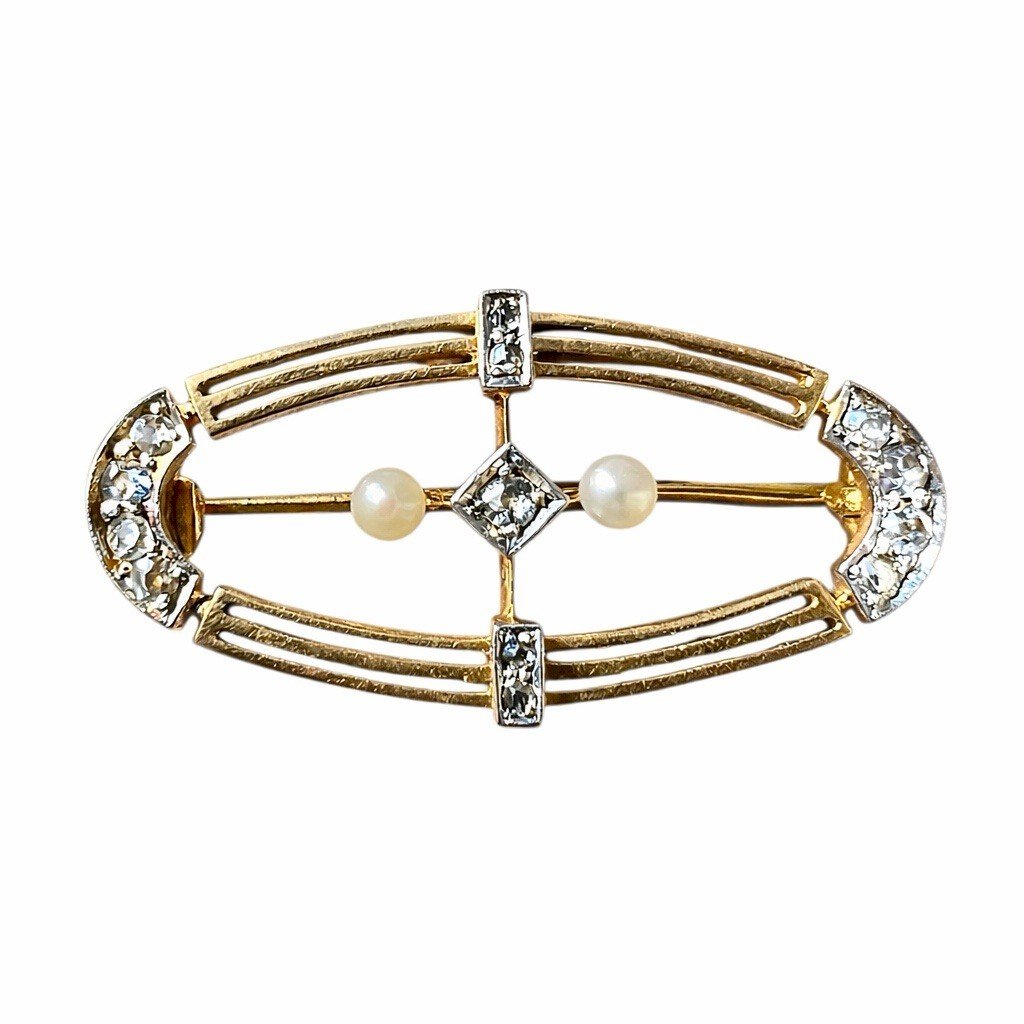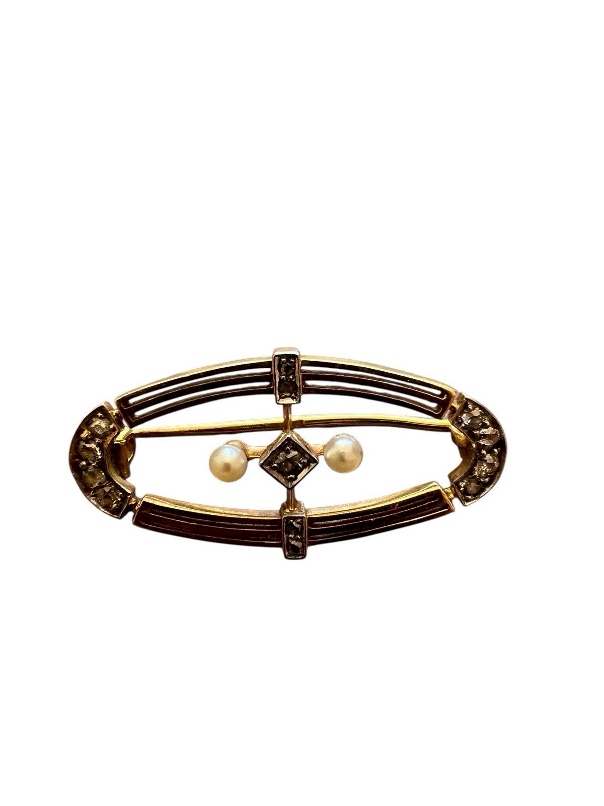 Antique Brooch Pearls 18 Carats. Delightful Belle Époque brooch from around 1910 in 18-carat yellow gold with an openwork and geometric design. This delicate piece is centered with an old-cut diamond flanked by two fine pearls. The ends and axes are set with old-cut and rose-cut diamonds for a subtle brilliance. The brooch features a partially worn warranty hallmark on the clasp, while the pin is marked with an owl hallmark. It measures approximately 3.5 cm long and about 1.6 cm wide, weighing a total of 5.8 g. An antique jewel of great finesse, typical of early 20th-century jewelry craftsmanship. Please read the description carefully and check the dimensions before purchasing. The photos are an integral part of the description and allow you to appreciate the condition of the item. Antique or vintage jewelry that has been worn: slight signs of use may be present. Careful and well-protected shipping after payment. Condition: Used: Item has been worn. ...Used: Item has been worn. potential imperfections. Dominant stone: Diamond Type: Brooch Brand: Antique Brooch Dominant color: Gold Material: Pearl Metal: Yellow gold