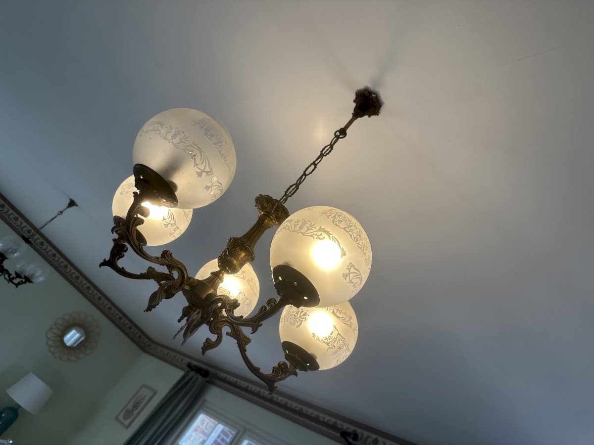 Equipped with 5 original engraved opaline glass globes, diffusing a soft and elegant light.