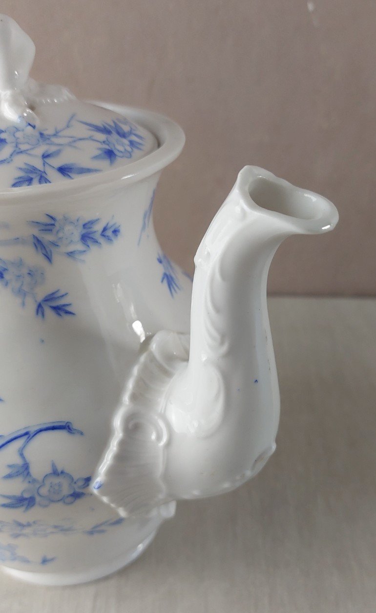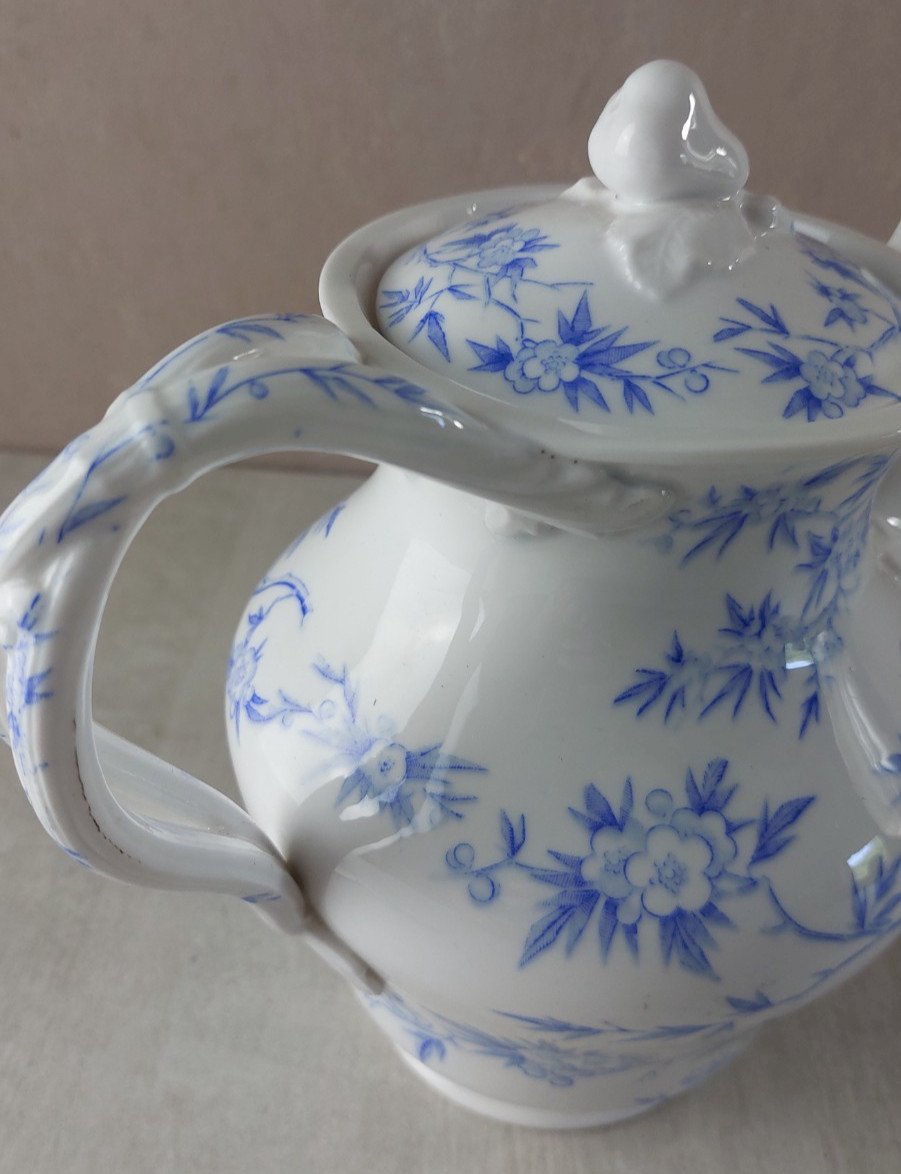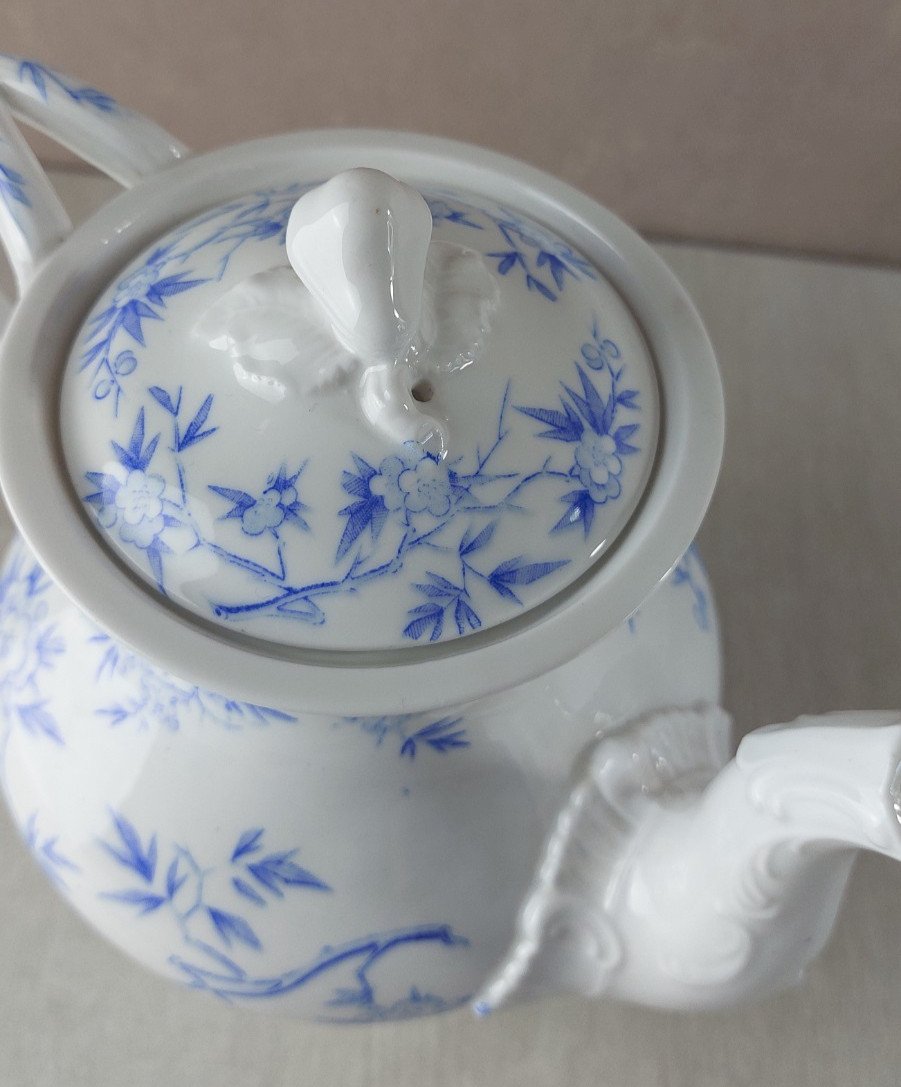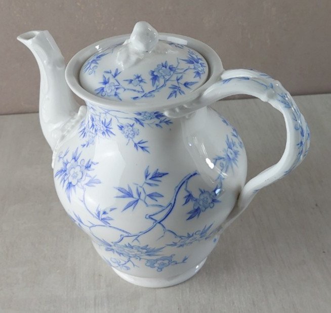 Old coffee pot / teapot, porcelain from Sarreguemines, blue thorns in good condition, no cracks or chips, green signature, porcelain from Sarreguemines, diameter at widest point 13.6 cm, height with lid 20 cm, see photos. Check my other items! Reduced shipping costs for combined purchases.