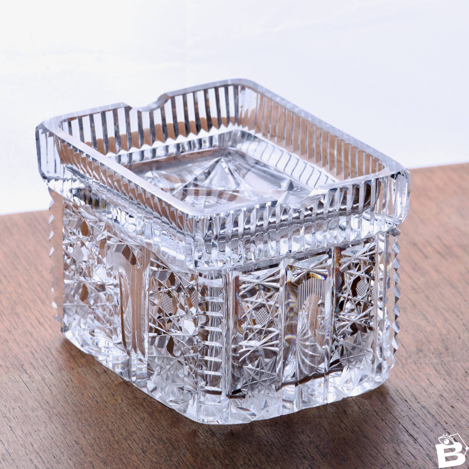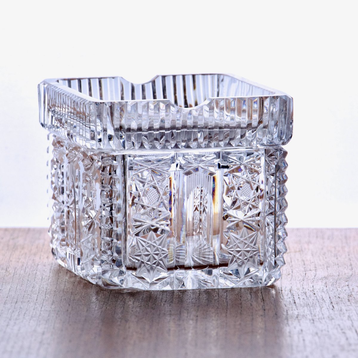 Elegant antique crystal box (an old snuffbox that you can use as a jewelry box, for example, or use it as such, of course), from the late 19th to early 20th century. Rectangular shape with softened corners, thick crystal of great clarity with a high refractive index creating significant light effects. Panels with queen's lace cut, in 8-pointed stars alternating with diamond point cutting and vertical fluting. Removable lid with double cigarette notch. Edge with regularly spaced crenel cuts. Top of the lid matching the patterns of the body. Sharp edges, wheel-polished. Of good size, it is heavy, high-quality crystal. In very good condition. ? 12 X 10 X 8.5 cm. ✨ Very careful shipping. ✨ We have other listings online, feel free to take a look! 11/25. L: 12 W: 8 H: 10