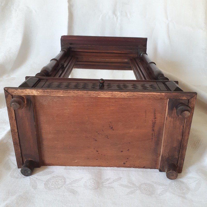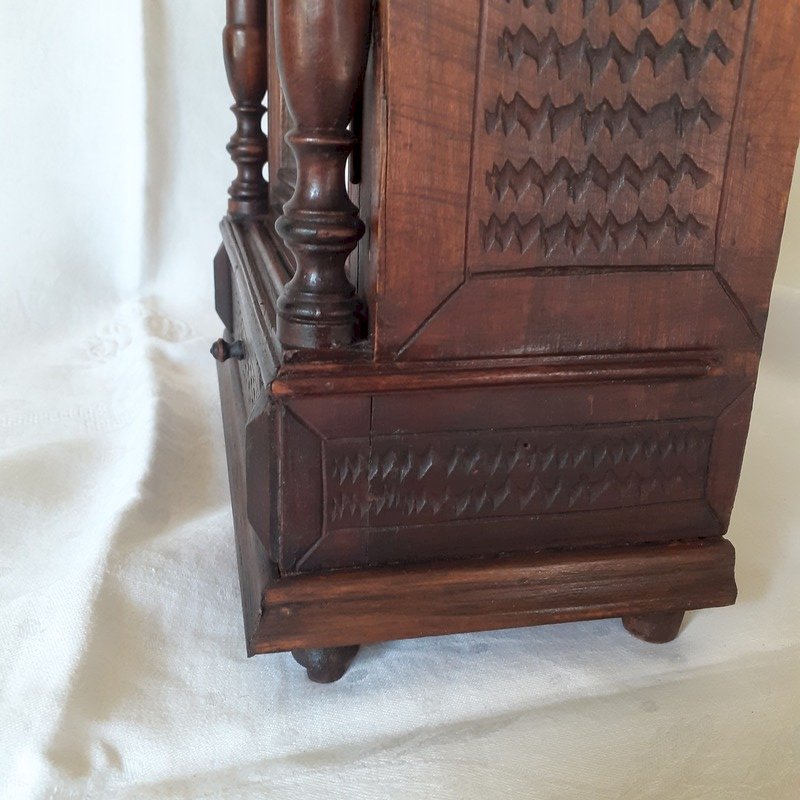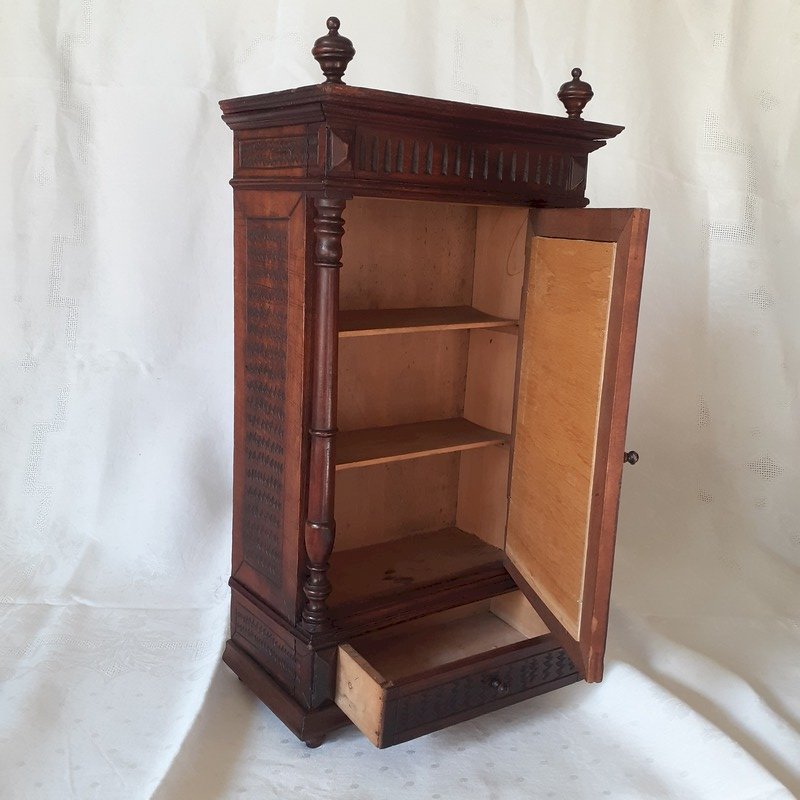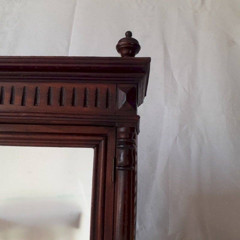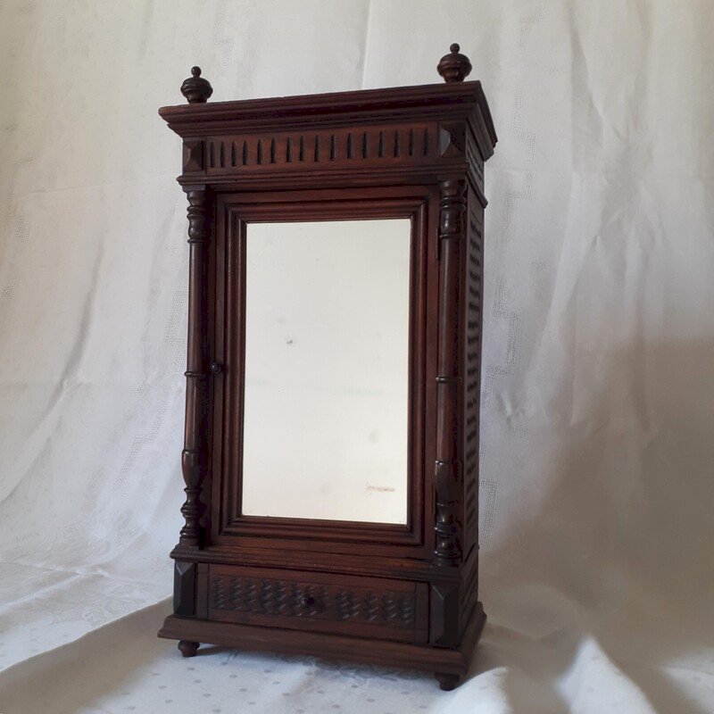 Adorable doll cabinet from the 1900s, made of beech, in very good general condition, harmonious, with one door featuring a mirror, two detached columns, and a pant drawer. It is missing its central pediment, the trace of which is still visible on the top. The interior is clean and healthy with its two shelves.