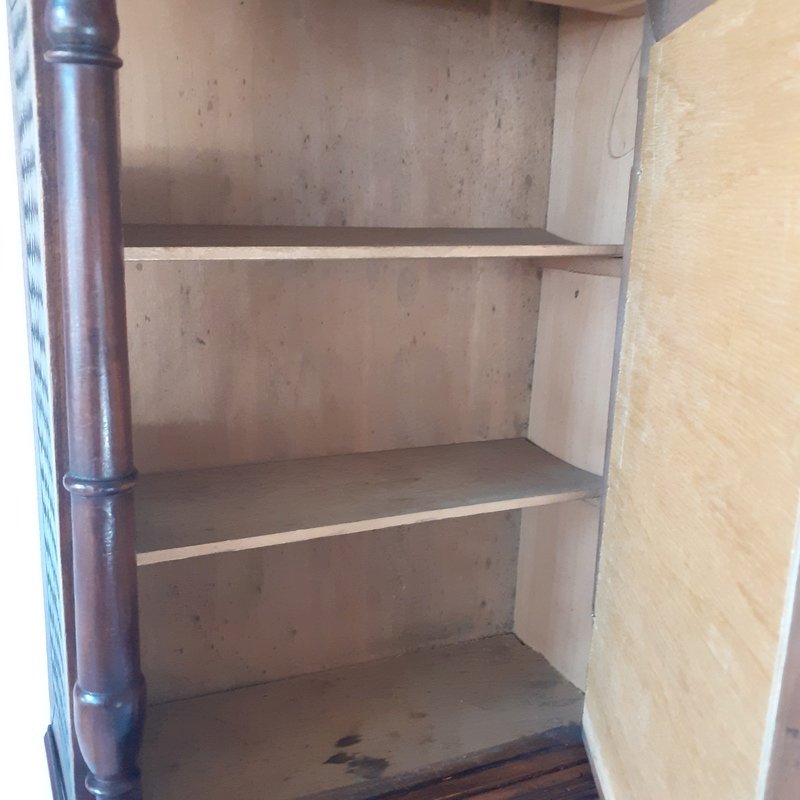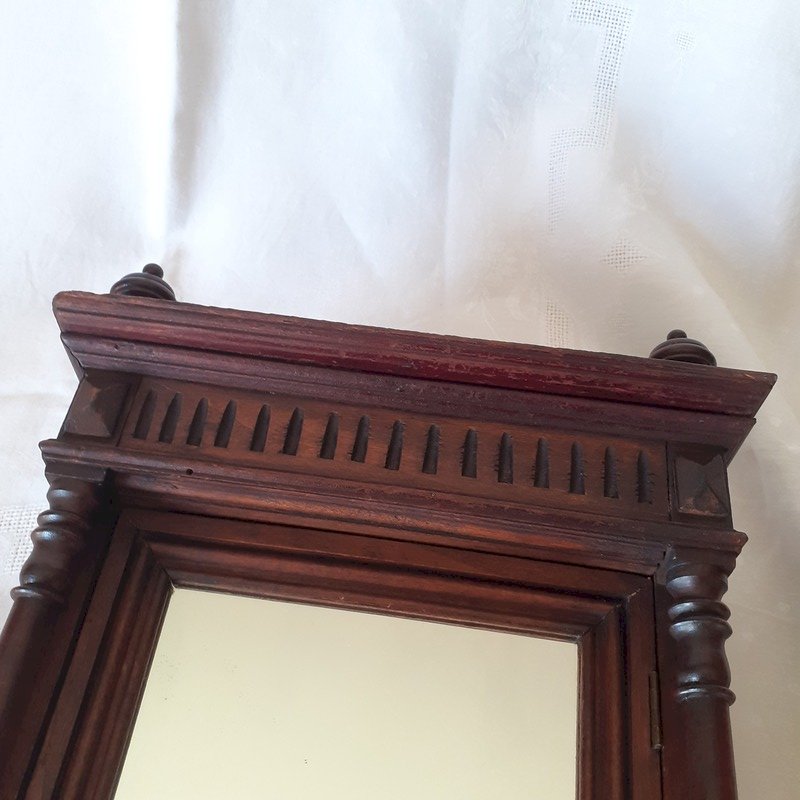 Please note a few small defects: the mirror's silvering has two marks photographed at the bottom right and the center on the left, some old traces of wood-eating insects treated, a slight old lack on the door handle, a missing piece on the cornice and the crossbar on the right side, and small losses at the top of the cornice on the left side (all well photographed).