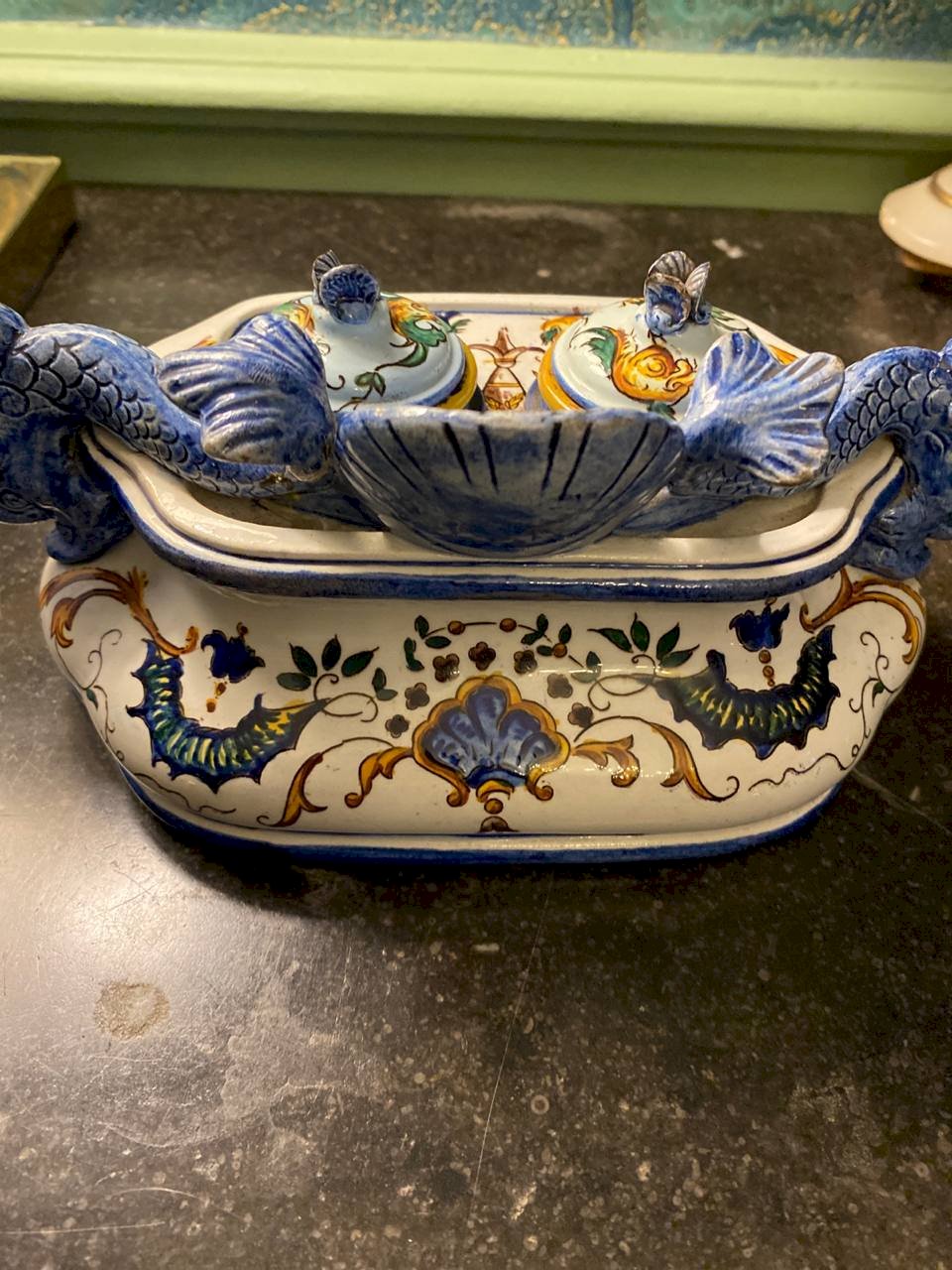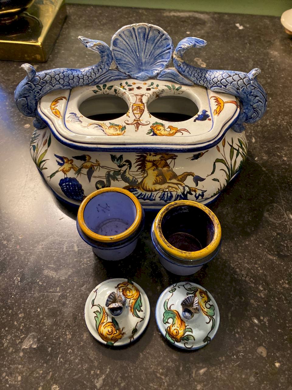 This antique piece in earthenware, marked Gien on the base, belongs to those office objects designed at a time when use did not exclude attention to form.