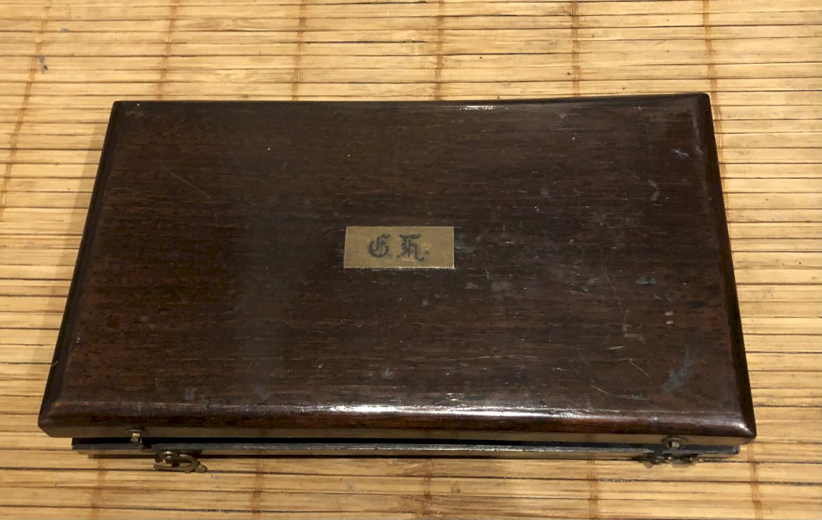 Vintage wooden drawing instrument box with compass, the box is complete. Dimensions 20X11 cms.