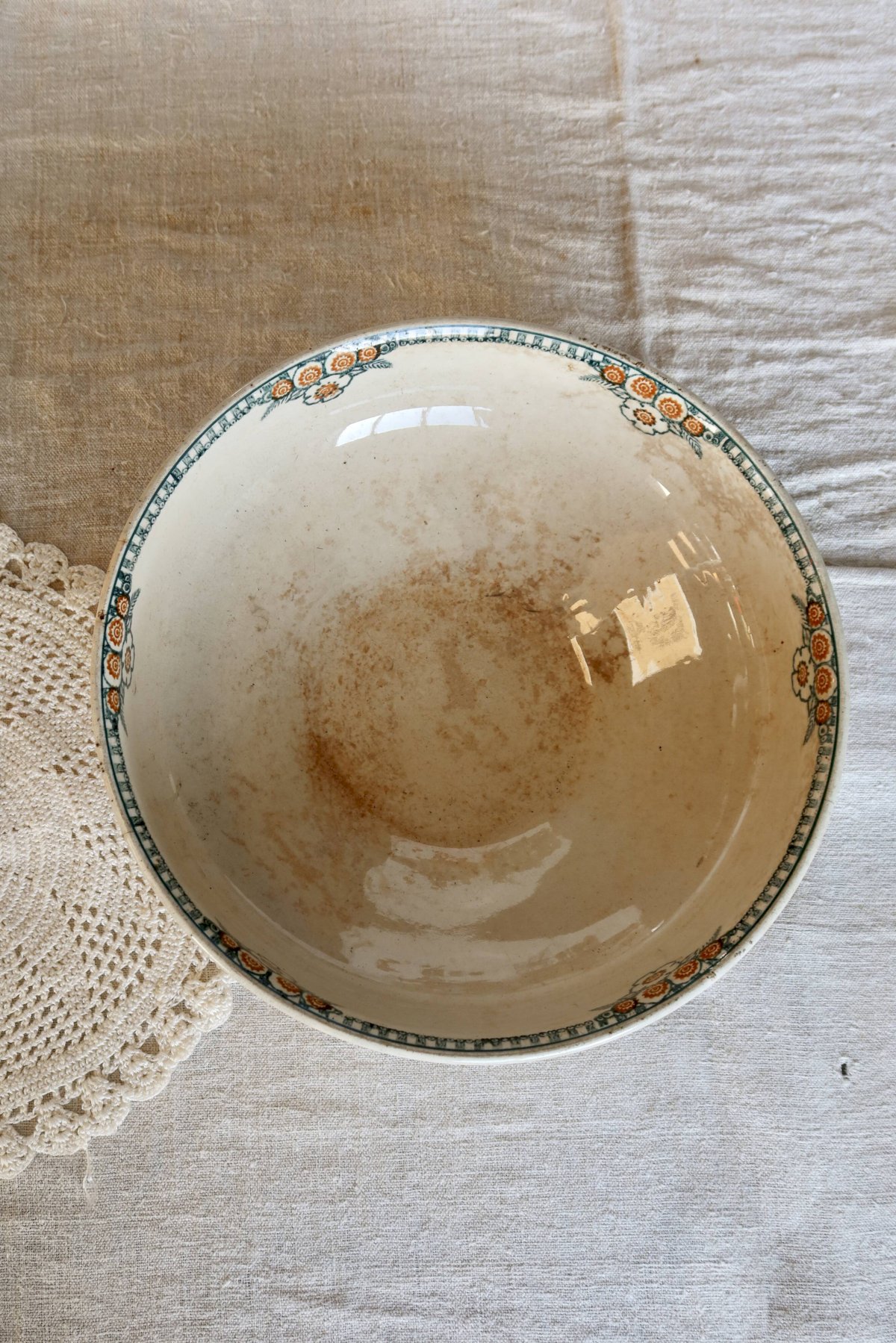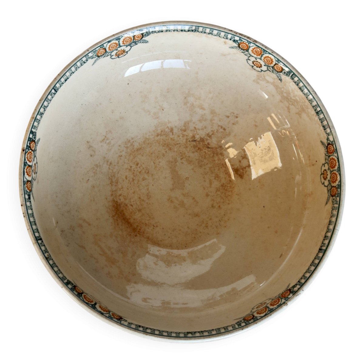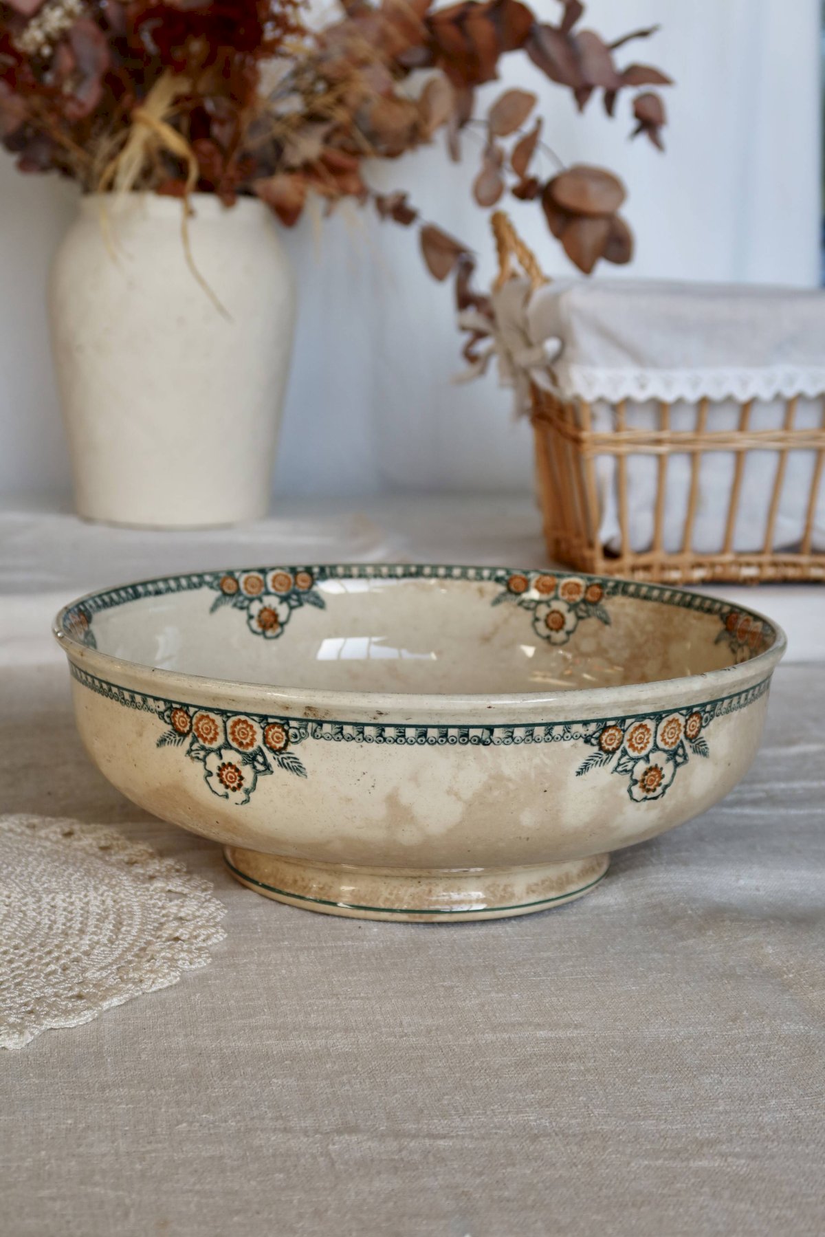 Footed bowl in earthenware, with a green geometric frieze and patterns of small orange roses, featuring a beautiful patina inside and out. Signs of age and uniform micro-cracks that give it all its charm (some signs of use, irregular glaze, see photos) Dimensions: 27cm X 8cm. L: 27 W: 27 H: 8