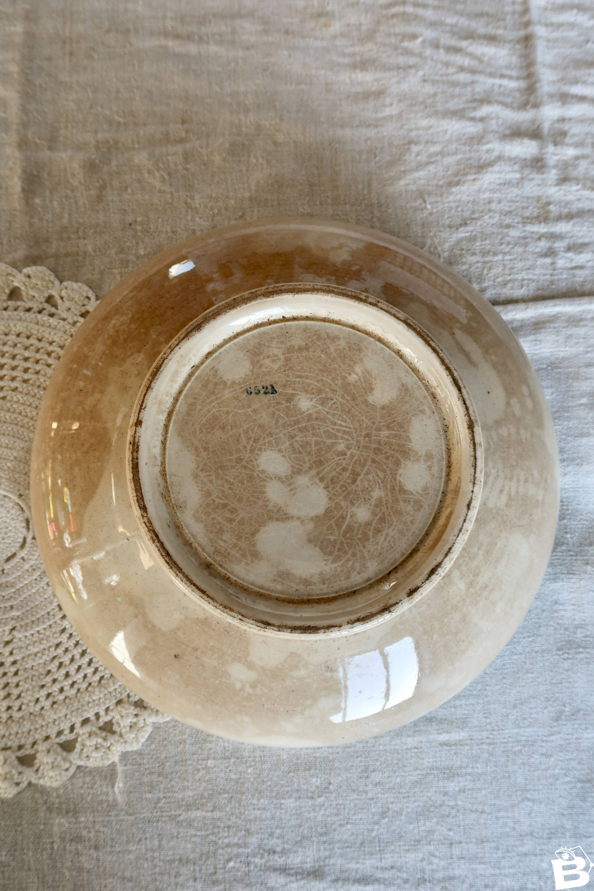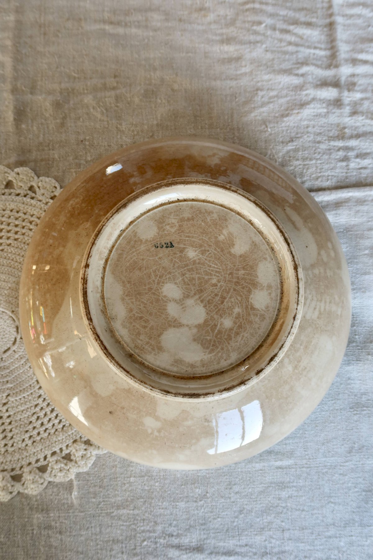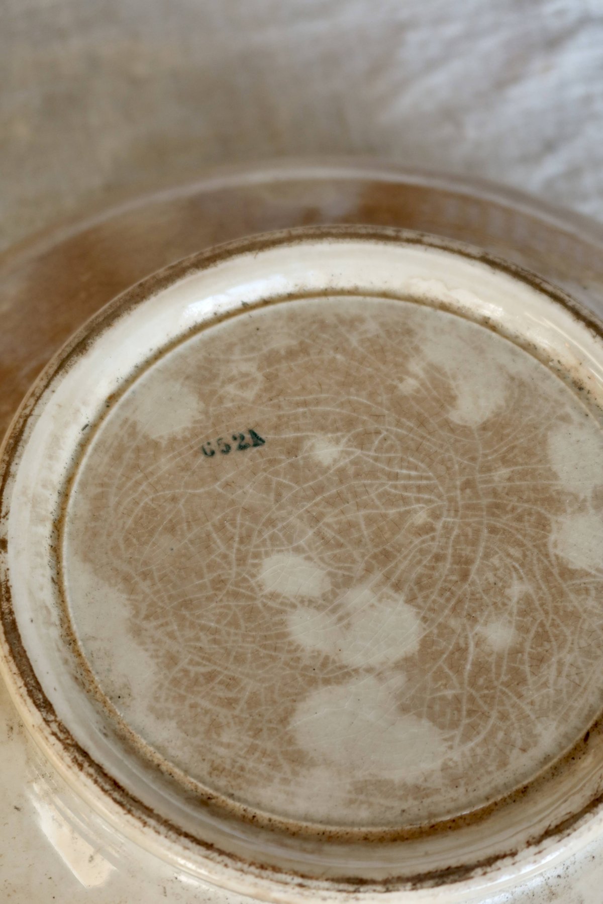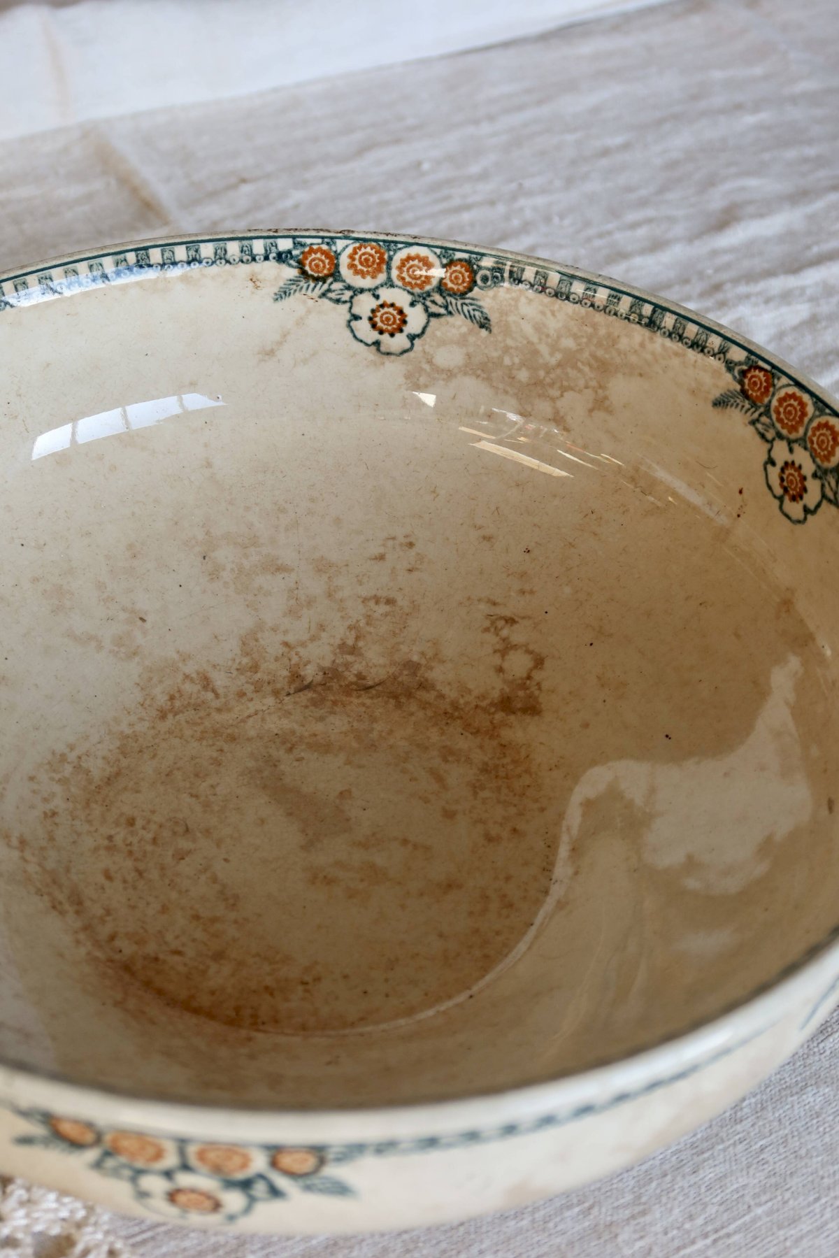 Footed bowl in earthenware, with a green geometric frieze and patterns of small orange roses, featuring a beautiful patina inside and out. Signs of age and uniform micro-cracks that give it all its charm (some signs of use, irregular glaze, see photos) Dimensions: 27cm X 8cm. L: 27 W: 27 H: 8
