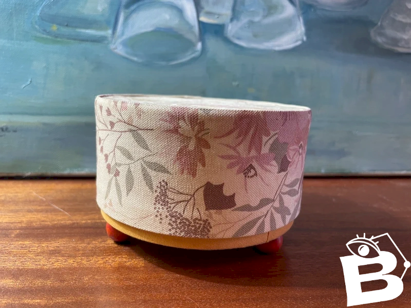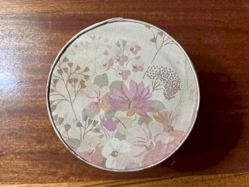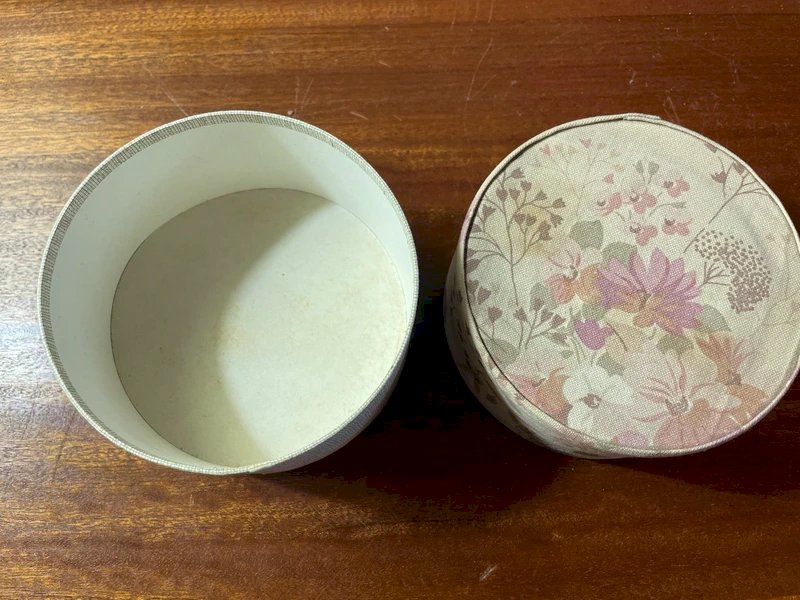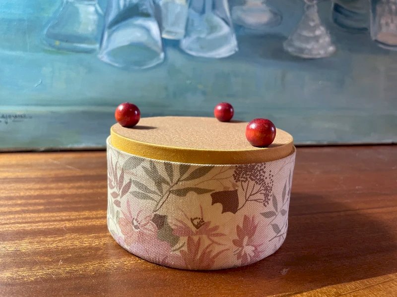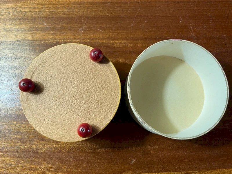 Pretty cardboard box and old fabric with 3 small round wooden feet. Very good condition. Diameter 12.3 cm, height 8 cm.