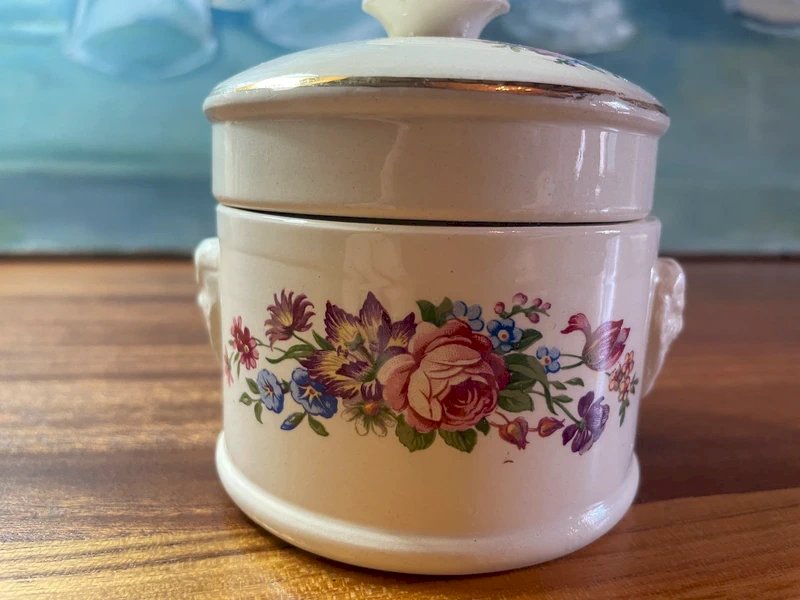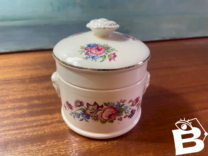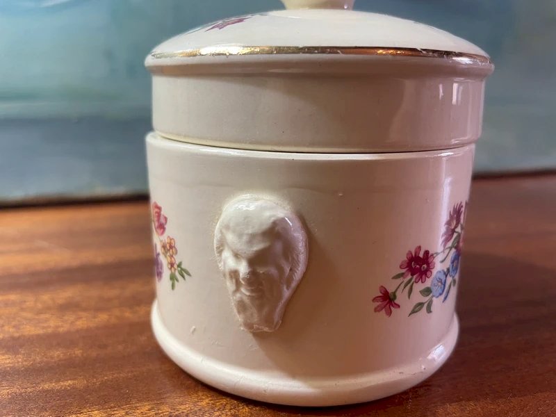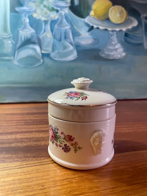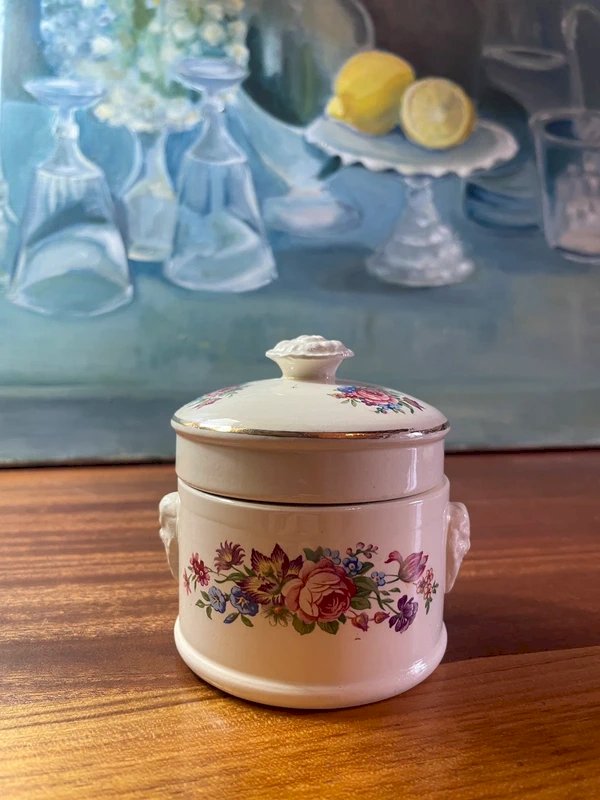 Small antique foie gras pot, pottery from Sarreguemines. Can be used for other purposes, candy jar, jam pot, or to store some jewelry. Very good condition, beautiful shine, no defects. Height 9.5 cm, diameter 8 cm, weight 380 g...