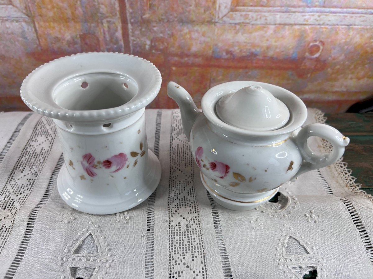 Antique white porcelain herbal tea set with hand-painted floral decor, consisting of its teapot and matching warmer. The decor, delicate and romantic, combines pink flowers and foliage enhanced with subtle golden touches, typical of European productions from the late 19th or early 20th century. This type of tea set was designed to keep infusions warm with a candle placed in the warmer, and it perfectly fits in a shabby chic interior, charming decor, or a collection of antique tableware. ⚠️ Condition Overall good condition for an antique item Note: small chip on the lid (visible in the photos) Signs of use and slight wear typical for age ➡️ Defect considered in the price Dimensions Diameter: 11 cm Total height: 20 cm Details Material: porcelain Decor: hand-painted floral Estimated period: late 19th – early 20th century Sold as is, consistent with photos Decorative object full of charm, ideal for lovers of antique porcelain, tea sets, or romantic decor. Authenticity: Original Type: Tea set Origin: France Country of origin: France Subtype: Tea warmer Material: Porcelain Style: Napoleonic, Empire