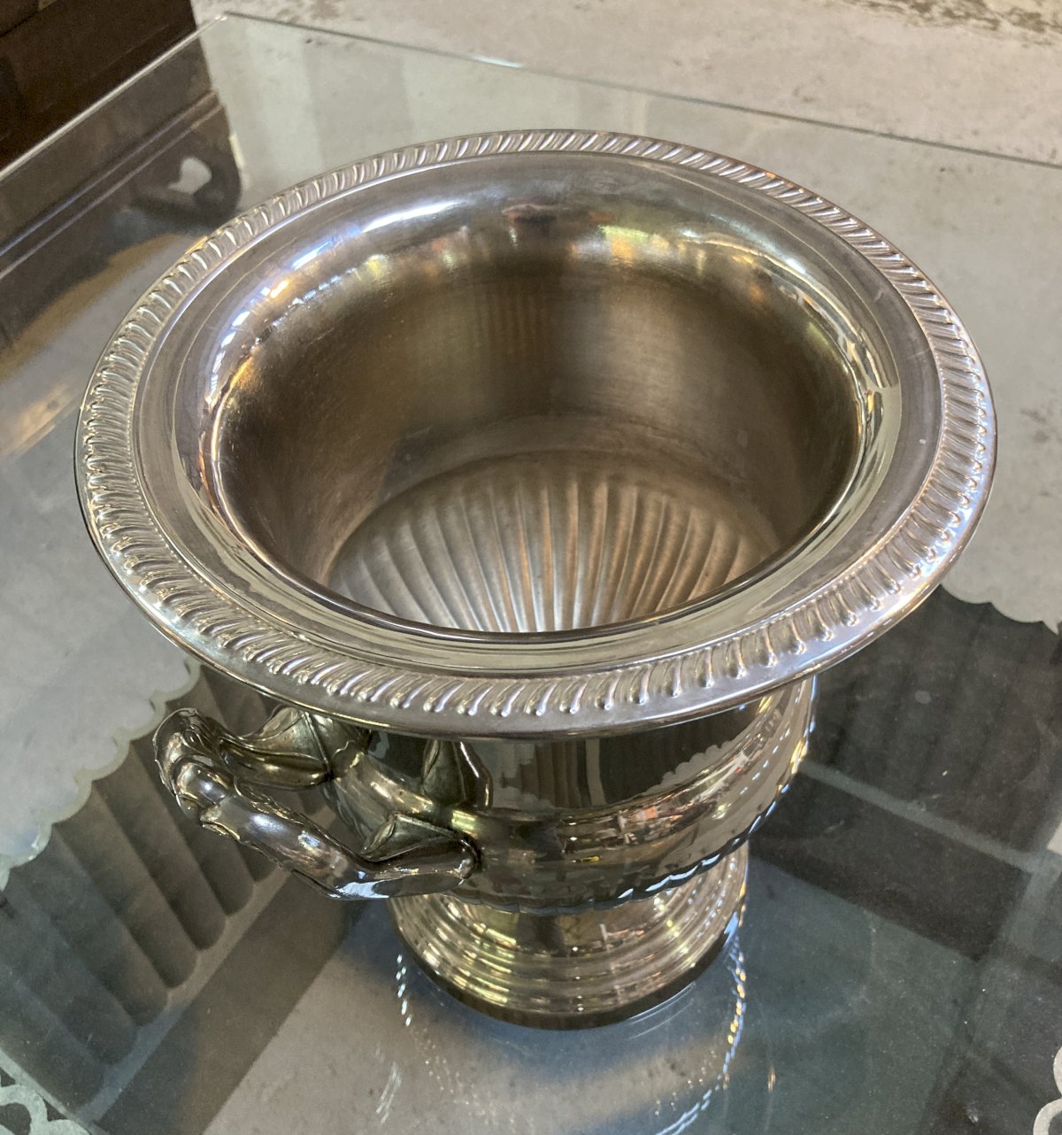 Antique ice bucket or champagne bucket - silver-plated, very good condition, Diameter of the top part 23 cm x H25 cm. Diameter of the base 15 cm. A slight tilt of the corolla gives it an extra charming touch.