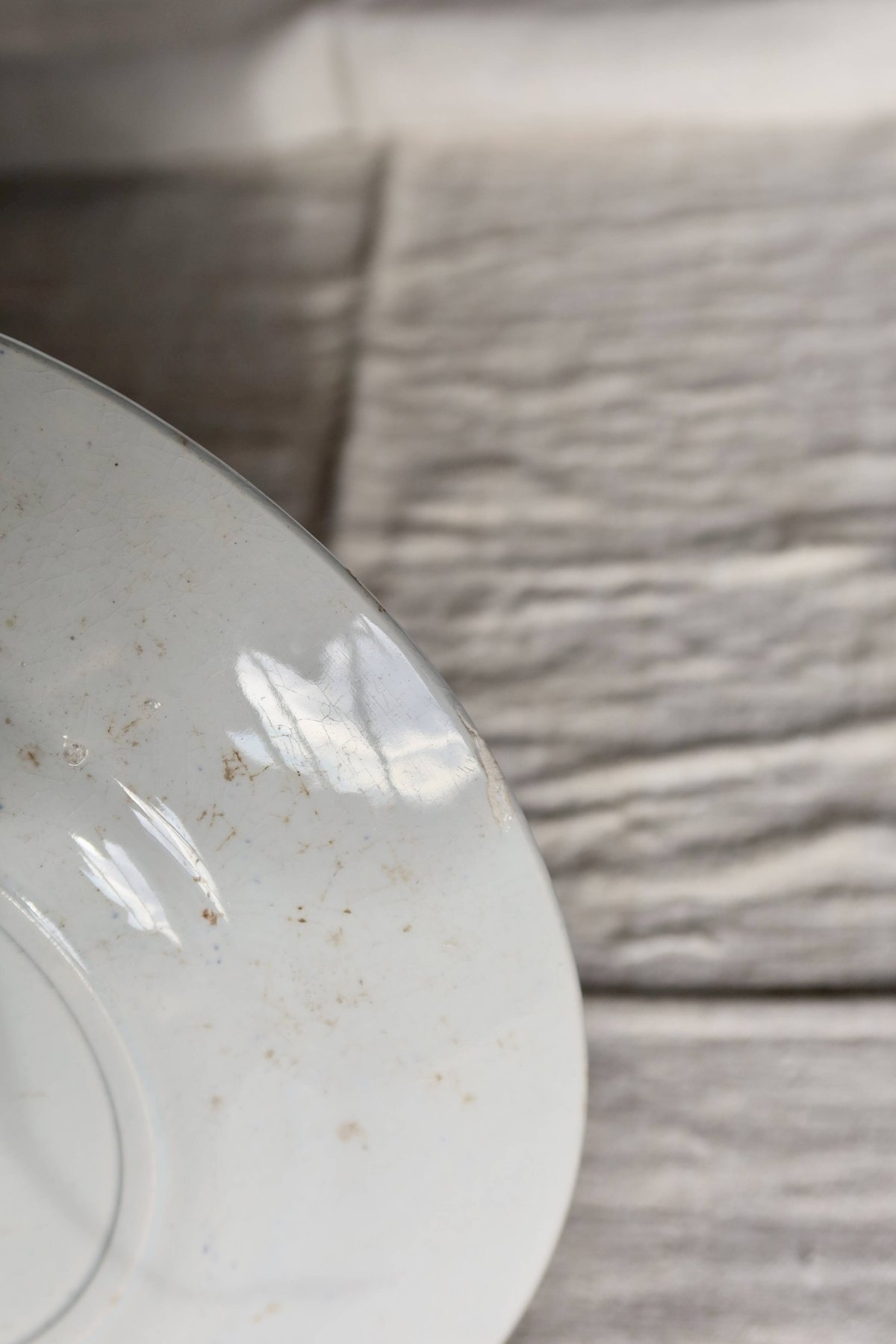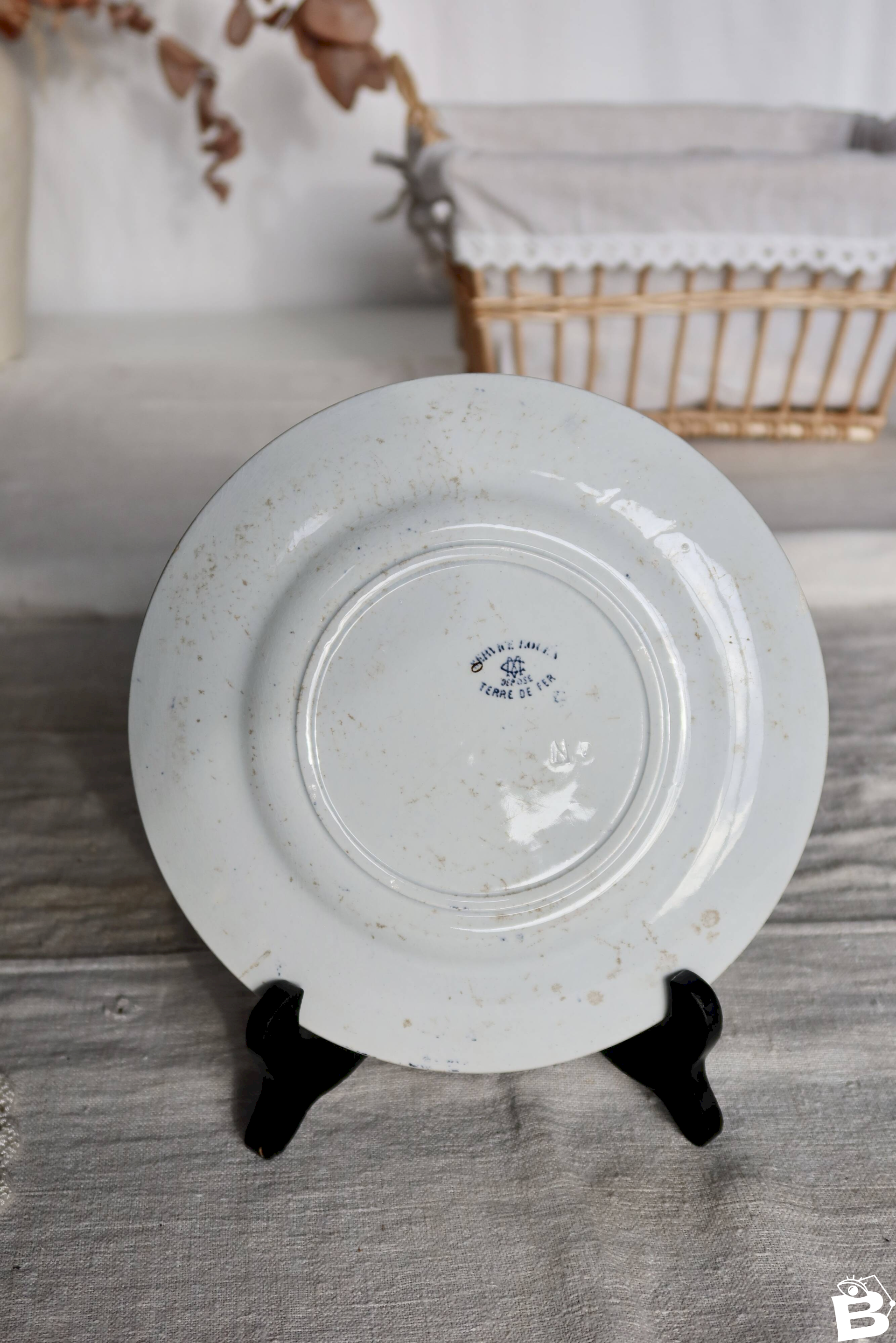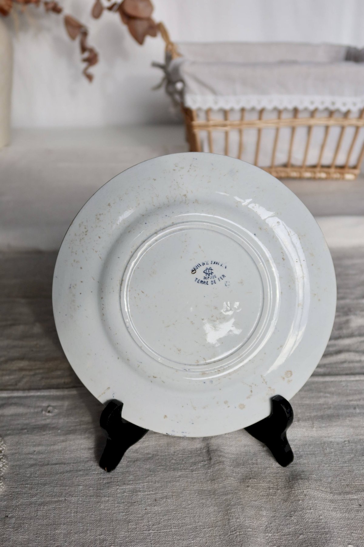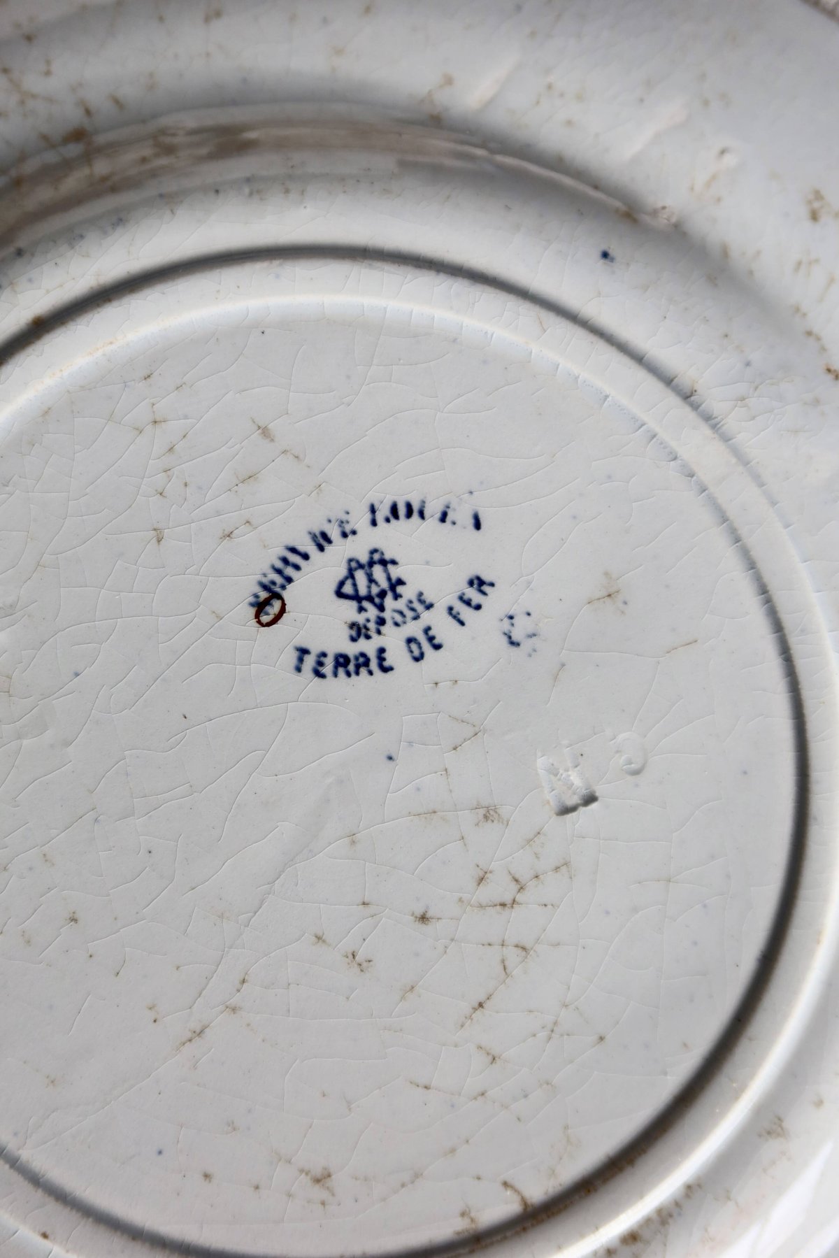 Antique ironstone plate from Creil and Montereau, Rouen service, richly ornamented blue decor in a 17th-century revisited 19th-century style.