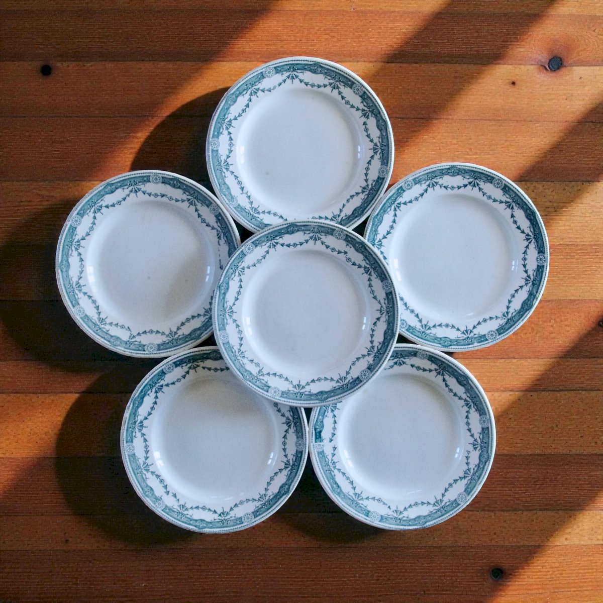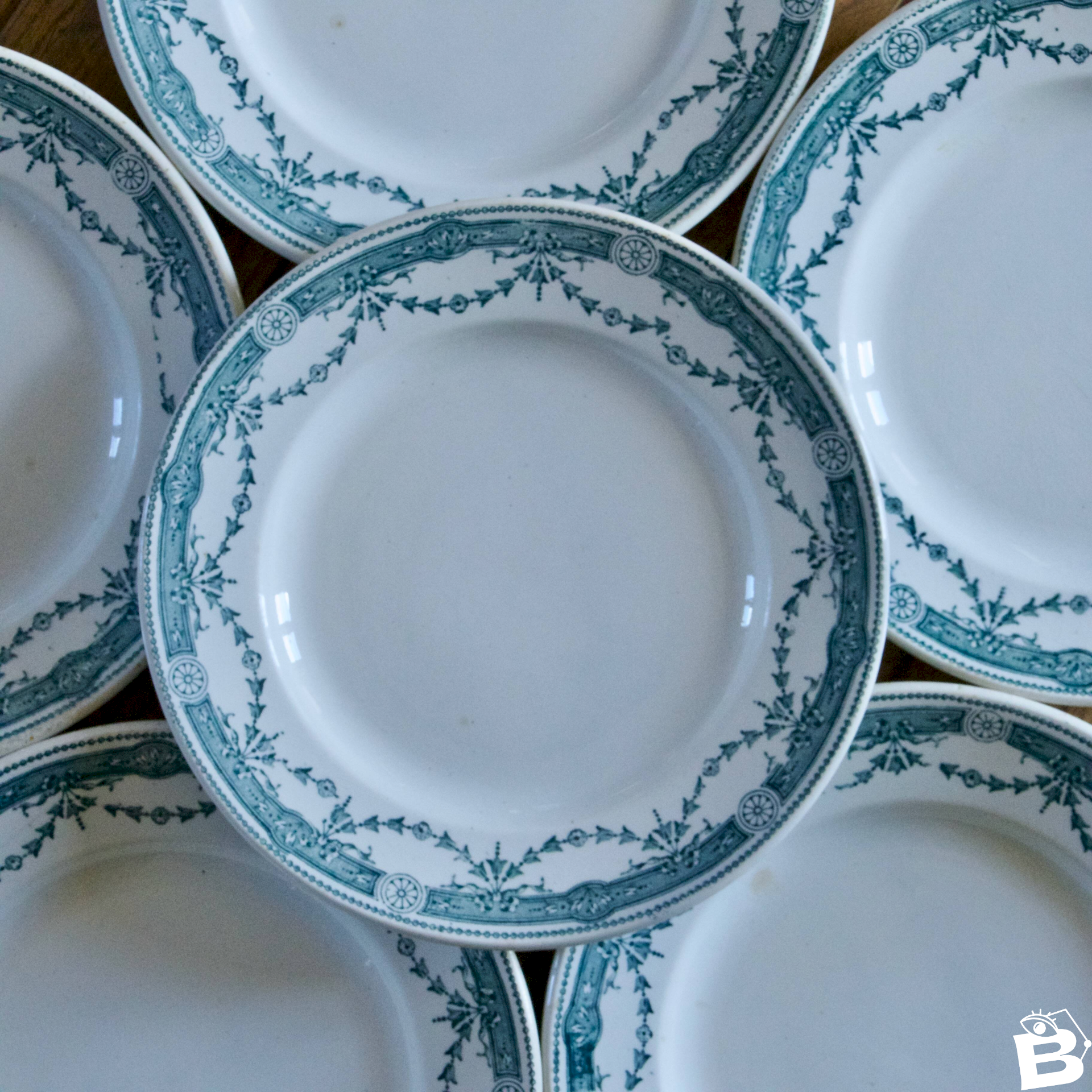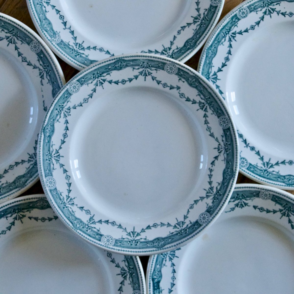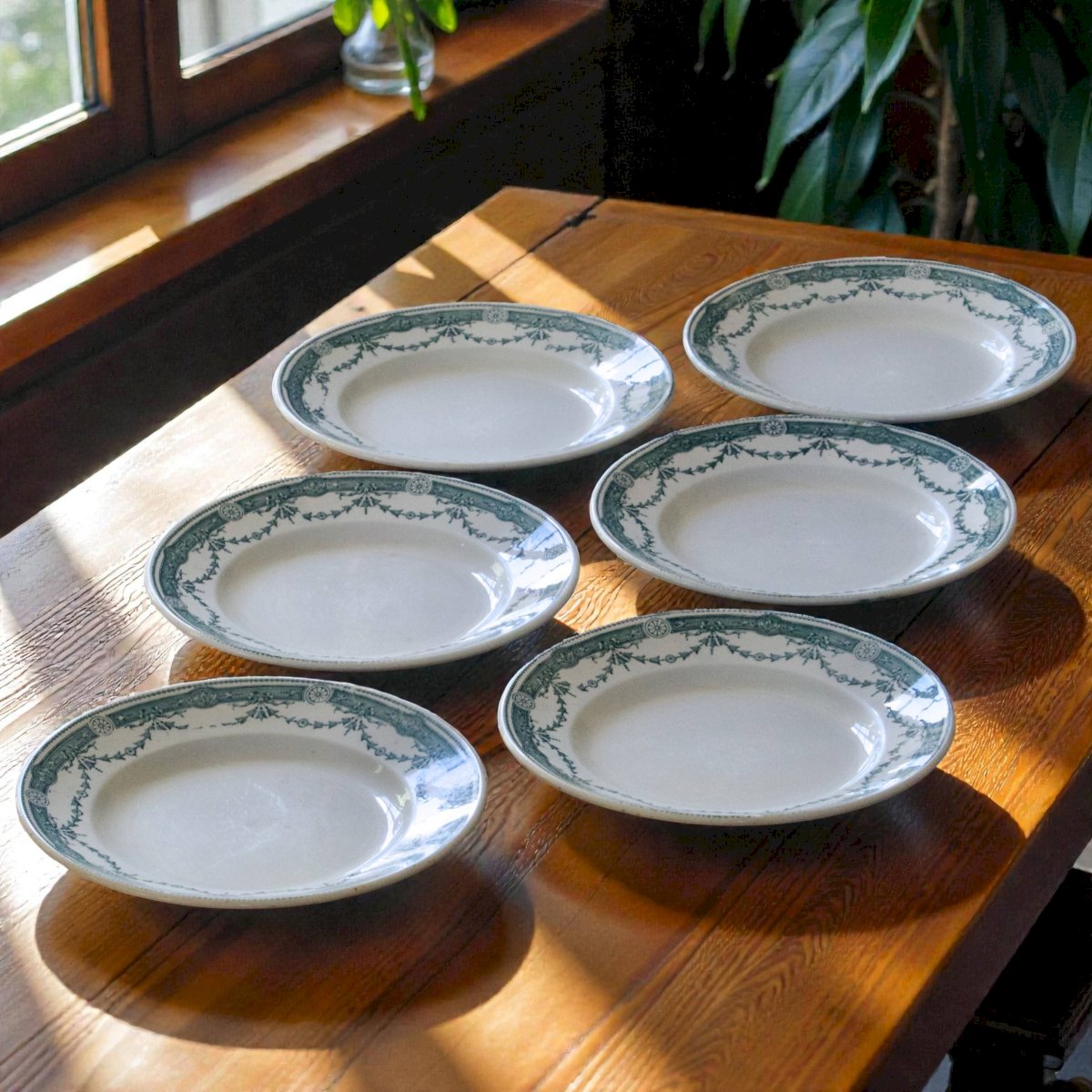 Stunning set of 6 antique plates, ironstone, circa late 19th - early 20th century, stamped Moulin des Loups, "Provence" collection. Beautiful decor with elegance, in shades of blue-green, representing Art Nouveau flower garlands and a classical frieze with Gustavian bows. They are in very good condition, no cracks, no chips, some signs of age. ? 22 cm in diameter. ✨ Very careful shipping. ✨ Professional shop. ✨ You will receive an invoice and have customer service after each purchase. ✨ We have other listings online, feel free to take a look. 01/26. L: 22 l: 22 H: 22