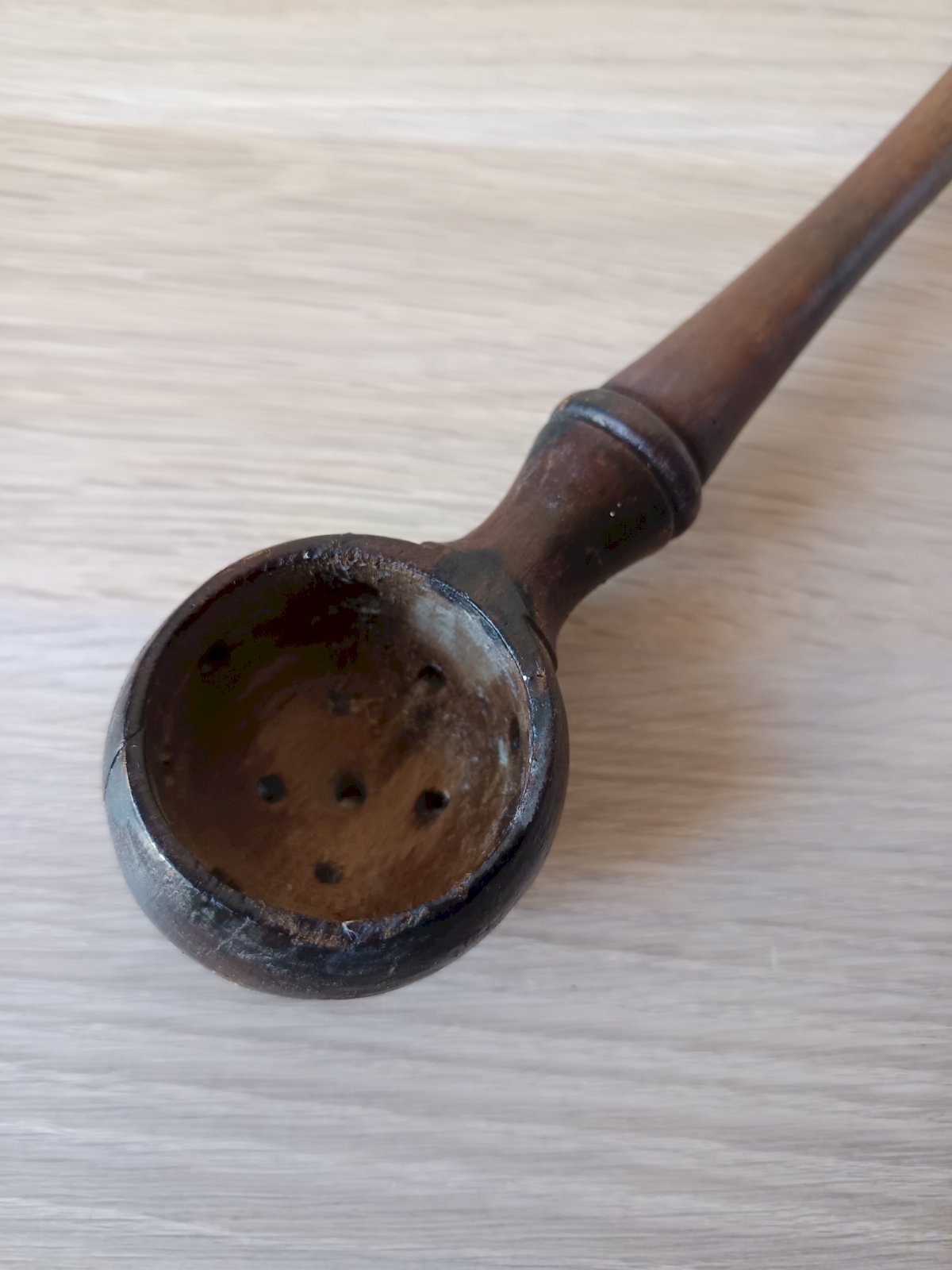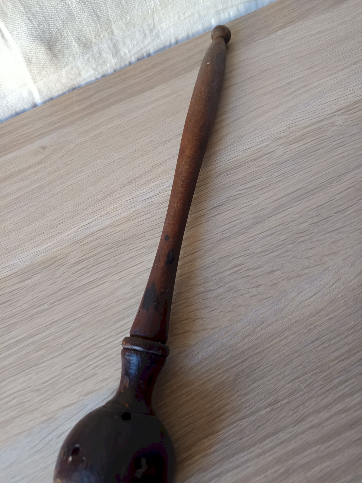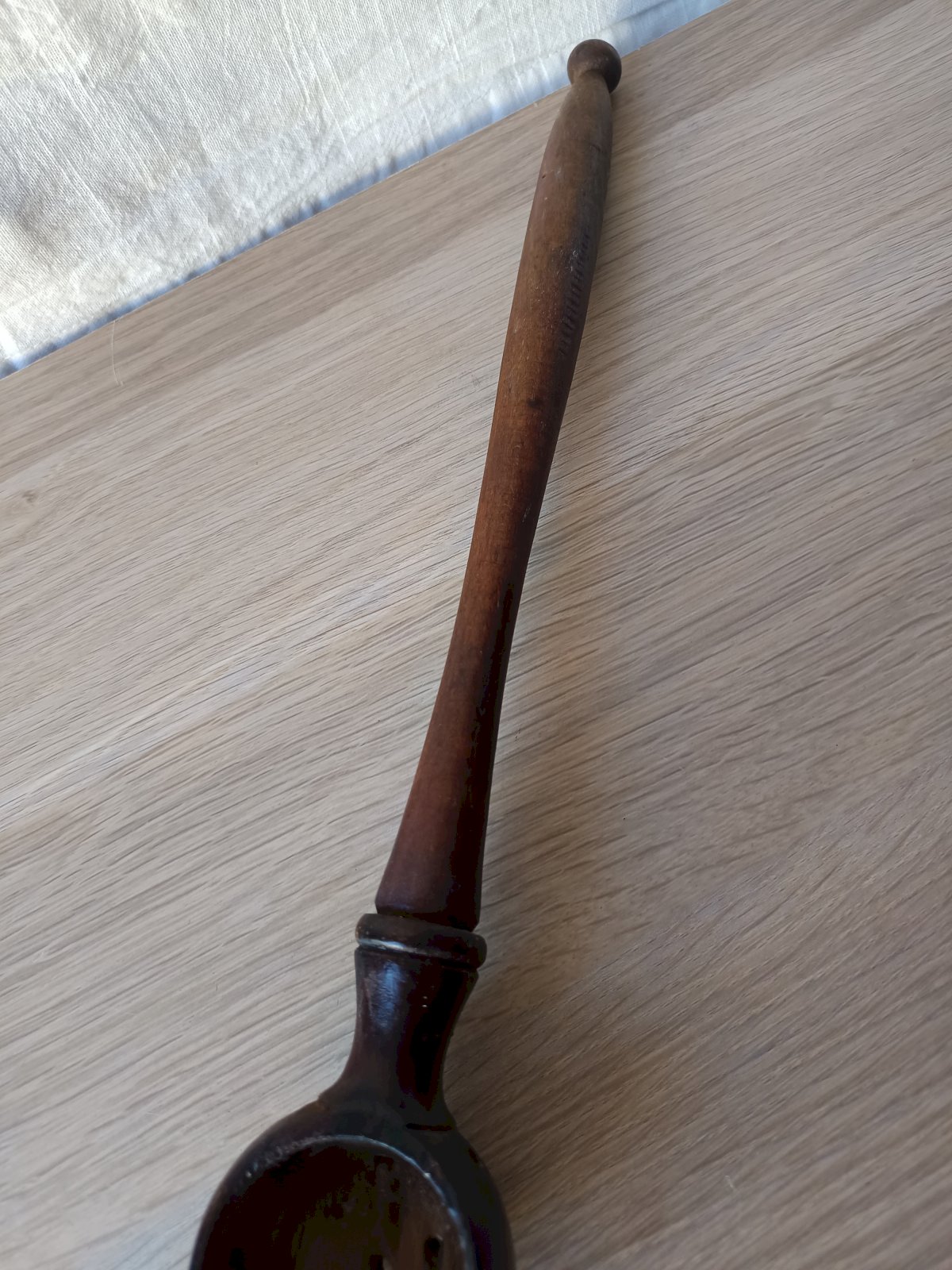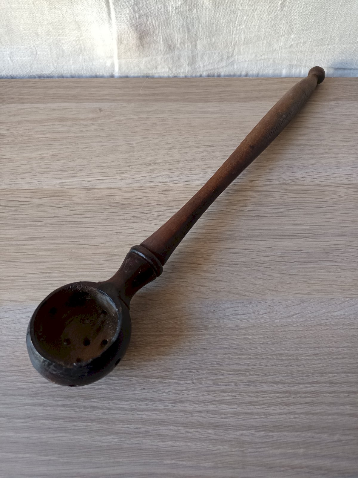 Superb and rare antique slotted spoon/olive spoon, handcrafted from a single piece of wood. With its characteristic perforations and long handle (35 cm), it was essential for serving condiments (olives, pickles) while allowing the brine to drain. A beautiful example of folk art (treenware) or primitive farm tool. A rustic piece full of charm and patina. Ideal for rustic kitchen decoration or antique object collection.