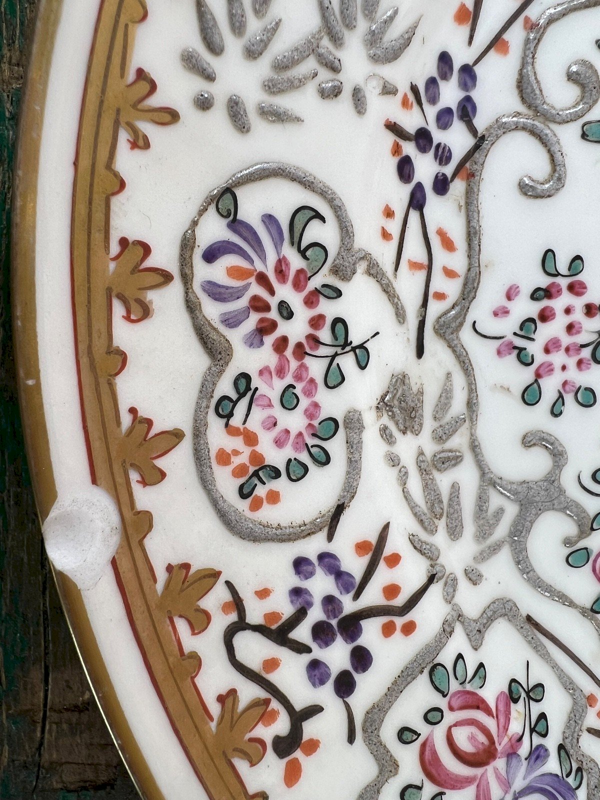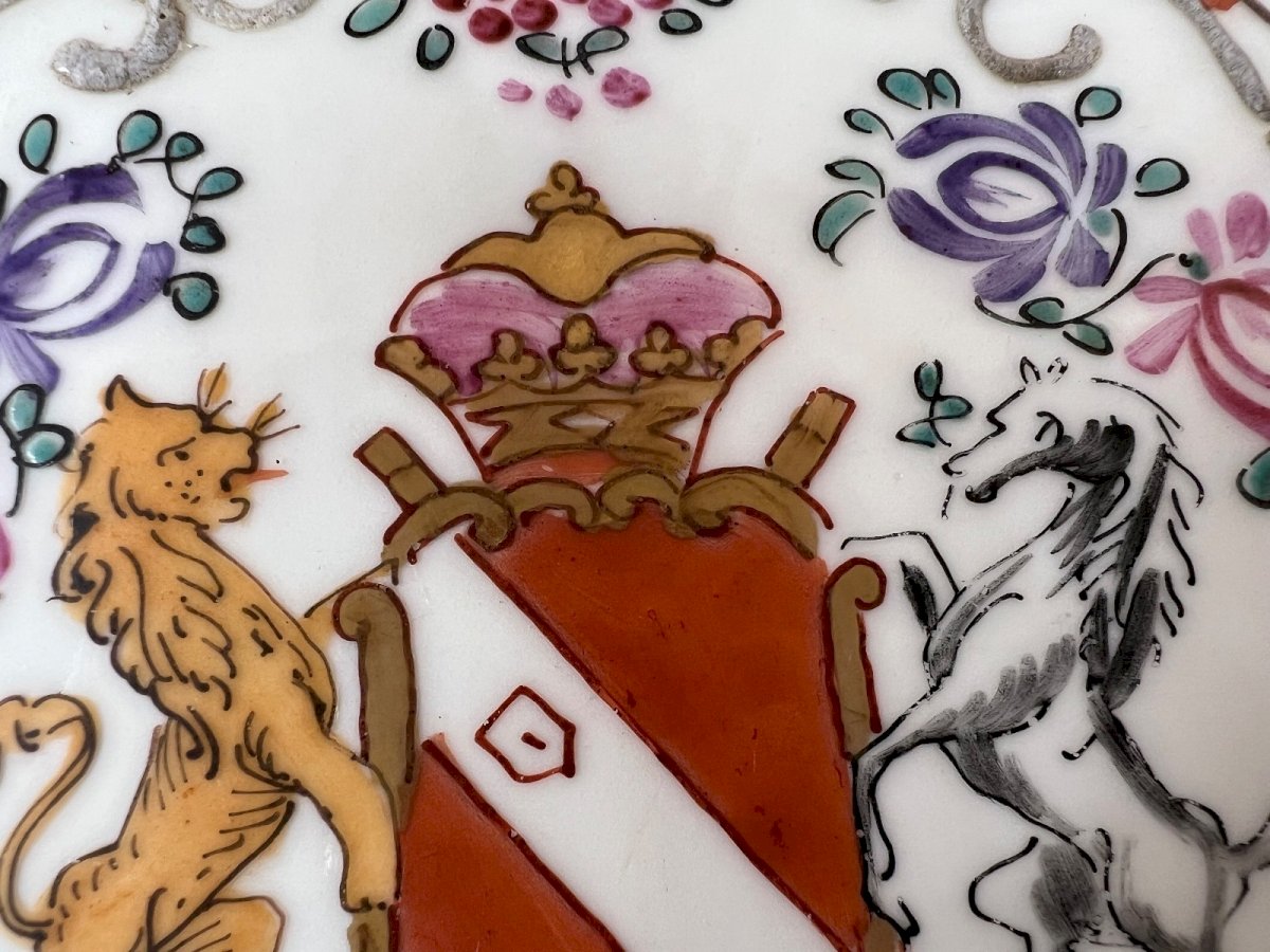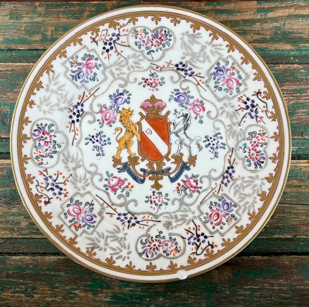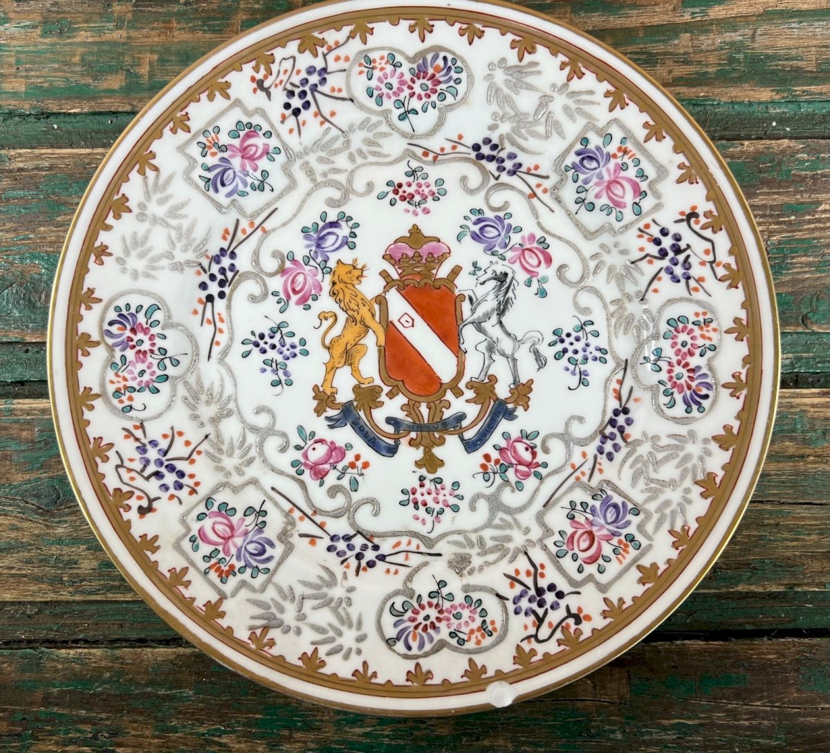 Stunning antique fine porcelain plate, adorned with a noble coat of arms held by a lion and a horse, topped with a crown and accompanied by the Latin motto “Virtus Invicta” — “The unconquered virtue.” The polychrome floral decoration blends roses, vines, and golden scrolls, finely highlighted by hand in the style of European-inspired Japanese porcelain. On the reverse, there is a red signature in Asian characters, typical of Japanese Kutani or Satsuma workshops from the mid-20th century (circa 1950-1970). A decorative piece of great elegance, symbolizing the meeting of refined Orient and European nobility. Dimensions Diameter: 23.8 cm (9.3 in) Overall good condition, a small chip on the edge visible in the photos. Decor and gilding well preserved. Japanese porcelain, Kutani, Satsuma, coat of arms, heraldry, decorative plate, crown, lion, horse, virtue invicta, vintage porcelain plate, Japanese hand-painted, mid-century.
