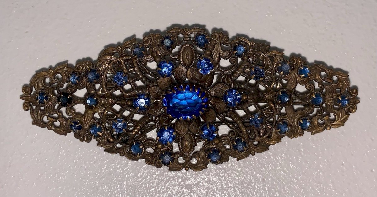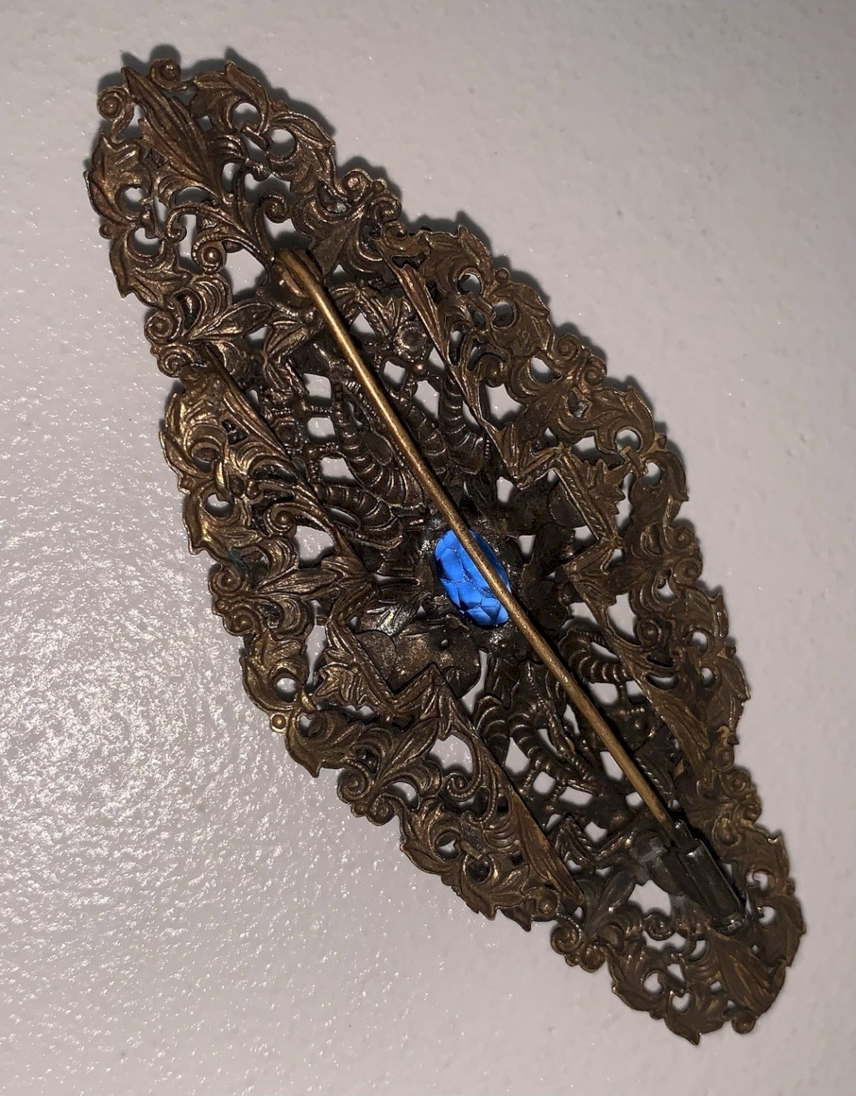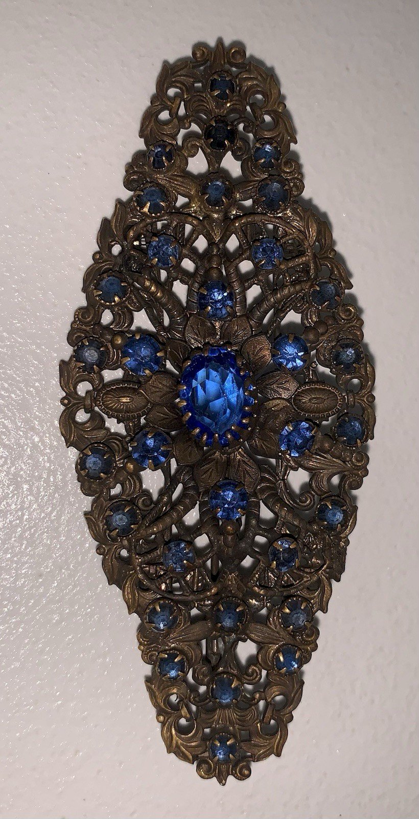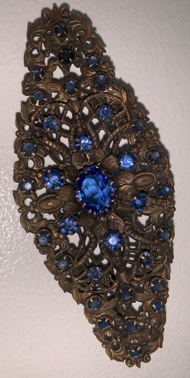 Large Baroque brooch in Bronze and emerald blue rhinestones Period: 19th century Good condition Length: 9.2 cm Width: 4 cm Condition: Pre-owned Item that has been worn. Any imperfections. Dominant stone: rhinestones Type: Brooch Dominant color: Gold Material: bronze Metal: Bronze