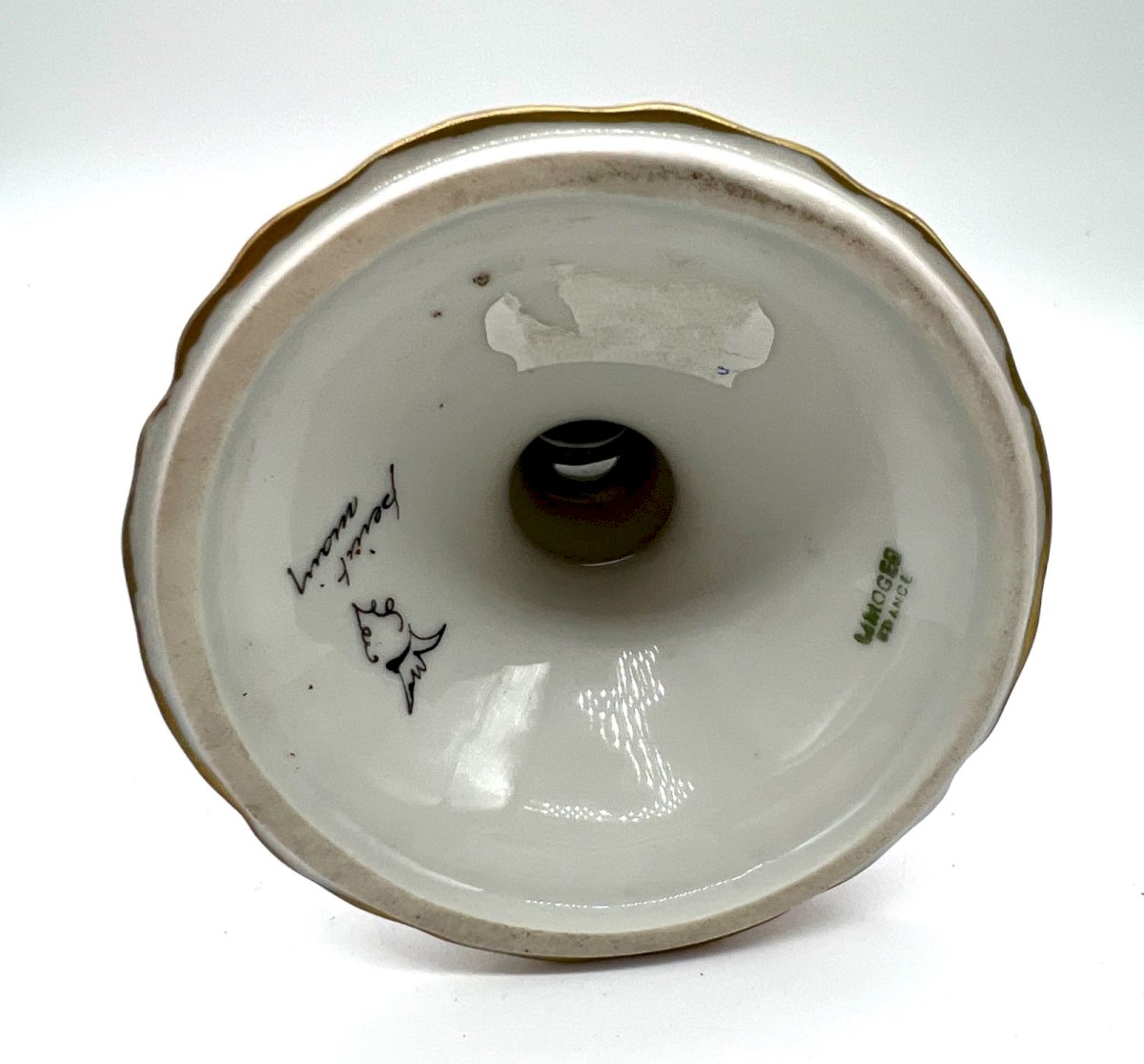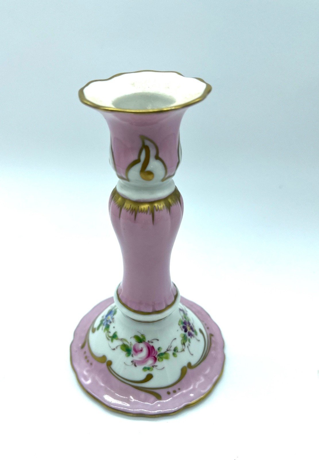 Elegant Limoges porcelain candlestick, signed Jaeger France and marked with a handwritten "hand painted". Refined pink and white decoration enhanced with golden stripes and hand-painted flowers. Beautiful luster of the porcelain, fresh and colorful decor. Dimensions: Height: 17 cm Base: 9.5 cm Condition: Very good overall condition, slight signs of use. Decorative piece ideal for an elegant table or a fine porcelain collection.
