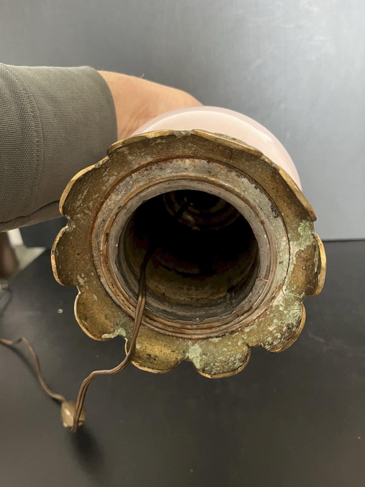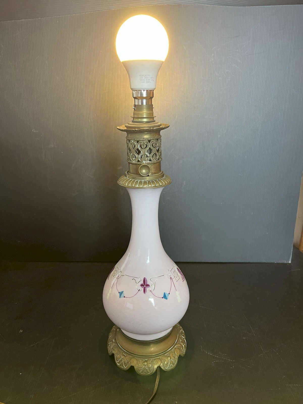 Antique oil lamp that has been electrified; its base is made of bronze, the body is porcelain, and the top is brass. It works but the electrical cable dates back to the 1960s-70s, so it needs to be brought up to code. Generally in good condition, height 37 cm, porcelain body 22 cm, base diameter 12 cm, weight 1250 g. Please see the photos above, which also serve as a description. Carefully packaged and secured with the option to send via post to be selected at the time of purchase for calculating shipping costs. (Otherwise, standard Mondial Relay shipping) Thank you all and happy hunting in my shop. Returns are accepted within 14 days of receipt, in the original packaging, in its initial condition; no refunds for items returned broken or lost by the carrier, return shipping is at the expense of the buyer. Don’t hesitate to add my shop to your favorites! Type: Oil lamp, Petroleum, Gas Period: 19th century and earlier Subtype: Indoor Dominant color: Pink Material: Porcelain Features: Bayonet.