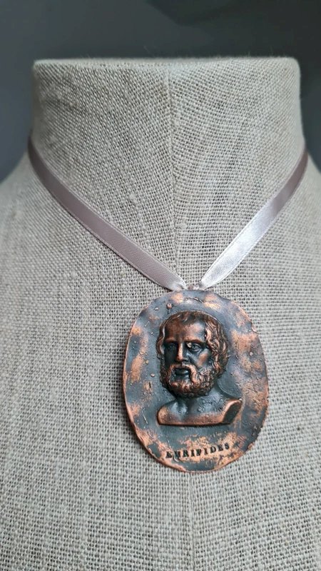 Above €25, please choose a carrier if possible. Take the opportunity to buy in bulk: - 5 items - 10% - 10 items - 20% - 20 items - 30%. Be sure to look at the photos to see the imperfections. Antique copper jewelry (Euripides), Greek writer born around 480 BC in Salamis and died in 406 BC in Macedonia. Dimensions: pendant height: 5 cm, width: 4.1 cm. #antiquemedallion #antiquependant #pendant #antiquejewelry #gift #euripides #oldjewelry #copperjewelry