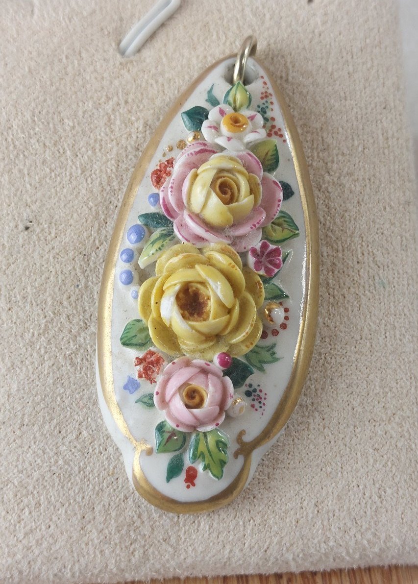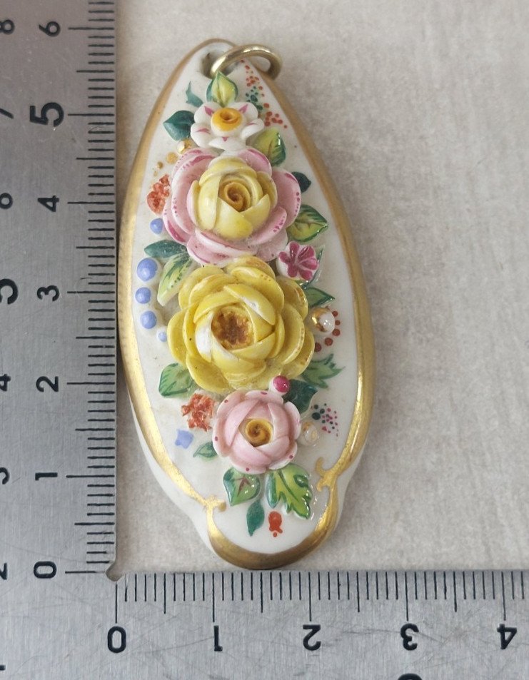 Antique pendant, made of porcelain, with raised flower decoration, Meissen in good condition, 2 small chips on a yellow flower marked Meissen dimensions 5.8 cm X 2.7 cm see photos. Check out my other items! Discount on shipping costs for combined purchases. Condition: Used Item has been worn. possible imperfections. Brand: Meissen Material: Porcelain