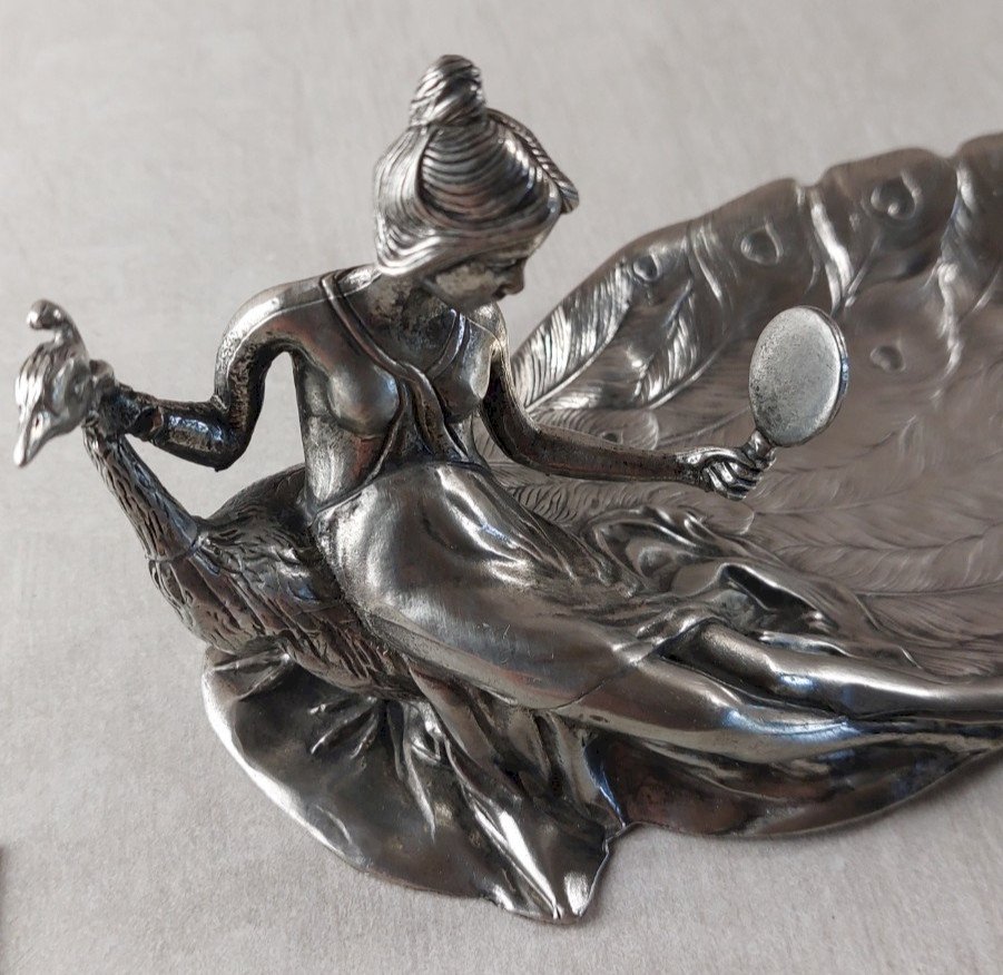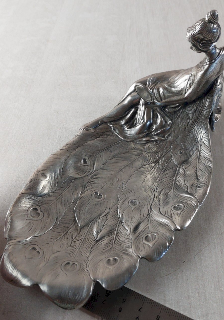 Antique pewter pocket tray / ring holder, featuring a woman at a mirror, St. Lambert pewter in good condition, some marked wear, pewter 95% St. Lambert, handcrafted, fine dimensions 21 cm X 11 cm height 10 cm weight 531 g, see photos. Check out my other items! Shipping cost reduction for bulk purchase. Authenticity: Original Brand: Saint Lambert Material: pewter.