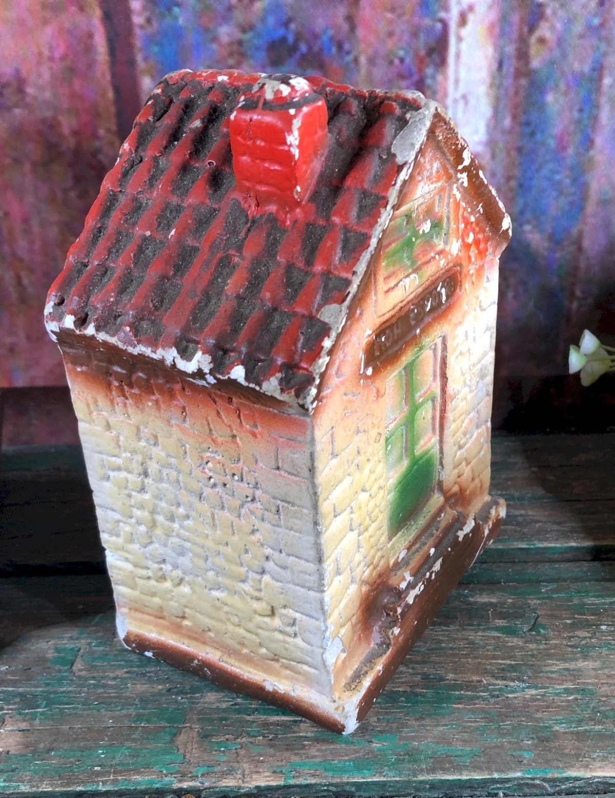 Charming antique piggy bank to be broken made of painted faience and plaster, representing a small house with a red roof and a green door. Above the door, the inscription "To My Hope" recalls the savings of yesteryear, a symbol of promise and patience. Dated from the early 20th century, this piggy bank testifies to a time when people entrusted their savings to small poetic and colorful objects. The slot at the back allowed coins to be slipped in — to open it, one had to break it! Its patina of time, small paint wear, and rustic texture give it all its vintage charm. A decorative object full of tenderness, ideal for a retro interior, a Christmas gift, or to offer as symbolic New Year's gifts. Details: Period: early 20th century Material: faience / painted plaster Dimensions: Height: 14 cm Width: 10 cm Depth: 7 cm Condition: visible patina and wear of time (see photos), overall good condition. antique piggy bank, faience piggy bank, vintage piggy bank, house piggy bank, retro decor, childhood object, breakable piggy bank, 1900 antique, nostalgic decoration, vintage gift. Country of origin: France.